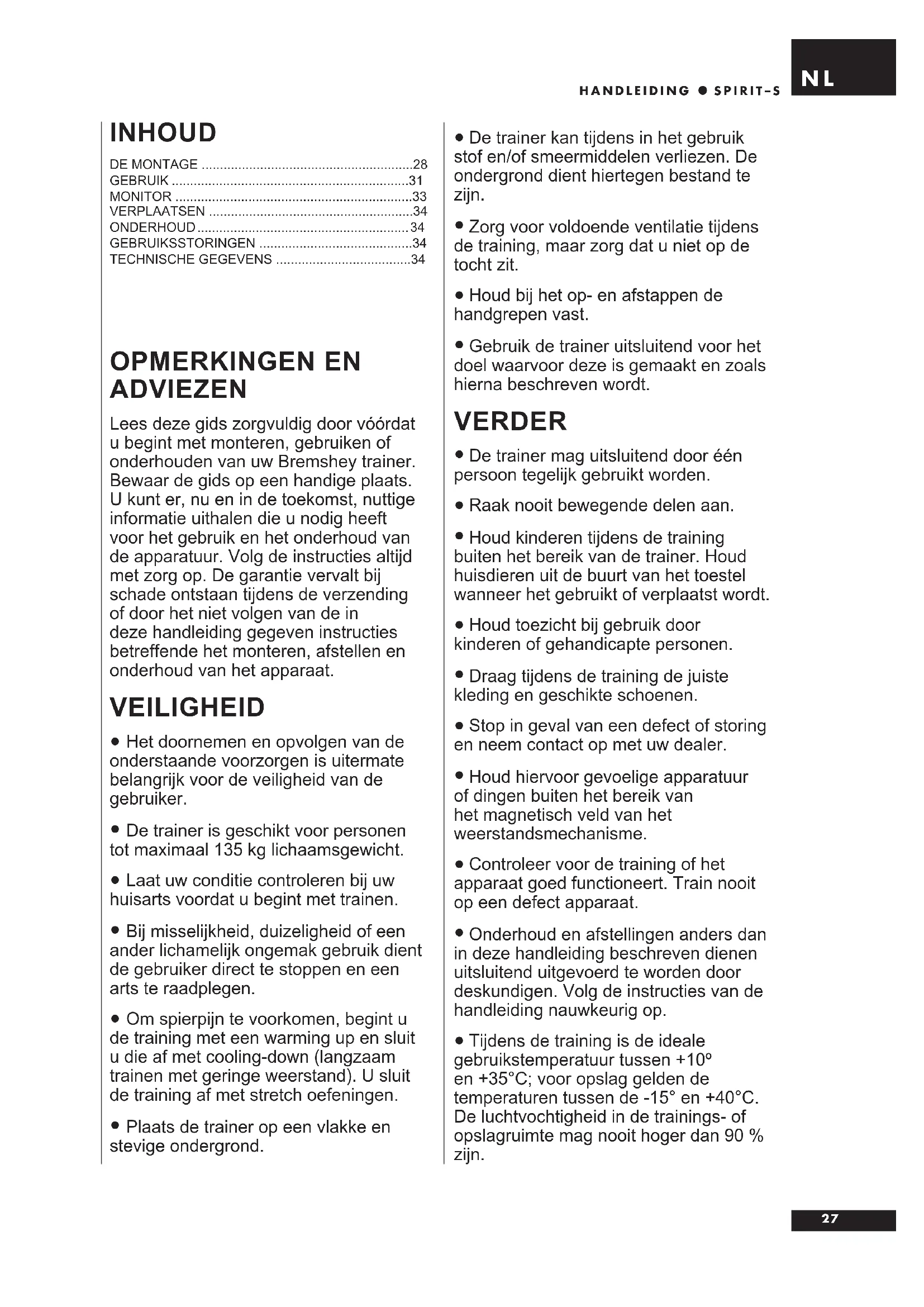 Lees deze gids zorgvuldig door vó Rodrata u begint met monteren, gelebruiken of onderhonden van uw Bremshey trainer. Bewaar de gids op een handige plaats. U kunt er, nu en in de toekomst, nuttige informatatie uithalen die u nodig heeft voor het gebruik en het onderhoud van de apparatuur. Volg de instructies.altijd met zorg op. De garantie verralt bij schade ontstaanijdens de verzending of door het Niet volgen van de in deze handleiding gegeven instructies betreffende het monteren, afstellen en onderhoud van het apparaat.