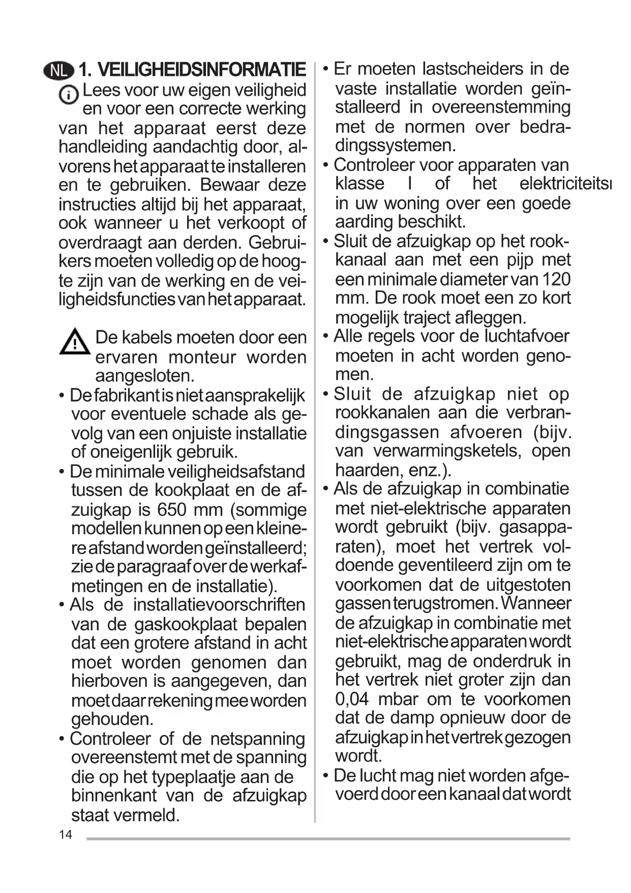 - Gebruik de afzuigkap nooit voor andere doeleinden dan waarvoor hij bedoeld is.