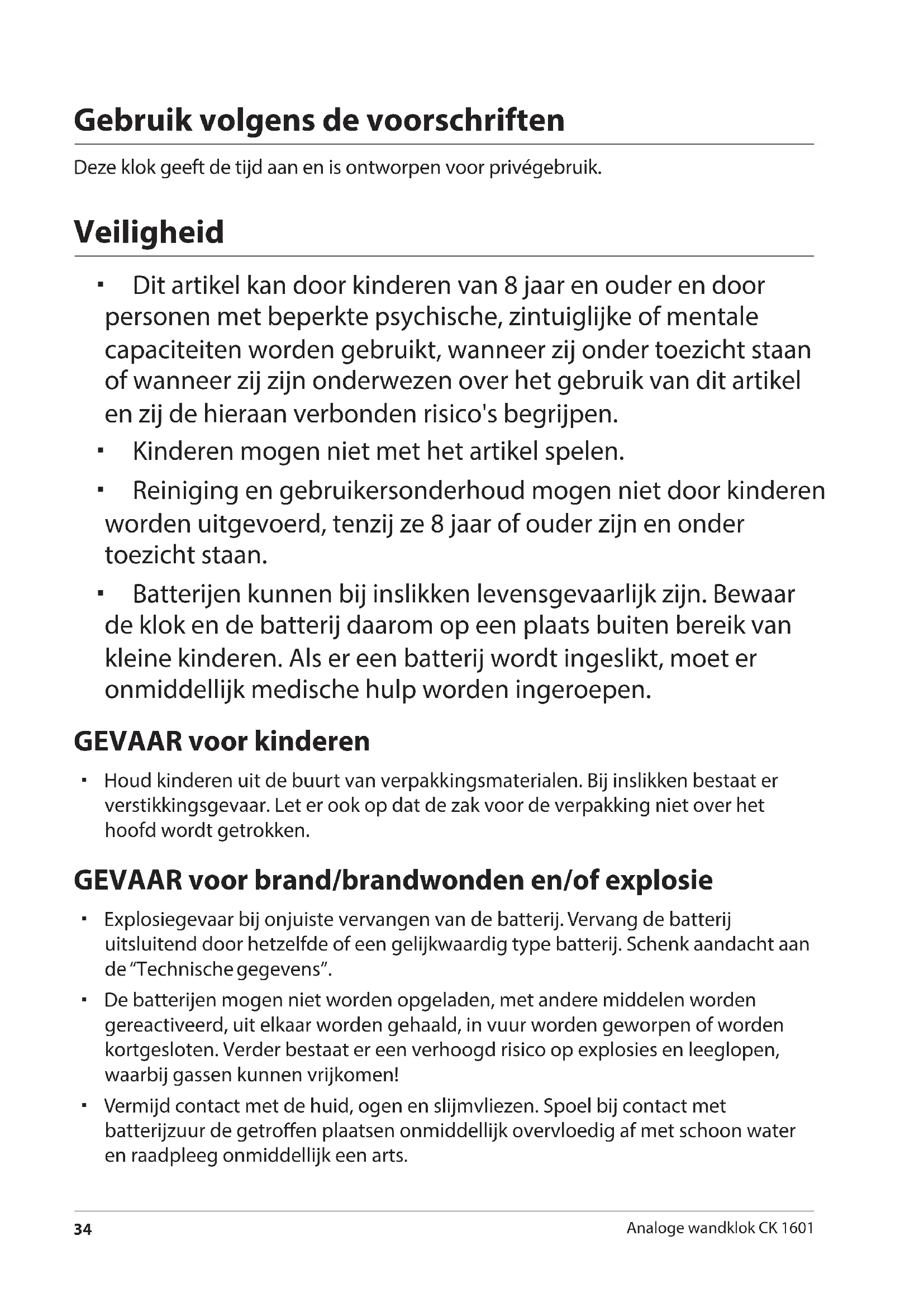 - Batterijen kunnen bij inslikken levensgevaarlijk zijn. Bewaar de klok en de batterij daarom op een plaats buiten bereik van kleine kinderen. Als er een batterij wordt ingeslikt, moet er onmiddellijk medische hulp worden ingeroepen.