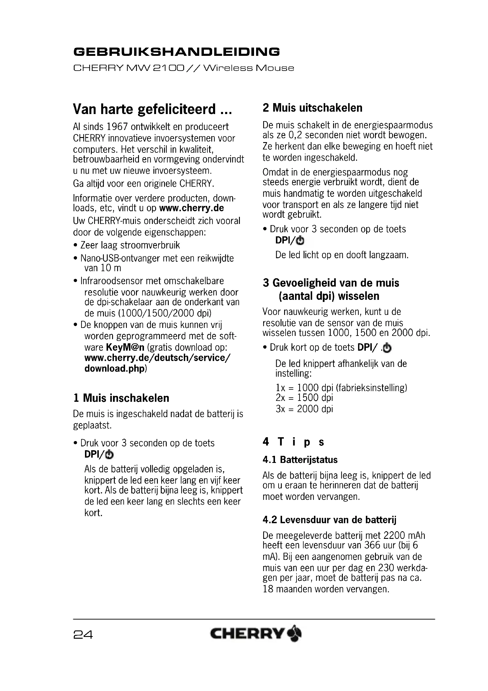 - Neem regelmatig een andere lic- haamshouding aan.16 Van harte proficiat ... Al sinds 1967 ontwikkelt en produceert CHERRY innovatieve invoersystemen voor computers. Het verschil in kwaliteit, betrouwbaarheid en vormgeving onder- vindt u nu met uw nieuwe invoersysteem. Ga altijd voor een originele CHERRY. Informatie over verdere producten, down- loads, etc, vindt u op www.cherry.de Uw CHERRY-muis onderscheidt zich vooral door de volgende eigenschappen: