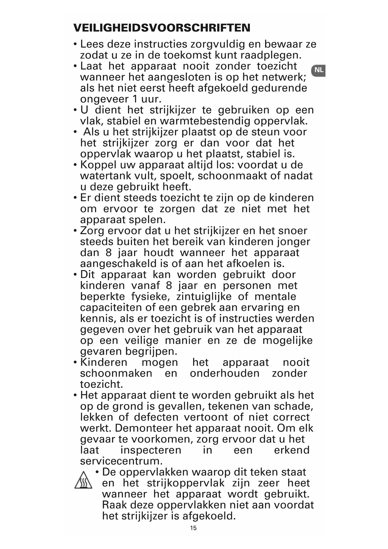 - Dit apparaat kan worden gebruikt door kinderen vanaf 8 jaar en personen met beperkte fysieke, zintuiglijke of mentale capaciteiten of een gebrek aan ervaring en kennis, als er toezicht is of instructies werden gegeven over het gebruik van het apparaat op een veilige manier en ze de mogelijke gevaren begrijpen.