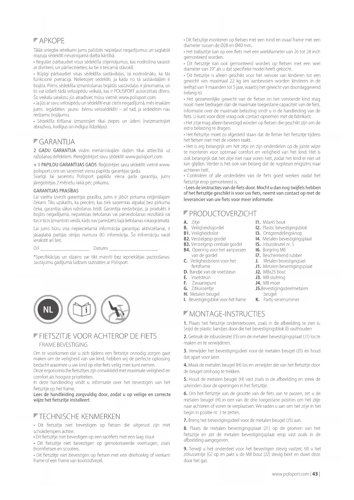2 JAAR GARANTIE: alleen op de mechanische onderdelen in het geval van fabricagefouten. Registreer uw fietszitje op www.polisport.com.