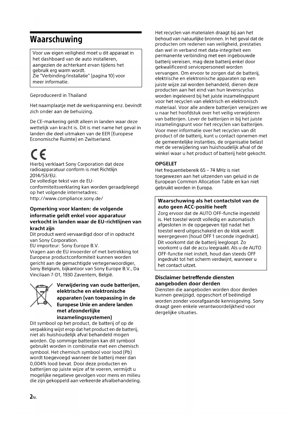 Al salpicadero/consola centralElementos incluidos con su vehículo SoporteSoporte Fusible (10 A)2NL Waarschuwing Geproduceerd in Thailand Het naamplaatje met de werkspanning enz. bevindt zich onder aan de behuizing. De CE-markering geldt alleen in landen waar deze wettelijk van kracht is. Dit is met name het geval in landen die deel uitmaken van de EER (Europese Economische Ruimte) en Zwitserland. Hierbij verklaart Sony Corporation dat deze radioapparatuur conform is met Richtlijn 2014/53/EU. De volledige tekst van de EU- conformiteitsverklaring kan worden geraadpleegd op het volgende internetadres: http://www.compliance.sony.de/ Opmerking voor klanten: de volgende informatie geldt enkel voor apparatuur verkocht in landen waar de EU-richtlijnen van kracht zijn Dit product werd vervaardigd door of in opdracht van Sony Corporation. EU importeur: Sony Europe B.V. Vragen aan de EU invoerder of met betrekking tot Europese productconformiteit kunnen worden gericht aan de gemachtigde vertegenwoordiger, Sony Belgium, bijkantoor van Sony Europe B.V., Da Vincilaan 7-D1, 1930 Zaventem, België. Verwijdering van oude batterijen, elektrische en elektronische apparaten (van toepassing in de Europese Unie en andere landen met afzonderlijke inzamelingssystemen) Dit symbool op het product, de batterij of op de verpakking wijst erop dat het product en de batterij, niet als huishoudelijk afval behandeld mogen worden. Op sommige batterijen kan dit symbool gebruikt worden in combinatie met een chemisch symbool. Het chemisch symbool voor lood (Pb) wordt toegevoegd wanneer de batterij meer dan 0,004% lood bevat. Door deze producten en batterijen op juiste wijze af te voeren, vermijdt u mogelijke negatieve gevolgen voor mens en milieu die zijn gekoppeld aan verkeerde afvalbehandeling. Het recyclen van materialen draagt bij aan het behoud van natuurlijke bronnen. In het geval dat de producten om redenen van veiligheid, prestaties dan wel in verband met data-integriteit een permanente verbinding met een ingebouwde batterij vereisen, mag deze batterij enkel door gekwalificeerd servicepersoneel worden vervangen. Om ervoor te zorgen dat de batterij, elektrische en elektronische apparaten op een juiste wijze zal worden behandeld, dienen deze producten aan het eind van hun levenscyclus worden ingeleverd bij het juiste inzamelingspunt voor het recyclen van elektrisch en elektronisch materiaal. Voor alle andere batterijen verwijzen we u naar het hoofdstuk over het veilig verwijderen van batterijen. Lever de batterijen in bij het juiste inzamelingspunt voor het recyclen van batterijen. Voor meer informatie over het recyclen van dit product of de batterij, kunt u contact opnemen met de gemeentelijke instanties, de organisatie belast met de verwijdering van huishoudelijk afval of de winkel waar u het product of batterij hebt gekocht. OPGELET Het frequentiebereik 65 – 74 MHz is niet toegewezen aan het uitzenden van geluid in de European Common Allocation Table en kan niet gebruikt worden in Europa. Disclaimer betreffende diensten aangeboden door derden Diensten die aangeboden worden door derden kunnen gewijzigd, opgeschort of beëindigd worden zonder voorafgaande kennisgeving. Sony draagt geen enkele verantwoordelijkheid voor dergelijke situaties. Voor uw eigen veiligheid moet u dit apparaat in het dashboard van de auto installeren, aangezien de achterkant ervan tijdens het gebruik erg warm wordt. Zie "Verbinding/installatie" (pagina 10) voor meer informatie. Waarschuwing als het contactslot van de auto geen ACC-positie heeft Zorg ervoor dat de AUTO OFF-functie ingesteld is. Het toestel wordt volledig en automatisch afgesloten in de opgegeven tijd nadat het toestel werd uitgeschakeld en de klok wordt weergegeven (houd OFF 1 seconde ingedrukt). Dit voorkomt dat de batterij leegloopt. Zo voorkomt u dat de accu leegraakt. Als u de AUTO OFF-functie niet instelt, houd dan steeds OFF ingedrukt tot het scherm verdwijnt, wanneer u het contact uitzet.3NL Opgelet