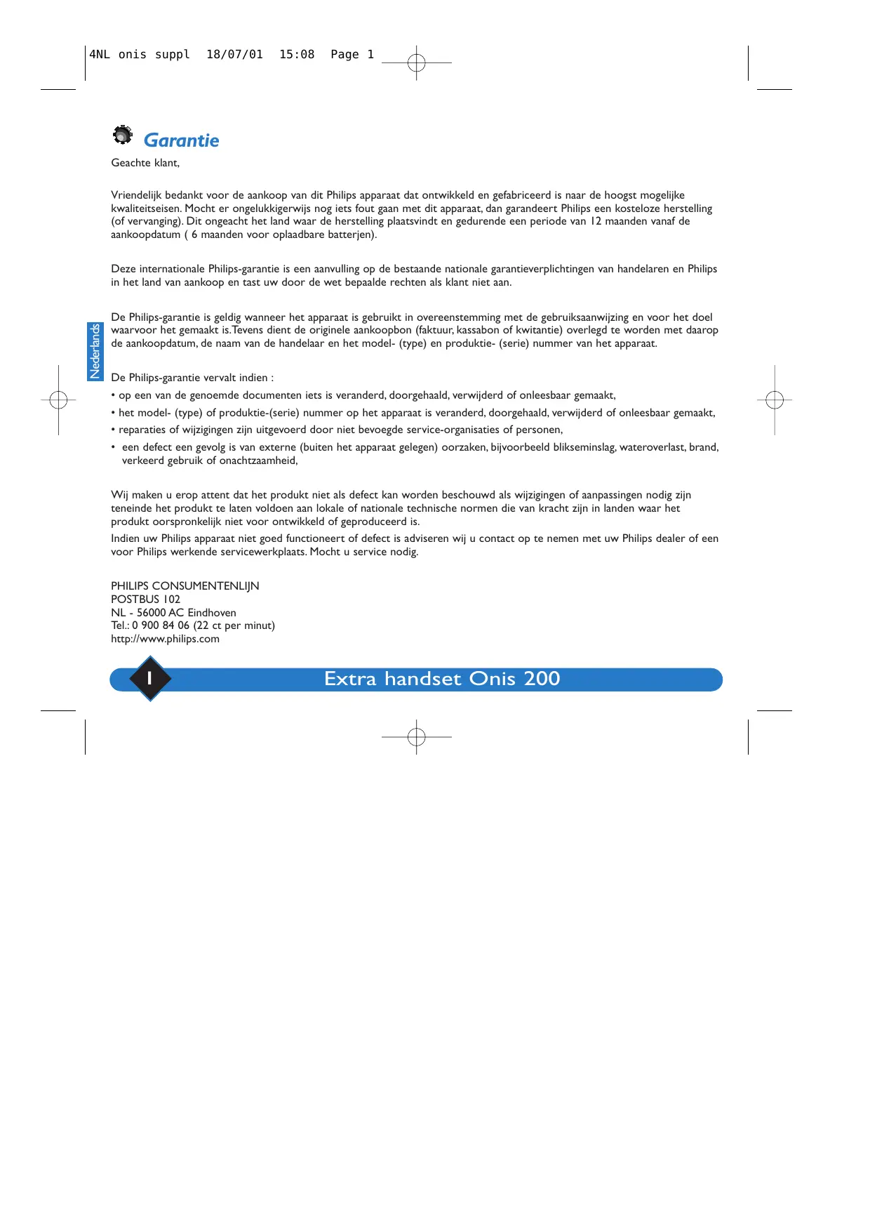 Deutsch PROBLEME 4NL onis suppl 18/07/01 15:08 Page 1 Garantie Geachte klant, Vriendelijk bedankt voor de aankoop van dit Philips apparaat dat ontwikkeld en gefabriceerd is naar de hoogst mogelijke kwaliteitseisen. Mocht er ongelukkigerwijs nog iets fout gaan met dit apparaat, dan garandeert Philips een kosteloze herstelling (of vervanging). Dit ongeacht het land waar de herstelling plaatsvindt en gedurende een periode van 12 maanden vanaf de aankoopdatum ( 6 maanden voor oplaadbare batterjen). Nederlands Deze internationale Philips-garantie is een aanvulling op de bestaande nationale garantieverplichtingen van handelaren en Philips in het land van aankoop en tast uw door de wet bepaalde rechten als klant niet aan. De Philips-garantie is geldig wanneer het apparaat is gebruikt in overeenstemming met de gebruiksaanwijzing en voor het doel waarvoor het gemaakt is.Tevens dient de originele aankoopbon (faktuur, kassabon of kwitantie) overlegd te worden met daarop de aankoopdatum, de naam van de handelaar en het model- (type) en produktie- (serie) nummer van het apparaat. De Philips-garantie vervalt indien :