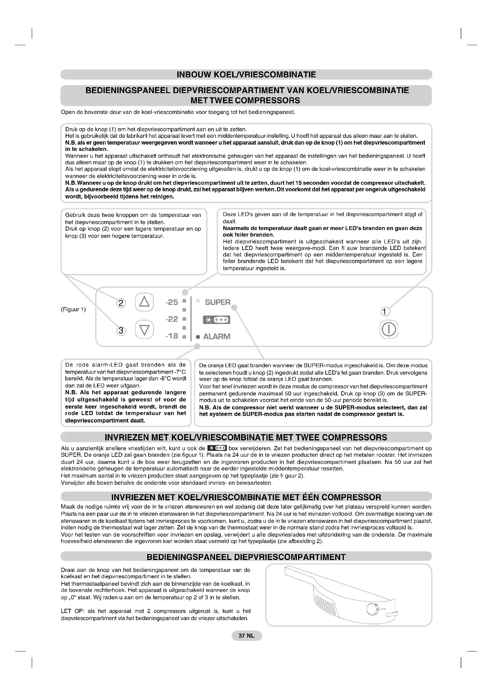 INVRIEZEN MET KOEL/VRIESCOMBINATIE MET TWEE COMPRESSORS Als u aanzienlijk snellere vriestijden wilt, kunt u ook de box verwijderen. Zet het bedieningspaneel van het diepvriescompartiment op SUPER. De oranje LED zal gaan branden (zie fi guur 1). Plaats na 24 uur de in te vriezen producten direct op het metalen rooster. Het invriezen duurt 24 uur, daarna kunt u de box weer terugzetten en de ingevroren producten in het diepvriescompartiment plaatsen. Na 50 uur zal het elektronische geheugen de temperatuur automatisch naar de eerder ingestelde middentemperatuur resetten. Het maximum aantal in te vriezen producten staat aangegeven op het typeplaatje (zie fi guur 2). Verwijder alle boxen behalve de onderste voor standaard invries- en bewaartesten. BEDIENINGSPANEEL DIEPVRIESCOMPARTIMENT Draai aan de knop van het bedieningspaneel om de temperatuur van de koelkast en het diepvriescompartiment in te stellen. Het thermostaatpaneel bevindt zich aan de binnenzijde van de koelkast, in de bovenste rechterhoek. Het apparaat is uitgeschakeld wanneer de knop op „0“ staat. Wij raden u aan om de temperatuur op 2 of 3 in te stellen. LET OP: als het apparaat met 2 compressors uitgerust is, kunt u het diepvriescompartiment via het bedieningspaneel van de vriezer uitschakelen. Gebruik deze twee knoppen om de temperatuur van het diepvriescompartiment in te stellen. Druk op knop (2) voor een lagere temperatuur en op knop (3) voor een hogere temperatuur. De rode alarm-LED gaat branden als de temperatuur van het diepvriescompartiment -7°C bereikt. Als de temperatuur lager dan -8°C wordt dan zal de LED weer uitgaan. N.B. Als het apparaat gedurende langere tijd uitgeschakeld is geweest of voor de eerste keer ingeschakeld wordt, brandt de rode LED totdat de temperatuur van het diepvriescompartiment daalt. De oranje LED gaat branden wanneer de SUPER-modus ingeschakeld is. Om deze modus te selecteren houdt u knop (2) ingedrukt zodat alle LED's fel gaan branden. Druk vervolgens weer op de knop totdat de oranje LED gaat branden. Voor het snel invriezen wordt in deze modus de compressor van het diepvriescompartiment permanent gedurende maximaal 50 uur ingeschakeld. Druk op knop (3) om de SUPER- modus uit te schakelen voordat het einde van de 50-uur periode bereikt is. N.B. Als de compressor niet werkt wanneer u de SUPER-modus selecteert, dan zal het systeem de SUPER-modus pas starten nadat de compressor gestart is. 37 NL Deze LED's geven aan of de temperatuur in het diepvriescompartiment stijgt of daalt. Naarmate de temperatuur daalt gaan er meer LED's branden en gaan deze ook feller branden. Het diepvriescompartiment is uitgeschakeld wanneer alle LED's uit zijn. Iedere LED heeft twee weergave-modi. Een fl auw brandende LED betekent dat het diepvriescompartiment op een middentemperatuur ingesteld is. Een feller brandende LED betekent dat het diepvriescompartiment op een lagere temperatuur ingesteld is. Druk op de knop (1) om het diepvriescompartiment aan en uit te zetten. Het is gebruikelijk dat de fabrikant het apparaat levert met een middentemperatuur-instelling. U hoeft het apparaat dus alleen maar aan te sluiten. N.B. als er geen temperatuur weergegeven wordt wanneer u het apparaat aansluit, druk dan op de knop (1) om het diepvriescompartiment in te schakelen. Wanneer u het apparaat uitschakelt onthoudt het elektronische geheugen van het apparaat de instellingen van het bedieningspaneel. U hoeft dus alleen maar op de knop (1) te drukken om het diepvriescompartiment weer in te schakelen. Als het apparaat stopt omdat de elektriciteitsvoorziening uitgevallen is, drukt u op de knop (1) om de koel-vriescombinatie weer in te schakelen wanneer de elektriciteitsvoorziening weer in orde is. N.B. Wanneer u op de knop drukt om het diepvriescompartiment uit te zetten, duurt het 15 seconden voordat de compressor uitschakelt. Als u gedurende deze tijd weer op de knop drukt, zal het apparaat blijven werken. Dit voorkomt dat het apparaat per ongeluk uitgeschakeld wordt, bijvoorbeeld tijdens het reinigen.