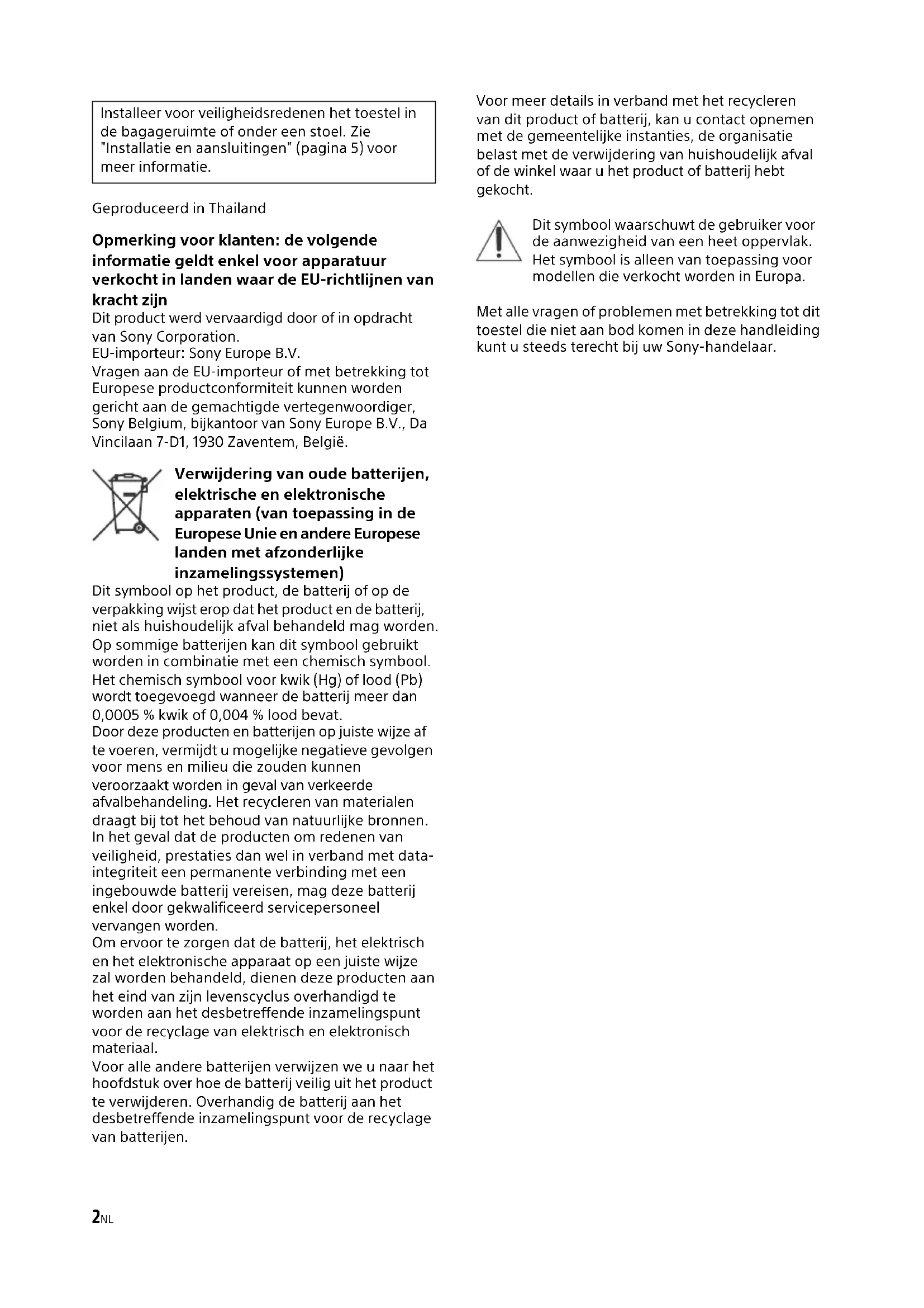 llegare in modo saldo il cavo di messa a terra a un punto metall ico dell’auto. I cavi negativi del diffusore sono in contatto con il telaio dell’auto. Allontanare i cavi dal telaio dell’auto. L’audio risulta attutito. L’interruttore del filtro è impostato su “HP” oppure “OFF”. Durante il collegamento con il subwoofer, impost are su “LP”. L’interruttore del filtro è impostato su “LP”. Durante il collegamento del diffusore a gamma completa , impostare su “OFF” oppure “HP”. L’audio è eccessivamente basso. Il comando di regolazione LEVEL non è impostato correttamente. Ruotare il comando di regolazione LEVEL in senso orario. Se le soluzioni riportate non risolvono il problema, rivolg ersi al più vicino rivenditore Sony.2NL Geproduceerd in Thailand Opmerking voor klanten: de volgende informatie geldt enkel voor apparatuur verkocht in landen waar de EU-richtlijnen van kracht zijn Dit product werd vervaardigd door of in opdracht van Sony Corporation. EU-importeur: Sony Europe B.V. Vragen aan de EU-importeur of met betrekking tot Europese productconformiteit kunnen worden gericht aan de gemachtigde vertegenwoordiger, Sony Belgium, bijkantoor van Sony Europe B.V., Da Vincilaan 7-D1, 1930 Zaventem, België. Verwijdering van oude batterijen, elektrische en elektronische apparaten (van toepassing in de Europese Unie en andere Europese landen met afzonderlijke inzamelingssystemen) Dit symbool op het product, de batterij of op de verpakking wijst erop dat het product en de batterij, niet als huishoudelijk afval behandeld mag worden. Op sommige batterijen kan dit symbool gebruikt worden in combinatie met een chemisch symbool. Het chemisch symbool voor kwik (Hg) of lood (Pb) wordt toegevoegd wanneer de batterij meer dan 0,0005 % kwik of 0,004 % lood bevat. Door deze producten en batterijen op juiste wijze af te voeren, vermijdt u mogelijke negatieve gevolgen voor mens en milieu die zouden kunnen veroorzaakt worden in geval van verkeerde afvalbehandeling. Het recycleren van materialen draagt bij tot het behoud van natuurlijke bronnen. In het geval dat de producten om redenen van veiligheid, prestaties dan wel in verband met data- integriteit een permanente verbinding met een ingebouwde batterij vereisen, mag deze batterij enkel door gekwalificeerd servicepersoneel vervangen worden. Om ervoor te zorgen dat de batterij, het elektrisch en het elektronische apparaat op een juiste wijze zal worden behandeld, dienen deze producten aan het eind van zijn levenscyclus overhandigd te worden aan het desbetreffende inzamelingspunt voor de recyclage van elektrisch en elektronisch materiaal. Voor alle andere batterijen verwijzen we u naar het hoofdstuk over hoe de batterij veilig uit het product te verwijderen. Overhandig de batterij aan het desbetreffende inzamelingspunt voor de recyclage van batterijen. Voor meer details in verband met het recycleren van dit product of batterij, kan u contact opnemen met de gemeentelijke instanties, de organisatie belast met de verwijdering van huishoudelijk afval of de winkel waar u het product of batterij hebt gekocht. Dit symbool waarschuwt de gebruiker voor de aanwezigheid van een heet oppervlak. Het symbool is alleen van toepassing voor modellen die verkocht worden in Europa. Met alle vragen of problemen met betrekking tot dit toestel die niet aan bod komen in deze handleiding kunt u steeds terecht bij uw Sony-handelaar. Installeer voor veiligheidsredenen het toestel in de bagageruimte of onder een stoel. Zie "Installatie en aansluitingen" (pagina 5) voor meer informatie.3NL Kenmerken Maximaal uitgangsvermogen van 150 W per kanaal (bij 4 Ω). Dit toestel kan gebruikt worden als een brugverst erker met een maximaal uitgangsvermogen van 350 W. Ingebouwde laagdoorlaatfilter (LP), hoogdoorlaat filter (HP), subsonische filter en low boost-circuit. Uitgerust met beveiligingscircuit en -lampje. Er kan rechtstreeks verbinding gemaakt worden met de l uidsprekeruitgang van uw autoradio als deze niet uitgerust is met een lijnuitgang (hoogniveau-ingangsaansluiting).