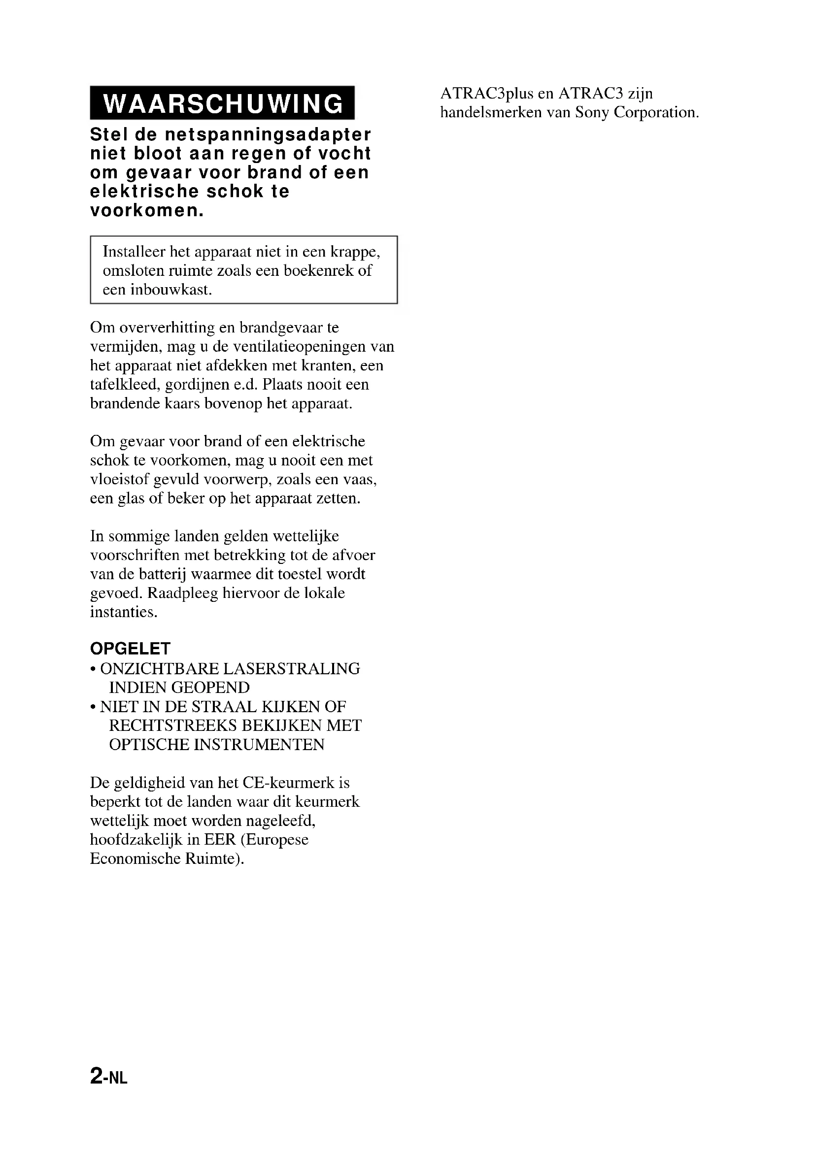 - OPTISCHE INSTRUMENTEN De geldigheid van het CE-keurmerk is beperkt tot de landen waar dit keurmerk wettelijk moet worden nageleefd, hoofdzakelijk in EER (Europese Economische Ruimte).3-NL Inhoudsopgave Veel plezier met de ATRAC CD Walkman! Maak uw eigen ATRAC CD’s! p. 4