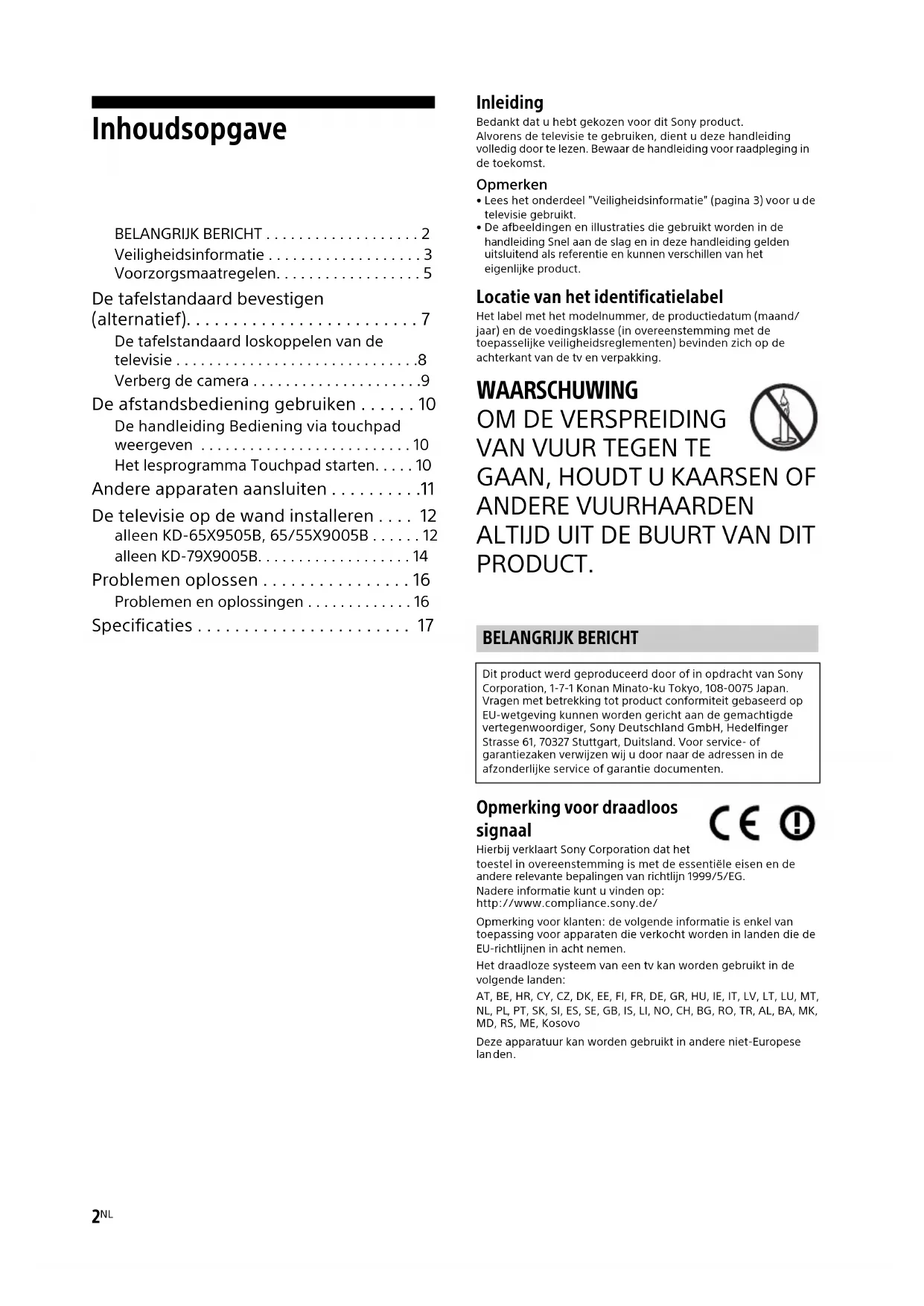 PRODUCT. Opmerking voor draadloos signaal Hierbij verklaart Sony Corporation dat het toestel in overeenstemming is met de essentiële eisen en de andere relevante bepalingen van richtlijn 1999/5/EG.Nadere informatie kunt u vinden op:http://www.compliance.sony.de/Opmerking voor klanten: de volgende informatie is enkel van toepassing voor apparaten die verkocht worden in landen die de EU-richtlijnen in acht nemen.Het draadloze systeem van een tv kan worden gebruikt in de lgende landen:AT, BE, HR, CY, CZ, DK, EE, FI, FR, DE, GR, HU, IE, IT, LV, LT, LU, MT, NL, PL, PT, SK, SI, ES, SE, GB, IS, LI, NO, CH, BG, RO, TR, AL, BA, MK, MD, RS, ME, KosovoDeze apparatuur kan worden gebruikt in andere niet-Europese lan den. BELANGRIJK BERICHT Dit product werd geproduceerd door of in opdracht van Sony Corporation, 1-7-1 Konan Minato-ku Tokyo, 108-0075 Japan. Vragen met betrekking tot product conformiteit gebaseerd op EU-wetgeving kunnen worden gericht aan de gemachtigde vertegenwoordiger, Sony Deutschland GmbH, Hedelfinger Strasse 61, 70327 Stuttgart, Duitsland. Voor service- of garantiezaken verwijzen wij u door naar de adressen in de afzonderlijke service of garantie documenten.GB