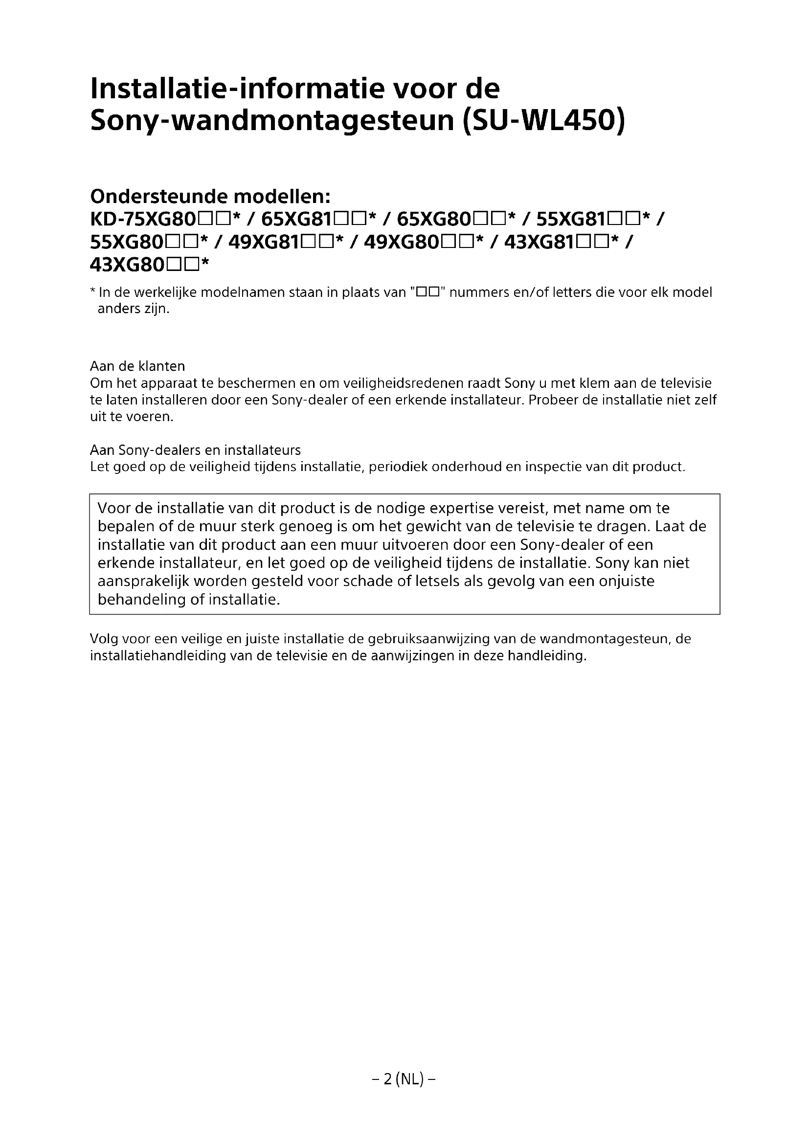 - In de werkelijke modelnamen staan in plaats van "" nummers en/of letters die voor elk model anders zijn. Aan de klanten Om het apparaat te beschermen en om veiligheidsredenen raadt Sony u met klem aan de televisie te laten installeren door een Sony-dealer of een erkende installateur. Probeer de installatie niet zelf uit te voeren. Aan Sony-dealers en installateurs Let goed op de veiligheid tijdens installatie, periodiek onderhoud en inspectie van dit product. Voor de installatie van dit product is de nodige expertise vereist, met name om te bepalen of de muur sterk genoeg is om het gewicht van de televisie te dragen. Laat de installatie van dit product aan een muur uitvoeren door een Sony-dealer of een erkende installateur, en let goed op de veiligheid tijdens de installatie. Sony kan niet aansprakelijk worden gesteld voor schade of letsels als gevolg van een onjuiste behandeling of installatie. Volg voor een veilige en juiste installatie de gebruiksaanwijzing van de wandmontagesteun, de installatiehandleiding van de televisie en de aanwijzingen in deze handleiding.− 3 (NL) −