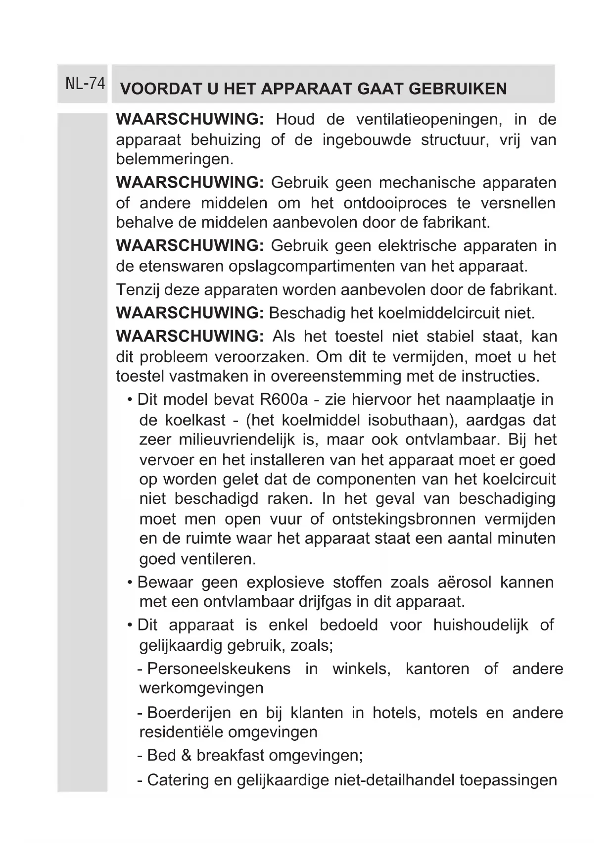 WAARSCHUWING: Houd de ventilatieopeningen, in de apparaat behuizing of de ingebouwde structuur, vrij van belemmeringen. WAARSCHUWING: Gebruik geen mechanische apparaten of andere middelen om het ontdooiproces te versnellen behalve de middelen aanbevolen door de fabrikant. WAARSCHUWING: Gebruik geen elektrische apparaten in de etenswaren opslagcompartimenten van het apparaat. Tenzij deze apparaten worden aanbevolen door de fabrikant. WAARSCHUWING: Beschadig het koelmiddelcircuit niet. WAARSCHUWING: Als het toestel niet stabiel staat, kan dit probleem veroorzaken. Om dit te vermijden, moet u het toestel vastmaken in overeenstemming met de instructies.