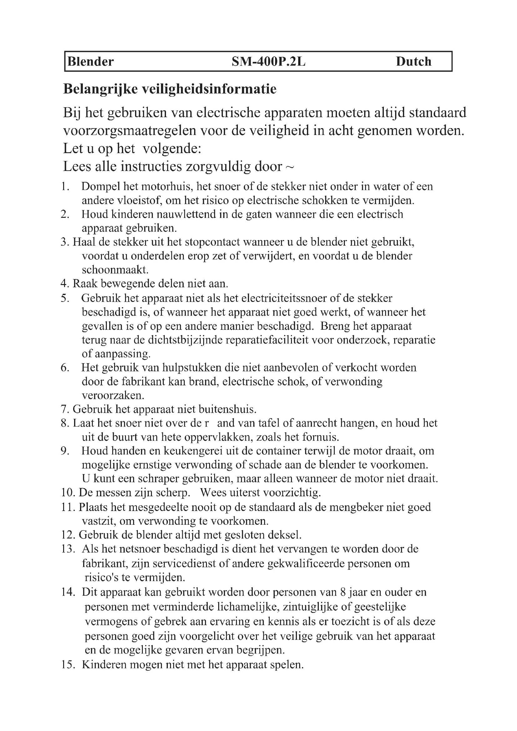Het symbool boven en op het apparaat houdt in dat het product geclassificeerd is als elektrische of elektronische apparatuur en niet met het huishoudelijke of bedrijfsafval dient te worden afgevoerd wanneer het niet meer bruikbaar is. De Waste of Electrical and Electronic Equipment (WEEE) richtlijn (2012/19/EU) is opgesteld om producten te recyclen met de beste beschikbare terugwinnings en recycling technieken om zo de invloed op het milieu te minimaliseren, gevaarlijke stoffen te behandelen en de groeiende afvalbergen tegen te gaan. Neem contact op met uw lokale overheid voor informatie over de correcte afvoer van elektrische of elektronische apparatuur.Mixeur SM-400P.2L France Précautions importantes Lors de l’utilisation d’un appareil électrique, des précautions de sécurité de base doivent toujours être suivies, en particulier les suivantes : Lire attentivement toutes les instructions ~