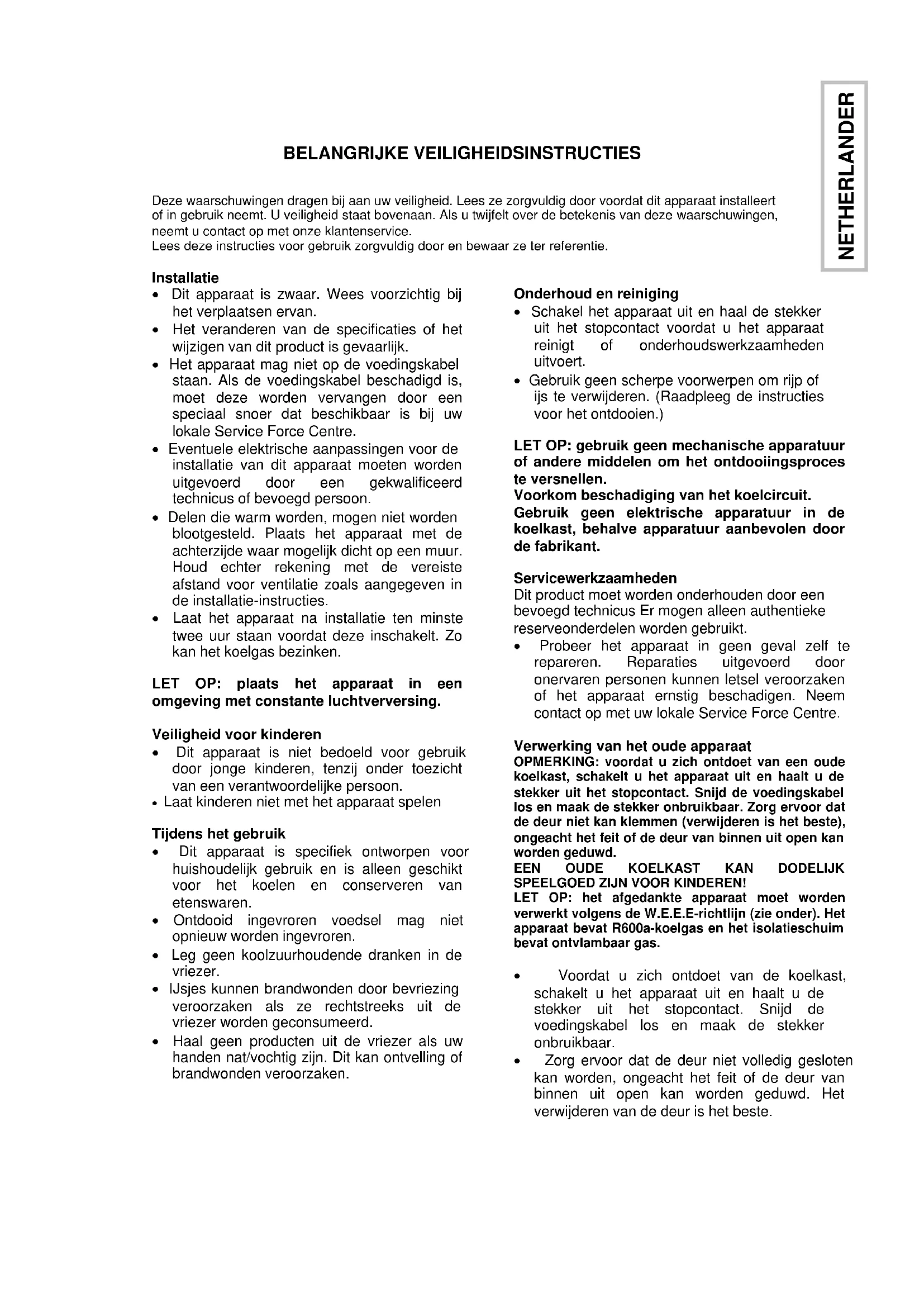 Deze waarschuwingen dragen bij aan uw veiligheid. Lees ze zorgvuldig door voordat dit apparaat installeert of in gebruik neemt. U veiligheid staat bovenaan. Als u twijfelt over de betekenis van deze waarschuwingen, neemt u contact op met onze klantenservice. Lees deze instructies voor gebruik zorgvuldig door en bewaar ze ter referentie. Installatie Dit apparaat is zwaar. Wees voorzichtig bij het verplaatsen ervan. Het veranderen van de specificaties of het wijzigen van dit product is gevaarlijk. Het apparaat mag niet op de voedingskabel staan. Als de voedingskabel beschadigd is, moet deze worden vervangen door een speciaal snoer dat beschikbaar is bij uw lokale Service Force Centre. Eventuele elektrische aanpassingen voor de installatie van dit apparaat moeten worden uitgevoerd door een gekwalificeerd technicus of bevoegd persoon. Delen die warm worden, mogen niet worden blootgesteld. Plaats het apparaat met de achterzijde waar mogelijk dicht op een muur. Houd echter rekening met de vereiste afstand voor ventilatie zoals aangegeven in de installatie-instructies. Laat het apparaat na installatie ten minste twee uur staan voordat deze inschakelt. Zo kan het koelgas bezinken. LET OP: plaats het apparaat in een omgeving met constante luchtverversing. Veiligheid voor kinderen Dit apparaat is niet bedoeld voor gebruik door jonge kinderen, tenzij onder toezicht van een verantwoordelijke persoon. Laat kinderen niet met het apparaat spelen Tijdens het gebruik Dit apparaat is specifiek ontworpen voor huishoudelijk gebruik en is alleen geschikt voor het koelen en conserveren van etenswaren. Ontdooid ingevroren voedsel mag niet opnieuw worden ingevroren. Leg geen koolzuurhoudende dranken in de vriezer. IJsjes kunnen brandwonden door bevriezing veroorzaken als ze rechtstreeks uit de vriezer worden geconsumeerd. Haal geen producten uit de vriezer als uw handen nat/vochtig zijn. Dit kan ontvelling of brandwonden veroorzaken.