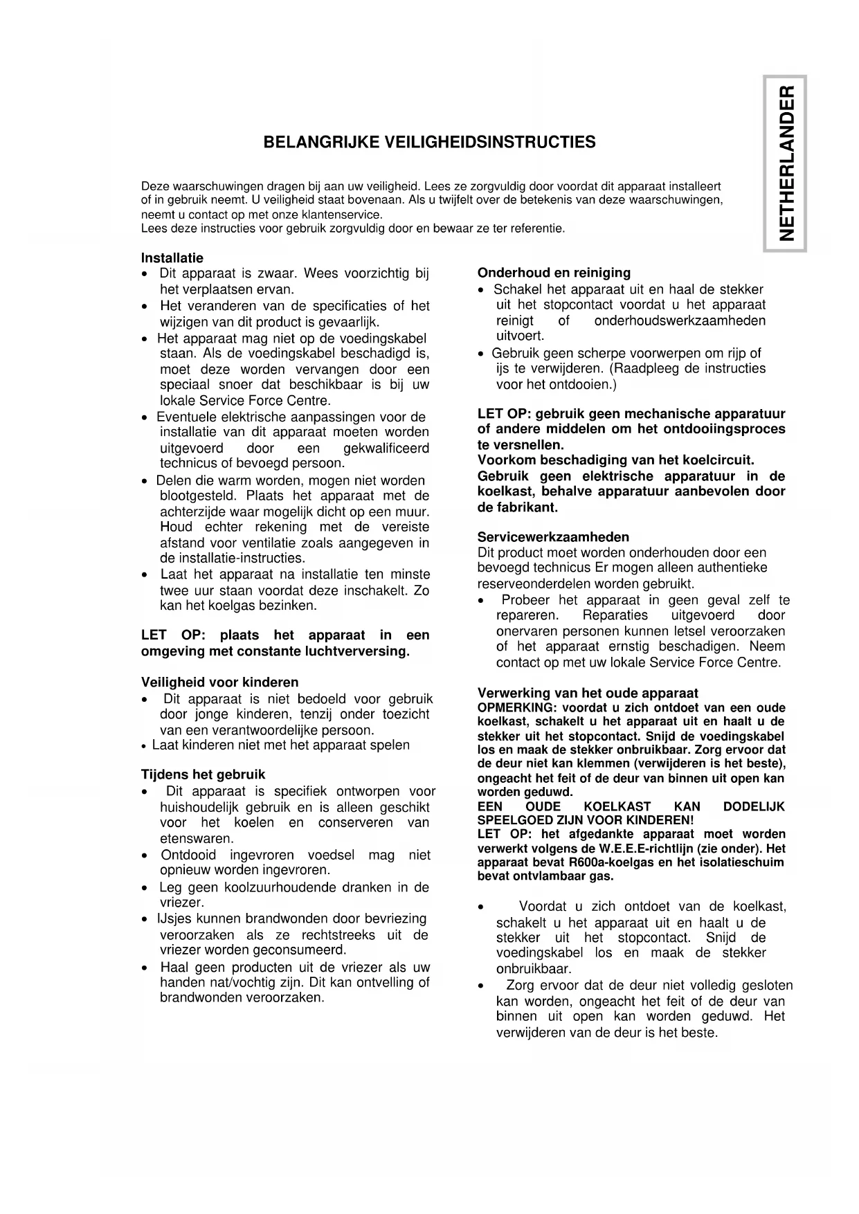 SPEELGOED ZIJN VOOR KINDEREN! LET OP: het afgedankte apparaat moet worden verwerkt volgens de W.E.E.E-richtlijn (zie onder). Het apparaat bevat R600a-koelgas en het isolatieschuim bevat ontvlambaar gas. Voordat u zich ontdoet van de koelkast, schakelt u het apparaat uit en haalt u de stekker uit het stopcontact. Snijd de voedingskabel los en maak de stekker onbruikbaar. Zorg ervoor dat de deur niet volledig gesloten kan worden, ongeacht het feit of de deur van binnen uit open kan worden geduwd. Het verwijderen van de deur is het beste. NETHERLANDER