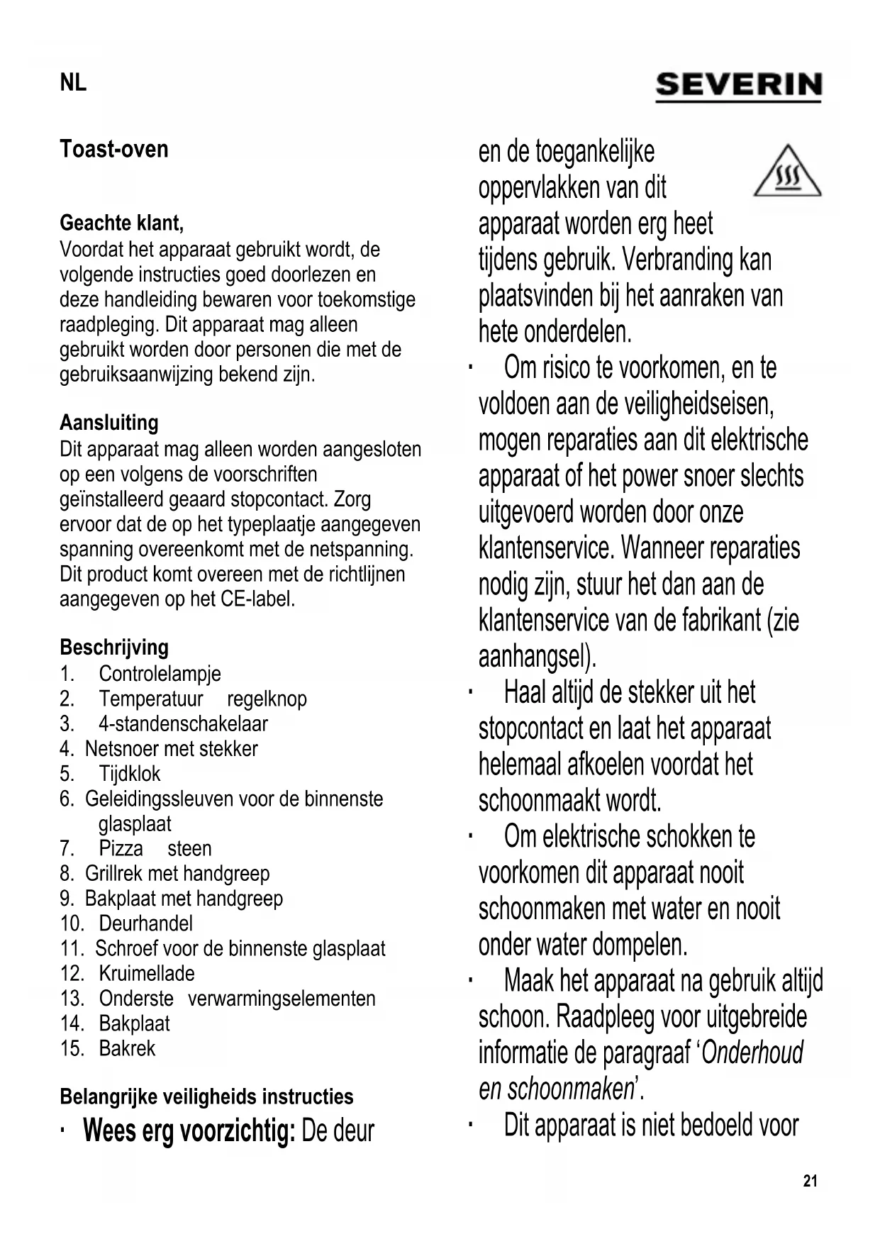 Belangrijke veiligheids instructies ∙ Wees erg voorzichtig: De deur en de toegankelijke oppervlakken van dit apparaat worden erg heet tijdens gebruik. Verbranding kan plaatsvinden bij het aanraken van hete onderdelen. ∙ Om risico te voorkomen, en te voldoen aan de veiligheidseisen, mogen reparaties aan dit elektrische apparaat of het power snoer slechts uitgevoerd worden door onze klantenservice. Wanneer reparaties nodig zijn, stuur het dan aan de klantenservice van de fabrikant (zie aanhangsel). ∙ Haal altijd de stekker uit het stopcontact en laat het apparaat helemaal afkoelen voordat het schoonmaakt wordt. ∙ Om elektrische schokken te voorkomen dit apparaat nooit schoonmaken met water en nooit onder water dompelen. ∙ Maak het apparaat na gebruik altijd schoon. Raadpleeg voor uitgebreide informatie de paragraaf ‘Onderhoud en schoonmaken’. ∙ Dit apparaat is niet bedoeld voor NL22 gebruik met een externe tijdklok of een aparte afstandsbediening. ∙ Dit apparaat mag gebruikt worden door kinderen (tenminste 8 jaar oud) en door personen met verminderde fysische, zintuiglijke of mentale bekwaamheden, of met gebrek aan ervaring en kennis, indien zij onder begeleiding zijn of instructies ontvangen hebben over het gebruik van dit apparaat en de gevaren en veiligheidsvoorschriften volledig begrijpen. ∙ Kinderen mogen niet met het apparaat spelen. ∙ Kinderen mogen dit apparaat in geen geval schoonmaken of onderhoudswerkzaamheden verrichten, tenzij onder toezicht van een volwassene en ze tenminste 8 jaar oud zijn. ∙ Het apparaat en het netsnoer moeten altijd goed weggehouden worden van kinderen die jonger zijn dan 8 jaar. ∙ Waarschuwing: Houdt kinderen uit de nabijheid van inpakmateriaal, omdat deze een bron van gevaar zijn, bijv. voor verstikking. ∙ Voordat het apparaat wordt gebruikt moet zowel de hoofdeenheid inclusief het netsnoer, evenals elk hulpstuk dat wordt aangebracht, eerst zorgvuldig op eventuele defecten gecontroleerd worden. In geval het apparaat, bijvoorbeeld, op een hard oppervlak is gevallen, of wanneer men met overdadige kracht aan het netsnoer getrokken heeft, mag men het niet meer gebruiken: zelfs een onzichtbare beschadiging kan ongewenste effecten hebben op de gebruiksveiligheid van het apparaat. ∙ De verwarmingselementen niet aanraken. ∙ Voordat het apparaat wordt gebruikt, moet de kruimellade in de juiste positie onder de onderste verwarmingselementen geplaatst worden. ∙ Oververhitte olie of vet kan ontbranden. Vul daarom de bakplaat niet te vol; dit zal voorkomen dat er vet op de onderliggende verwarmingselementen gaat druppelen. ∙ Laat dit apparaat nooit onbeheerd achter. ∙ Gebruik het apparaat niet buitenshuis. ∙ Voldoende ventilatie moet altijd aanwezig zijn. Plaats nooit voorwerpen op het apparaat en zorg ervoor dat er voldoende ruimte aanwezig is tussen het apparaat, de muur en andere voorwerpen. Zijkant: 12 cm Bovenkant: 30 cm ∙ Het apparaat mag niet in een kast geplaatst worden. Wanneer men het apparaat plaatst, ervoor zorgen dat het niet direct onder een keukenkastje of een ander voorwerp geplaatst wordt. ∙ De poten aan de onderkant van het apparaat mogen niet verwijderd worden. ∙ Plaats dit apparaat nooit bij of onder overhangende kasten of gordijnen of andere brandbare materialen. ∙ Plaats dit apparaat tijdens gebruik op een hittebestendige ondergrond23 ondoordringbaar voor spetters en vlekken. Plaats het apparaat nooit op een hete ondergrond of in de buurt van open vuur of brandbare gassen. ∙ Waarschuwing: De pizza steen wordt zeer heet tijdens gebruik en zal zeer langzaam afkoelen wanneer men het apparaat uitschakelt en loskoppelt van het stroomnet. Er is een groot gevaar voor verbranding wanneer men deze aanraakt. ∙ Laat de pizza steen geheel afkoelen voordat men deze van het apparaat verwijderd. ∙ Waarschuwing: Plaats geen aluminium folie of iets gelijkwaardigs tussen het grillrek en de pizza steen. Plaats de steen direct op het rek. ∙ Zorg dat het netsnoer niet in aanraking komt met hete delen van het apparaat. ∙ Laat het netsnoer niet los hangen. ∙ Schakel het apparaat altijd uit en verwijder de stekker uit het stopcontact: - na gebruik, - wanneer het apparaat niet werkt, - wanneer men het apparaat schoonmaakt. ∙ Trek de stekker niet aan het netsnoer uit het stopcontact, trek aan de stekker zelf. ∙ De fabrikant heeft geen verantwoordelijkheid wanneer dit apparaat verkeerd gebruikt word of wanneer de veiligheidsinstructies niet opgevolgd worden. ∙ Dit apparaat is bestemd voor huishoudelijk of gelijkwaardig gebruik, zoals - in winkels, kantoren of andere bedrijfsruimtes, - in agrarische instellingen, - door klanten in hotels, motels enz. en gelijkwaardige etablissementen, - in bed-and breakfast gasthuizen. Temperatuur regelknop De temperatuur regelknop wordt gebruikt om de juiste temperatuur in te stellen. 4-standenschakelaarinstellingen Boven verhitting met hete lucht convectie Boven verhitting Onder verhitting Boven en onder verhitting met hete lucht convectie De verwarmingselementen zullen alleen aangaan wanneer de tijdklok is ingeschakeld. Tijdklok De tijdklok kan gebruikt worden voor het selecteren van een bepaalde kooktijd (tot 60 minuten) of continue werking. Voor continue werking, de tijdklok, tegen de wijzers van de klok in, draaien naar de stand . Om het apparaat uit te schakelen, de knop van de tijdklok terugdraaien naar de stand ‘ ’. Om een tijdsduur te programmeren de knop van de tijdklok, met de wijzers van de klok mee, draaien naar de gewenste waarde. Om een tijd van minder dan 10 minuten in te stellen, draai de tijdklok eerst naar een iets hogere stand en dan langzaam terug naar de gewenste tijdstand. Wanneer de voorgeprogrammeerde tijd verlopen is zal een pieptoon aangeven dat de verhittingselementen uitgeschakeld zijn. Controlelampje Het controlelampje zal aangaan wanneer het24 apparaat is aangezet. Het zal uitgaan zodra de voorgeprogrammeerde tijd verlopen is, of de schake