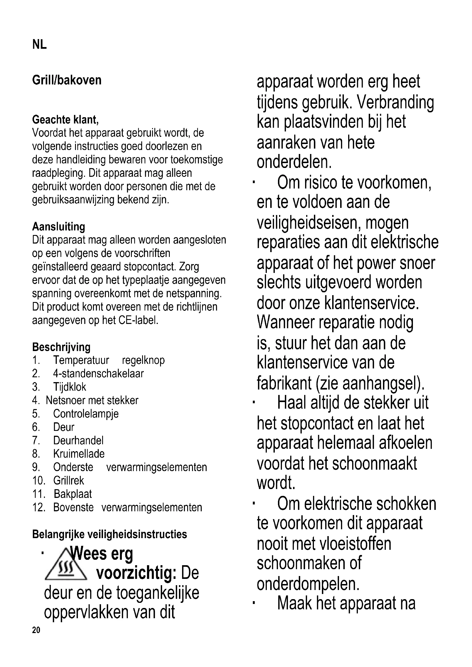 Belangrijke veiligheidsinstructies ∙ Wees erg voorzichtig: De deur en de toegankelijke oppervlakken van dit apparaat worden erg heet tijdens gebruik. Verbranding kan plaatsvinden bij het aanraken van hete onderdelen. ∙ Om risico te voorkomen, en te voldoen aan de veiligheidseisen, mogen reparaties aan dit elektrische apparaat of het power snoer slechts uitgevoerd worden door onze klantenservice. Wanneer reparatie nodig is, stuur het dan aan de klantenservice van de fabrikant (zie aanhangsel). ∙ Haal altijd de stekker uit het stopcontact en laat het apparaat helemaal afkoelen voordat het schoonmaakt wordt. ∙ Om elektrische schokken te voorkomen dit apparaat nooit met vloeistoffen schoonmaken of onderdompelen. ∙ Maak het apparaat na NL21 gebruik altijd schoon. Raadpleeg voor uitgebreide informatie de paragraaf Onderhoud en schoonmaken. ∙ Dit apparaat is niet bedoeld voor gebruik met een externe tijdklok of een aparte afstandsbediening. ∙ Dit apparaat is bestemd voor huishoudelijk of gelijkwaardig gebruik, zoals - in bedrijfskeukens, in winkels, kantoren of andere bedrijfsruimtes, - in agrarische instellingen, - door klanten in hotels, motels enz. en gelijkwaardige accommodaties, - in bed and breakfast gasthuizen. ∙ Dit apparaat mag gebruikt worden door kinderen (tenminste 8 jaar oud) en door personen met verminderde fysische, zintuiglijke of mentale bekwaamheden, of met gebrek aan ervaring en kennis, indien zij onder begeleiding zijn of instructies ontvangen hebben over het gebruik van dit apparaat en de gevaren en veiligheidsvoorschriften volledig begrijpen. ∙ Kinderen mogen niet met het apparaat spelen. ∙ Kinderen mogen dit apparaat in geen geval schoonmaken of onderhoudswerkzaamheden verrichten, tenzij onder toezicht van een volwassene en ze tenminste 8 jaar oud zijn. ∙ Het apparaat en het netsnoer moeten altijd goed weggehouden worden van kinderen die jonger zijn dan 8 jaar. ∙ Waarschuwing: Houdt kinderen uit de nabijheid van inpakmateriaal, omdat deze een bron van gevaar zijn, bijv. voor verstikking.22 ∙ Voordat het apparaat wordt gebruikt moet zowel de hoofdeenheid inclusief het netsnoer, evenals elk hulpstuk dat wordt aangebracht, eerst zorgvuldig op eventuele defecten gecontroleerd worden. In geval het apparaat, bijvoorbeeld, op een hard oppervlak is gevallen, of wanneer men met overdadige kracht aan het netsnoer getrokken heeft, mag men het niet meer gebruiken: zelfs een onzichtbare beschadiging kan ongewenste effecten hebben op de gebruiksveiligheid van het apparaat. ∙ De verwarmingselementen niet aanraken. ∙ Voordat het apparaat wordt gebruikt, moet de kruimellade in de juiste positie onder de onderste verwarmingselementen geplaatst worden. ∙ Oververhitte olie of vet kan ontbranden. Vul daarom de bakplaat niet te vol; dit zal voorkomen dat er vet op de onderliggende verwarmingselementen gaat druppelen. ∙ Tijdens gebruik moet de bakplaat altijd op het grillrek geplaatst zijn. ∙ Zorg dat er geen scherpe of schurende voorwerpen tijdens het gebruik of het schoonmaken in aanraking komen met de bakplaat. ∙ Laat dit apparaat nooit onbeheerd achter. ∙ Gebruik het apparaat niet buitenshuis. ∙ Voldoende ventilatie moet altijd aanwezig zijn. Plaats nooit voorwerpen op het apparaat en zorg ervoor dat er voldoende ruimte aanwezig is tussen het apparaat, de muur en andere voorwerpen. Zijkant: 12 cm Achterkant: 12 cm Bovenkant: 30 cm ∙ Het apparaat mag niet in een kast geplaatst worden. Wanneer men het apparaat plaatst, ervoor zorgen dat het niet direct onder een keukenkastje of een ander voorwerp geplaatst wordt. ∙ De poten aan de onderkant van het apparaat mogen niet verwijderd worden. ∙ Plaats dit apparaat nooit bij of onder overhangende kasten of gordijnen of andere brandbare materialen. ∙ Plaats dit apparaat tijdens gebruik op een hittebestendige ondergrond ondoordringbaar voor spetters en vlekken. Plaats het apparaat nooit op een hete ondergrond of in de buurt van open vuur of brandbare gassen. ∙ Zorg dat het netsnoer niet in aanraking komt met hete delen van het apparaat. ∙ Laat het netsnoer niet los hangen. ∙ Schakel het apparaat altijd uit en verwijder de stekker uit het stopcontact: - na gebruik, - wanneer het apparaat niet werkt, - wanneer men het apparaat schoonmaakt. ∙ Trek de stekker niet aan het netsnoer uit het stopcontact, trek aan de stekker zelf. ∙ De fabrikant heeft geen verantwoordelijkheid wanneer dit apparaat verkeerd gebruikt word of wanneer de veiligheidsinstructies niet opgevolgd worden. Temperatuur regelknop De temperatuur regelknop wordt gebruikt om de juiste temperatuur in te stellen. 4-standenschakelaar instellingen Beide verhittingselementen zijn uitgeschakeld Boven verhitting Onder verhitting23 Boven en onder verhitting De verwarmingselementen zullen alleen aangaan wanneer de tijdklok is ingeschakeld. Tijdklok ∙ Met gebruik van de tijdklok kan men de kooktijd selecteren (max. 60 minuten). ∙ Om een tijdsduur te programmeren de knop van de tijdklok, met de wijzers van de klok mee, draaien naar de gewenste waarde. ∙ Om een tijd van minder dan 10 minuten in te stellen, draai de tijdklok eerst naar een iets hogere stand en dan langzaam terug naar de gewenste tijdstand. Wanneer de voorgeprogrammeerde tijd verlopen is zal een pieptoon aangeven dat de verhittingselementen uitgeschakeld zijn. Controle lampje Het controlelampje zal aangaan wanneer het apparaat is aangezet. Het zal uitgaan zodra de voorgeprogrammeerde tijd verlopen is, of de schakelaar teruggezet is naar de stand