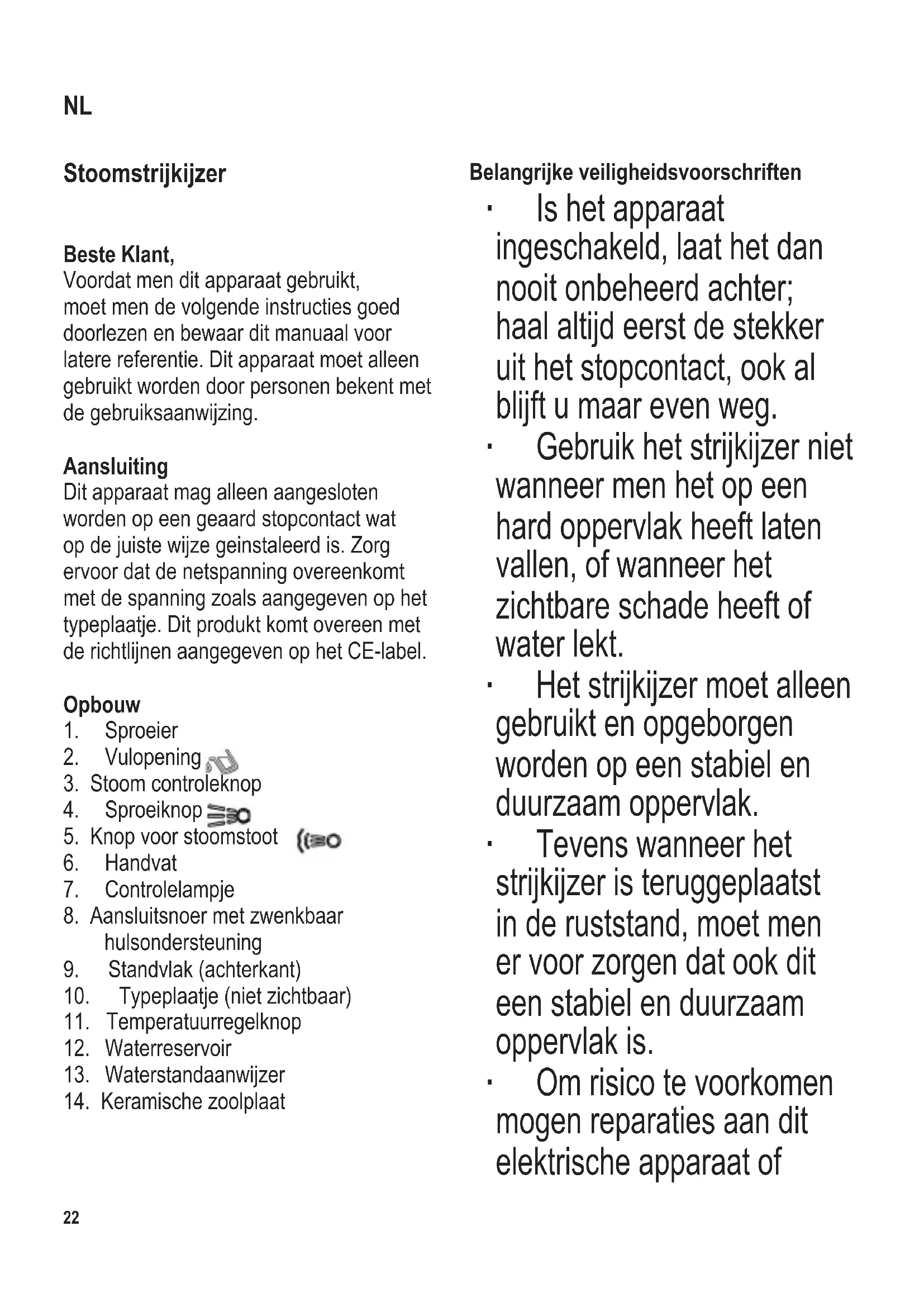 Belangrijke veiligheidsvoorschriften ∙ Is het apparaat ingeschakeld, laat het dan nooit onbeheerd achter; haal altijd eerst de stekker uit het stopcontact, ook al blijft u maar even weg. ∙ Gebruik het strijkijzer niet wanneer men het op een hard oppervlak heeft laten vallen, of wanneer het zichtbare schade heeft of water lekt. ∙ Het strijkijzer moet alleen gebruikt en opgeborgen worden op een stabiel en duurzaam oppervlak. ∙ Tevens wanneer het strijkijzer is teruggeplaatst in de ruststand, moet men er voor zorgen dat ook dit een stabiel en duurzaam oppervlak is. ∙ Om risico te voorkomen mogen reparaties aan dit elektrische apparaat of NL104 x 142 mm
