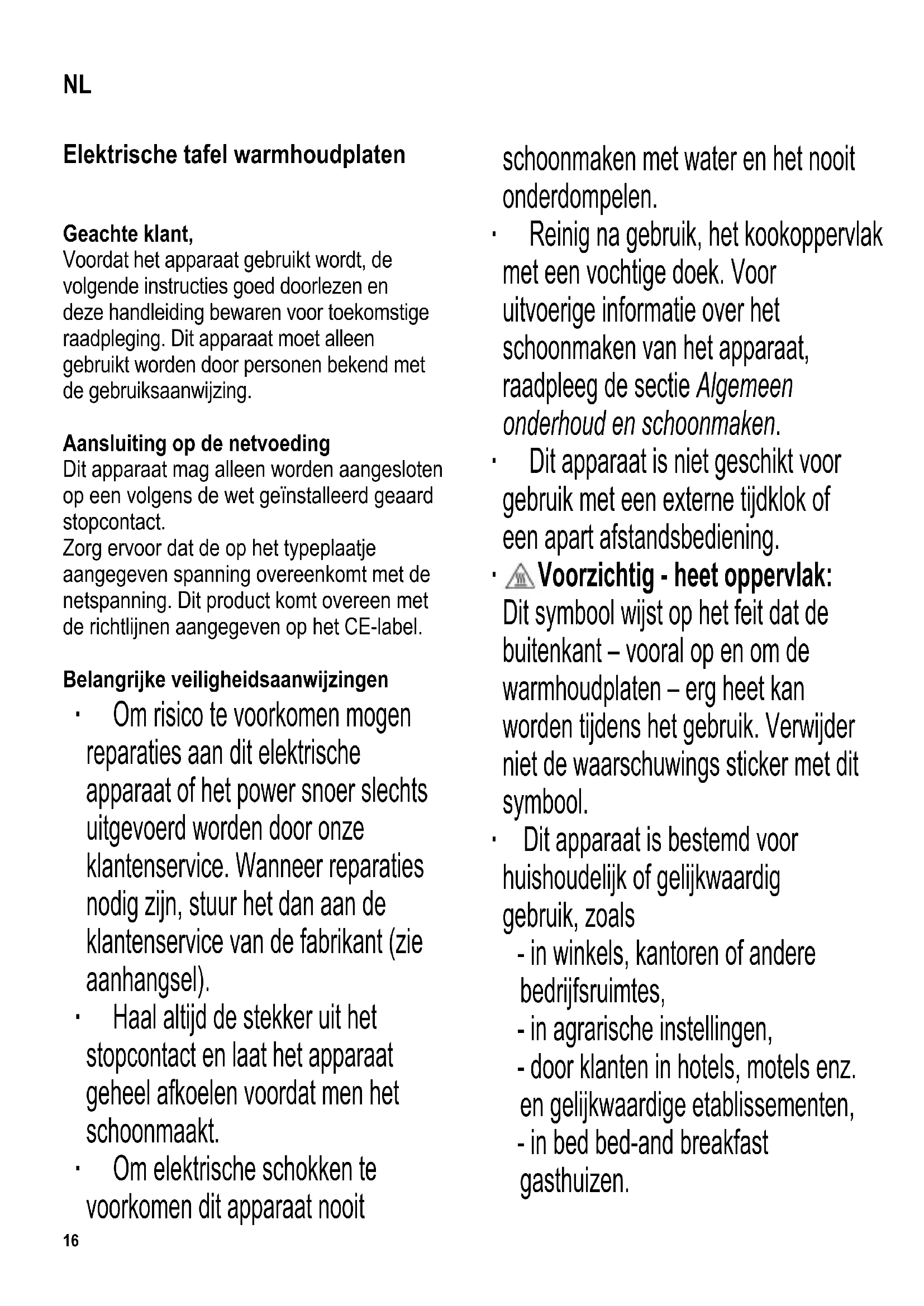 Voorzichtig - heet oppervlak: Dit symbool wijst op het feit dat de buitenkant – vooral op en om de warmhoudplaten – erg heet kan worden tijdens het gebruik. Verwijder niet de waarschuwings sticker met dit symbool. ∙ Dit apparaat is bestemd voor huishoudelijk of gelijkwaardig gebruik, zoals - in winkels, kantoren of andere bedrijfsruimtes, - in agrarische instellingen, - door klanten in hotels, motels enz. en gelijkwaardige etablissementen, - in bed bed-and breakfast gasthuizen. NL17 ∙ Dit apparaat mag gebruikt worden door kinderen (tenminste 8 jaar oud) welke onder begeleiding zijn of die instructies over het gebruik van het apparaat ontvangen hebben en de gevaren en veiligheidsvoorschriften volledig begrijpen. ∙ Kinderen mogen niet met het apparaat spelen. ∙ Kinderen mogen in geen geval dit apparaat schoonmaken of onderhoudswerkzaamheden uitvoeren behalve wanneer onder toezicht van een volwassene en ze tenminste 8 jaar oud zijn. ∙ Het apparaat en het netsnoer moeten altijd goed weggehouden worden van kinderen jonger dan 8 jaar. ∙ Waarschuwing: houdt kinderen weg van inpakmateriaal daar dit een bron van gevaar zijn voor bijv. verstikking. ∙ Voordat het apparaat wordt gebruikt moet zowel de hoofdeenheid inclusief het netsnoer als welk ander hulpstuk dat wordt aangebracht, eerst zorgvuldig op eventuele defecten worden gecontroleerd. Ingeval het apparaat, bijvoorbeeld, op een hard oppervlak is gevallen, of wanneer men met overdadige kracht aan het netsnoer getrokken heeft, mag men het niet meer gebruiken: zelfs onzichtbare beschadiging kan ongewenste effecten hebben op de gebruiksveiligheid van het apparaat. ∙ Laat dit apparaat nooit onbeheerd achter. ∙ Attentie: Bij oververhitting kan het voedsel tot zelfontbranding overgaan. De mogelijkheid dat dit zal gebeuren zal toenemen naarmate het vet- of oliegehalte van het voedsel hoger is. ∙ Plaats dit apparaat nooit bij of onder overhangende kasten of gordijnen of andere brandbare materialen. ∙ Tijdens gebruik moet het apparaat op een warmtebestendig oppervlak worden geplaatst dat bestand is tegen spatten, vlekken of hete stoom. Zorg er altijd voor dat er lucht vrijelijk onder het toestel kan circuleren. Een minimale afstand van 10 cm van alle wanden moet in acht genomen worden. ∙ De ventilatiesleuven aan de onderkant van het toestel mogen tijdens het gebruik niet bedekt worden. ∙ Verwijder altijd de stekker uit het stopcontact: - wanneer het apparaat niet werkt, - na gebruik, - voordat men het apparaat schoonmaakt. ∙ Trek de stekker niet aan het snoer uit het stopcontact, trek aan de stekker zelf. ∙ Laat het snoer nooit los hangen. ∙ Zorg dat het snoer niet in aanraking komt met hete delen van de apparaat. ∙ De fabrikant heeft geen verantwoordelijkheid wanneer dit apparaat verkeerd gebruikt word of wanneer de veiligheidsinstructies niet gevolgd worden. Opstarten Voordat het apparaat voor de eerste keer18 wordt gebruikt laat het gedurende 3 minuten op vol vermogen heet worden (zonder dat men een pot of steelpan gebruikt), zorg hierbij voor voldoende ventilatie. Tijdens dit proces zal een lichte geur en een beetje rook afgescheiden worden. Dit is normaal en zal maar even duren. Zorg voor voldoende ventilatie door ramen of buitendeuren te openen. Maak het apparaat daarna schoon zoals hierna is beschreven in de sectie Algemeen onderhoud en schoonmaken. Gebruik ∙ Altijd eerst een pot / pan op de warmhoudplaat zetten voordat het apparaat wordt aangeschakeld. ∙ Zorg ervoor dat de pot / pan schoon is en droog aan de buitenkant. Geen met roet of vuil bedekte potten / pannen gebruiken. ∙ Om beschadiging van de verwarmingsplaat te voorkomen wordt geadviseerd uitsluitend potten / pannen met een vlakke bodem te gebruiken. Het meest geschikt zijn potten die speciaal voor gebruik op elektrische platen zijn ontworpen.(zie afbeelding I). ∙ Men moet er te allen tijde voor zorgen dat de pot / pan die gebruikt wordt dezelfde diameter heeft als de warmhoudplaat: dit verminderd het verlies aan warmte en voorkomt dat de plaat wordt beschadigd door een ongelijke warmteverdeling. Instelling van de thermostaat MAX : Voorkoken en snel-braden 4-5 : Normaal koken, braden 3-4 : Sudderen 1-2 : Warmhouder Zet na gebruik de thermostaatknop in de ‘MIN’ stand. Verwijder hierna de stekker uit het stopcontact om te verzekeren dat het apparaat geheel van het stroomnet is verwijderd. Indicatielampje Het indicatielampje blijft aan terwijl de warmhoudplaat aan het opwarmen is. Het zal uitgaan wanneer de voorgeprogrammeerde temperatuur bereikt is. Algemeen onderhoud en schoonmaken ∙ Haal altijd de stekker uit het stopcontact en laat het apparaat geheel afkoelen voordat men het schoonmaakt ∙ Om een elektrische schok te voorkomen dit apparaat nooit schoonmaken met water en dompel het nooit onder. ∙ Gebruik geen schuurmiddelen of bijtende schoonmaakproducten. ∙ Na gebruik kan met een natte doek eventuele morserijen van de platen worden verwijderd. ∙ Een speciaal schoonmaakmiddel moet gebruikt worden om de plaat van tijd tot tijd te behandelen. Afval weggooien Instrumenten gemerkt met dit symbool moeten apart weggegooit worden van het huishouidelijke afval, daar deze waardevolle materialen bevatten welke men kan recyclen. Juist wegdoen zal het milieu en de menselijke gezondheid beschermen. De plaatselijke autoriteit of handelaar kan daar informatie over geven. Garantieverklaring Voor dit apparaat geldt een garantie van19 twee jaar na de aankoopdatum voor materiaal- en fabrieksfouten. Uitgesloten van garantie is schade die ontstaan is door het niet in acht nemen van de gebruiksaanwijzing, normale slijtage en zeer breekbare onderdelen als glaskannen etc. Deze garantieverklaring heeft geen invloed op uw wettelijke rechten, en ook niet op uw legale rechten welke men heeft als een consument onder de toepasselijke nationale wetgeving welke de aankoop van goederen beheerst. De garantie vervalt bij reparatie door niet door ons bevoegde in