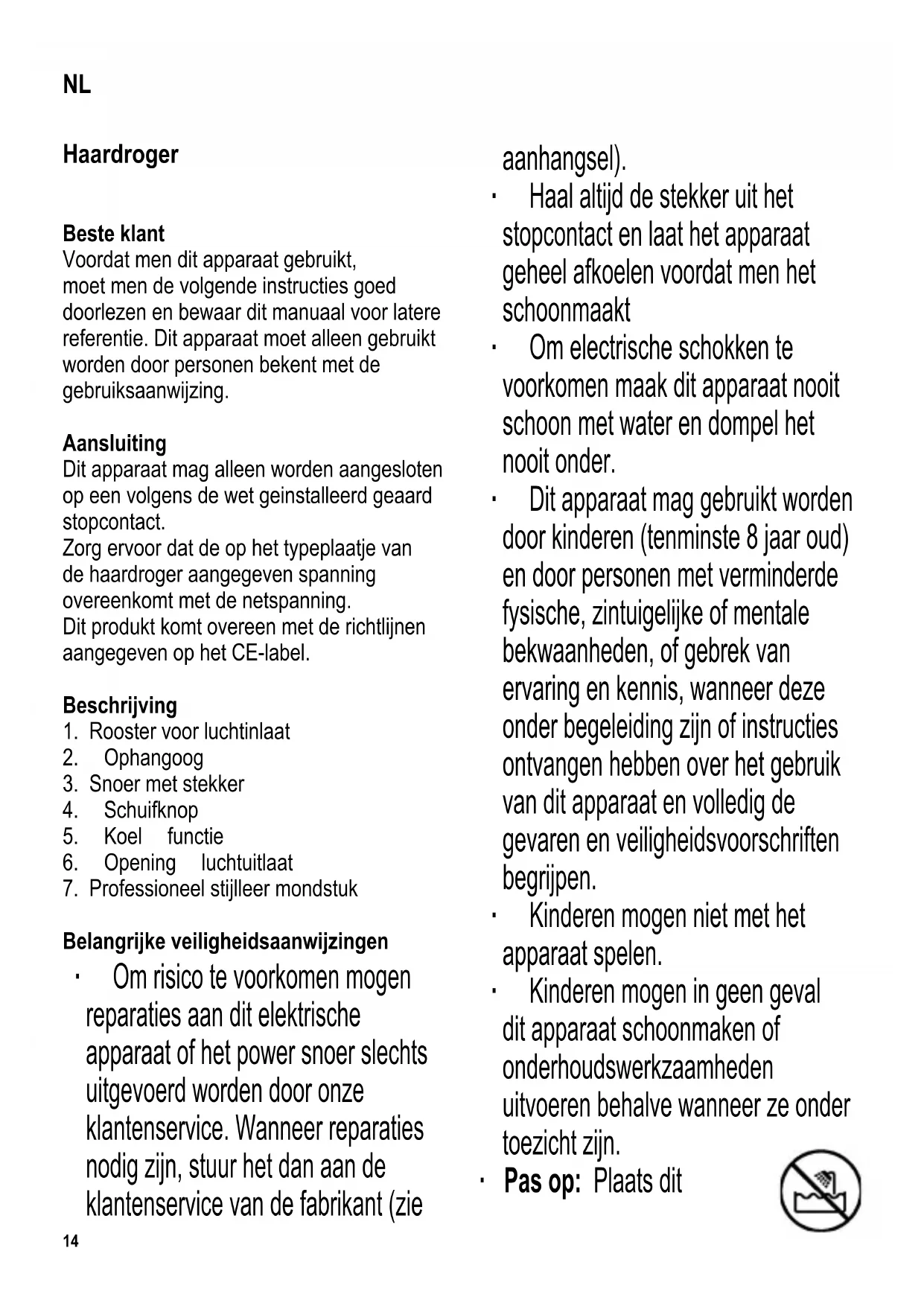 Belangrijke veiligheidsaanwijzingen ∙ Om risico te voorkomen mogen reparaties aan dit elektrische apparaat of het power snoer slechts uitgevoerd worden door onze klantenservice. Wanneer reparaties nodig zijn, stuur het dan aan de klantenservice van de fabrikant (zie aanhangsel). ∙ Haal altijd de stekker uit het stopcontact en laat het apparaat geheel afkoelen voordat men het schoonmaakt ∙ Om electrische schokken te voorkomen maak dit apparaat nooit schoon met water en dompel het nooit onder. ∙ Dit apparaat mag gebruikt worden door kinderen (tenminste 8 jaar oud) en door personen met verminderde fysische, zintuigelijke of mentale bekwaanheden, of gebrek van ervaring en kennis, wanneer deze onder begeleiding zijn of instructies ontvangen hebben over het gebruik van dit apparaat en volledig de gevaren en veiligheidsvoorschriften begrijpen. ∙ Kinderen mogen niet met het apparaat spelen. ∙ Kinderen mogen in geen geval dit apparaat schoonmaken of onderhoudswerkzaamheden uitvoeren behalve wanneer ze onder toezicht zijn. ∙ Pas op: Plaats dit NL15 apparaat nooit bij badkuipen, wastafels of andere vergaarbakken welke water bevatten. ∙ Dichtbij water kan gevaarlijk zijn, zelfs als het apparaat is uitgeschakeld. Daarom moet na gebruik de stekker te allen tijde uit het wandcontact worden verwijderd, als het apparaat in een badkamer wordt gebruikt. ∙ Extra bescherming kan verkregen worden door een aardlekschakelaar te installeren in je huis met een vastgestelde stroombreeker van niet meer dan 30mA (IF<30mA).Vraag een bevoegd elektricien. ∙ Waarschuwing: houdt kinderen weg van inpakmateriaal, daar deze een bron van gevaar zijn b.v. door verstikking. ∙ Bescherm het apparaat tegen vocht en gebruik het nooit met natte handen. ∙ Elektrische apparaten die verhitten gebruiken zeer hoge temperaturen. Raak nooit een ander deel van het apparaat aan dan de handgreep. Verbranding kan plaatsvinden wanneer men de hete delen aanraakt. ∙ Gebruik dit apparaat nooit op synthetische haarstukjes of pruiken. De afgegeven hitte kan schade veroorzaken aan synthetisch materiaal. ∙ Zorg dat de luchtinlaat en uitlaat niet geblokeerd worden door vingers of haar en dat stofdeeltjes zich niet verzamelen in de luchtinlaat. ∙ Een blokering in het luchtstroomsysteem kan de integrale terminal veiligheidsschakelaar het apparaat laten uitschakelen. Wanneer dit gebeurt moet men het apparaat onmiddelijk loskoppelen van het stroomnet en het voldoende laten afkoelen voordat men de blokering verwijderd en het apparaat opnieuw aanzet. ∙ Voordat het apparaat wordt gebruikt moet zowel de hoofdeenheid inclusief het powersnoer als gelijk welk hulpstuk, dat wordt aangebracht, eerst zorgvuldig op eventuele defecten worden gecontroleerd. Ingeval het apparaat, bijvoorbeeld, op een hard oppervlak is gevallen, of wanneer men met overdadige kracht aan het power snoer getrokken heeft, mag men het niet meer gebruiken: zelfs onzichtbare beschadiging kan ongewenste effecten hebben op de gebruiksveiligheid van het apparaat. ∙ Om schade te voorkomen aan het powersnoer moet men, - nooit het snoer buigen of knakken speciaal waar het de huizing verlaat,. - nooit aan het snoer trekken, - nooit het snoer rond het apparaat wikkelen. ∙ Laat dit apparaat nooit onbeheerd achter. ∙ Na gebruik, schakel het apparaat altijd uit en verwijder de stekker uit het stopcontact, en ook in geval dat het apparaat niet juist werkt. ∙ Trek de stekker niet aan het snoer uit het stopcontact, trek aan de stekker zelf. ∙ Plaats nooit op een onbeschermde ondergrond wanneer het apparaat heet is na gebruik. ∙ Wordt dit apparaat op een verkeerde16 manier gebruikt of worden de veiligheidsregels niet gevolgt, dan kan de fabrikant niet aansprakelijk worden gesteld voor eventuele schades. ∙ Dit apparaat is bestemd voor huishoudelijk of gelijkwaardig gebruik, zoals - in winkels, kantoren of andere bedrijfsruimtes, - in agrarische instellingen, - door klanten in hotels, motels enz. en gelijkwaardige etablissementen, - in bed-and breakfast gasthuizen. Stijlleer mondstuk Het stijlleer mondstuk kan geplaatst worden op de luchtuitlaat om te helpen met het vormen van het haar tijdens het haardrogen. Koelfunctie De koelfunctie kan altijd gebruikt worden tijdens het droog proces. Hat zal koudere lucht leveren, wat helpt met het versterken en vormen van het haar. Gebruik Sluit de haardroger aan op een geschikt stopcontact en gebruik de schuifknop om de gewenste power zetting te kiezen. Schoonmaken en onderhoud ∙ Voor het schoonmaken van de haardroger trek eerst de stekker uit het stopcontact. Zorg dat het apparaat volledig is afgekoelt. ∙ Om elektrische schokken te voorkomen maak de haardroger nooit schoon met water en dompel het nooit onder. ∙ Det behuizing van het apparaat mag schoongemaakt worden met en droge en pluisvrije doek. ∙ Controleer altijd de luchtinlaat voor stofdeeltjes en haar en verwijder deze wanneer nodig. Afval weggooien Instrumenten gemerkt met dit symbool moeten apart weggegooit worden van het huishouidelijke afval, daar deze waardevolle materialen bevatten welke men kan recyclen. Juist wegdoen zal het milieu en de menselijke gezondheid beschermen. De plaatselijke autoriteit of handelaar kan daar informatie over geven. Garantieverklaring Voor dit apparaat geldt een garantie van twee jaar na de aankoopdatum voor materiaal- en fabrieksfouten. Uitgesloten van garantie is schade die ontstaan is door het niet in acht nemen van de gebruiksaanwijzing, normale slijtage en zeer breekbare onderdelen als glaskannen etc. Deze garantieverklaring heeft geen invloed op uw wettelijke rechten, en ook niet op uw legale rechten welke men heeft als een consument onder de toepasselijke nationale wetgeving welke de aankoop van goederen beheerst. De garantie vervalt bij reparatie door niet door ons bevoegde instellingen.17 Secador de cabello Estimado Cliente, Antes de utilizar el aparato, lea atentamente estas instrucciones y conserve este manual para 