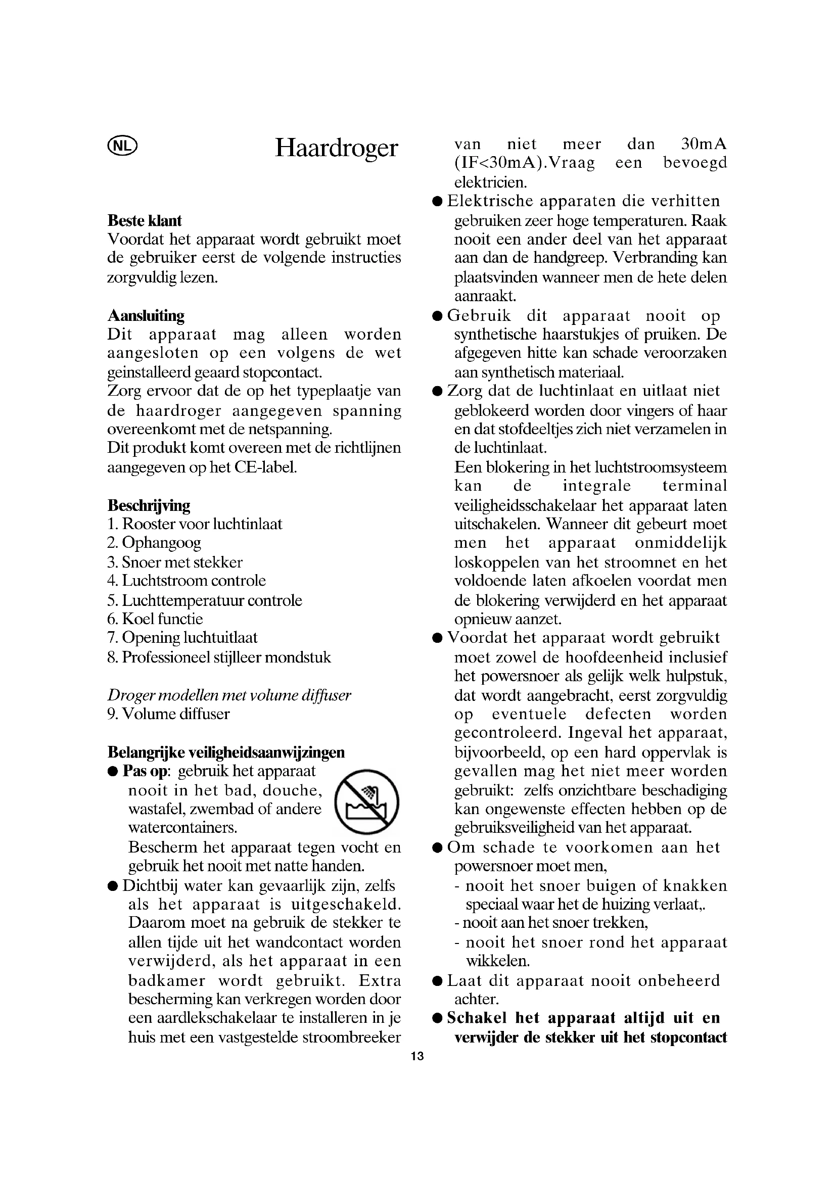 Belangrijke veiligheidsaanwijzingen ● Pas op: gebruik het apparaat nooit in het bad, douche, wastafel, zwembad of andere watercontainers. Bescherm het apparaat tegen vocht en gebruik het nooit met natte handen. ● Dichtbij water kan gevaarlijk zijn, zelfs als het apparaat is uitgeschakeld. Daarom moet na gebruik de stekker te allen tijde uit het wandcontact worden verwijderd, als het apparaat in een badkamer wordt gebruikt. Extra bescherming kan verkregen worden door een aardlekschakelaar te installeren in je huis met een vastgestelde stroombreeker van niet meer dan 30mA (IF<30mA).Vraag een bevoegd elektricien. ● Elektrische apparaten die verhitten gebruiken zeer hoge temperaturen. Raak nooit een ander deel van het apparaat aan dan de handgreep. Verbranding kan plaatsvinden wanneer men de hete delen aanraakt. ● Gebruik dit apparaat nooit op synthetische haarstukjes of pruiken. De afgegeven hitte kan schade veroorzaken aan synthetisch materiaal. ● Zorg dat de luchtinlaat en uitlaat niet geblokeerd worden door vingers of haar en dat stofdeeltjes zich niet verzamelen in de luchtinlaat. Een blokering in het luchtstroomsysteem kan de integrale terminal veiligheidsschakelaar het apparaat laten uitschakelen. Wanneer dit gebeurt moet men het apparaat onmiddelijk loskoppelen van het stroomnet en het voldoende laten afkoelen voordat men de blokering verwijderd en het apparaat opnieuw aanzet. ● Voordat het apparaat wordt gebruikt moet zowel de hoofdeenheid inclusief het powersnoer als gelijk welk hulpstuk, dat wordt aangebracht, eerst zorgvuldig op eventuele defecten worden gecontroleerd. Ingeval het apparaat, bijvoorbeeld, op een hard oppervlak is gevallen mag het niet meer worden gebruikt: zelfs onzichtbare beschadiging kan ongewenste effecten hebben op de gebruiksveiligheid van het apparaat. ● Om schade te voorkomen aan het powersnoer moet men, - nooit het snoer buigen of knakken speciaal waar het de huizing verlaat,. - nooit aan het snoer trekken, - nooit het snoer rond het apparaat wikkelen. ● Laat dit apparaat nooit onbeheerd achter. ● Schakel het apparaat altijd uit en verwijder de stekker uit het stopcontact