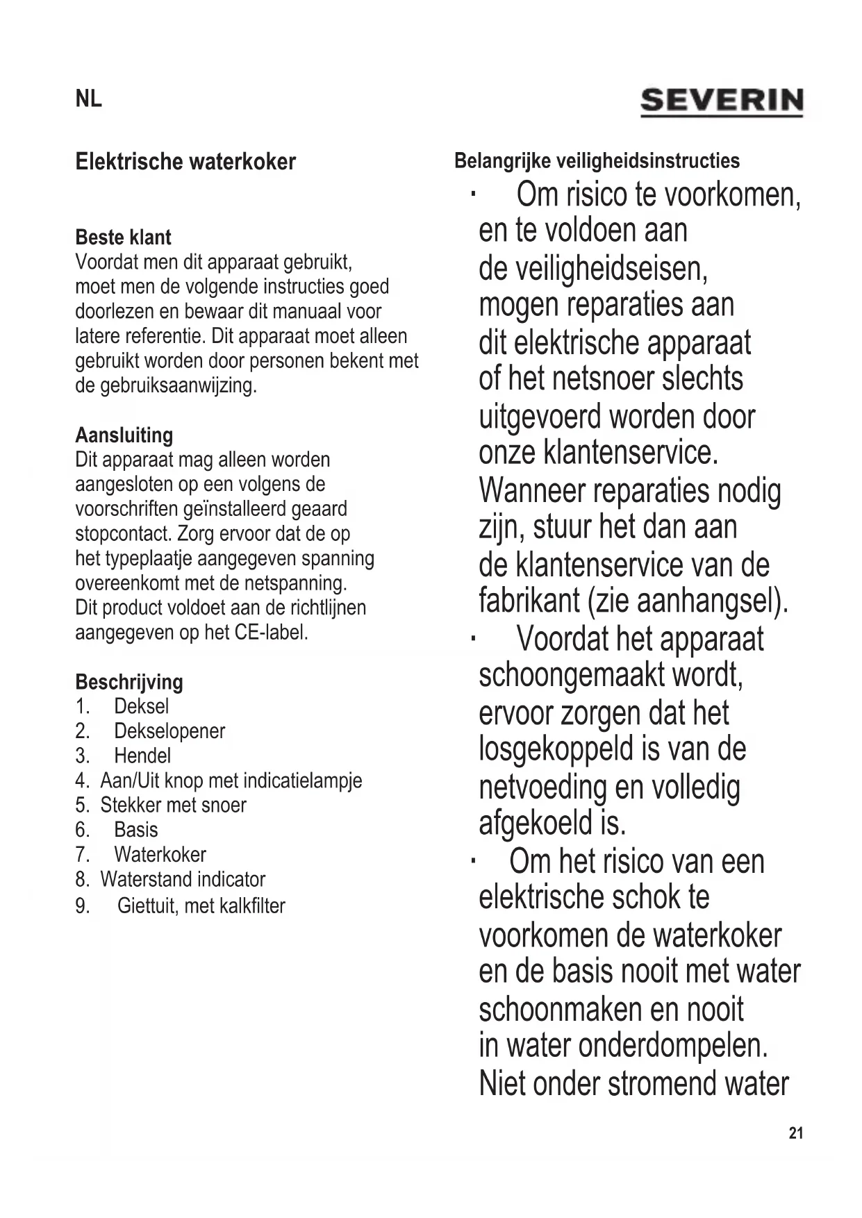 Belangrijke veiligheidsinstructies ∙ Om risico te voorkomen, en te voldoen aan de veiligheidseisen, mogen reparaties aan dit elektrische apparaat of het netsnoer slechts uitgevoerd worden door onze klantenservice. Wanneer reparaties nodig zijn, stuur het dan aan de klantenservice van de fabrikant (zie aanhangsel). ∙ Voordat het apparaat schoongemaakt wordt, ervoor zorgen dat het losgekoppeld is van de netvoeding en volledig afgekoeld is. ∙ Om het risico van een elektrische schok te voorkomen de waterkoker en de basis nooit met water schoonmaken en nooit in water onderdompelen. Niet onder stromend water NL22 104 x 142 mm schoonmaken. ∙ Het apparaat moet regelmatig ontkalkt worden. Wanneer nodig, de waterkoker schoonmaken met een vochtige doek. ∙ Gedetailleerde informatie over het schoonmaken van het apparaat vindt u in de paragraaf: Onderhoud en schoonmaken. ∙ Dit apparaat mag gebruikt worden door kinderen (tenminste 8 jaar oud) en door personen met verminderde fysische, zintuigelijke of mentale bekwaamheden, of gebrek aan ervaring en kennis, mits zij onder begeleiding zijn of instructies ontvangen hebben over het gebruik van dit apparaat en de gevaren en veiligheidsvoorschriften volledig begrijpen. ∙ Kinderen mogen niet met het apparaat spelen. ∙ Kinderen mogen in geen geval dit apparaat schoonmaken of onderhoudswerkzaamheden uitvoeren behalve wanneer onder toezicht van een volwassene en ze tenminste 8 jaar oud zijn. ∙ Het apparaat en het snoer moeten altijd goed weggehouden worden van kinderen jonger dan 8 jaar. ∙ Dit apparaat is bestemd voor huishoudelijk of gelijkwaardig gebruik, zoals - in bedrijfskeukens, in winkels, kantoren of andere bedrijfsruimtes, - in agrarische instellingen, - door klanten in hotels, motels enz. en gelijkwaardige accommodaties, - in bed and breakfast104 x 142 mm