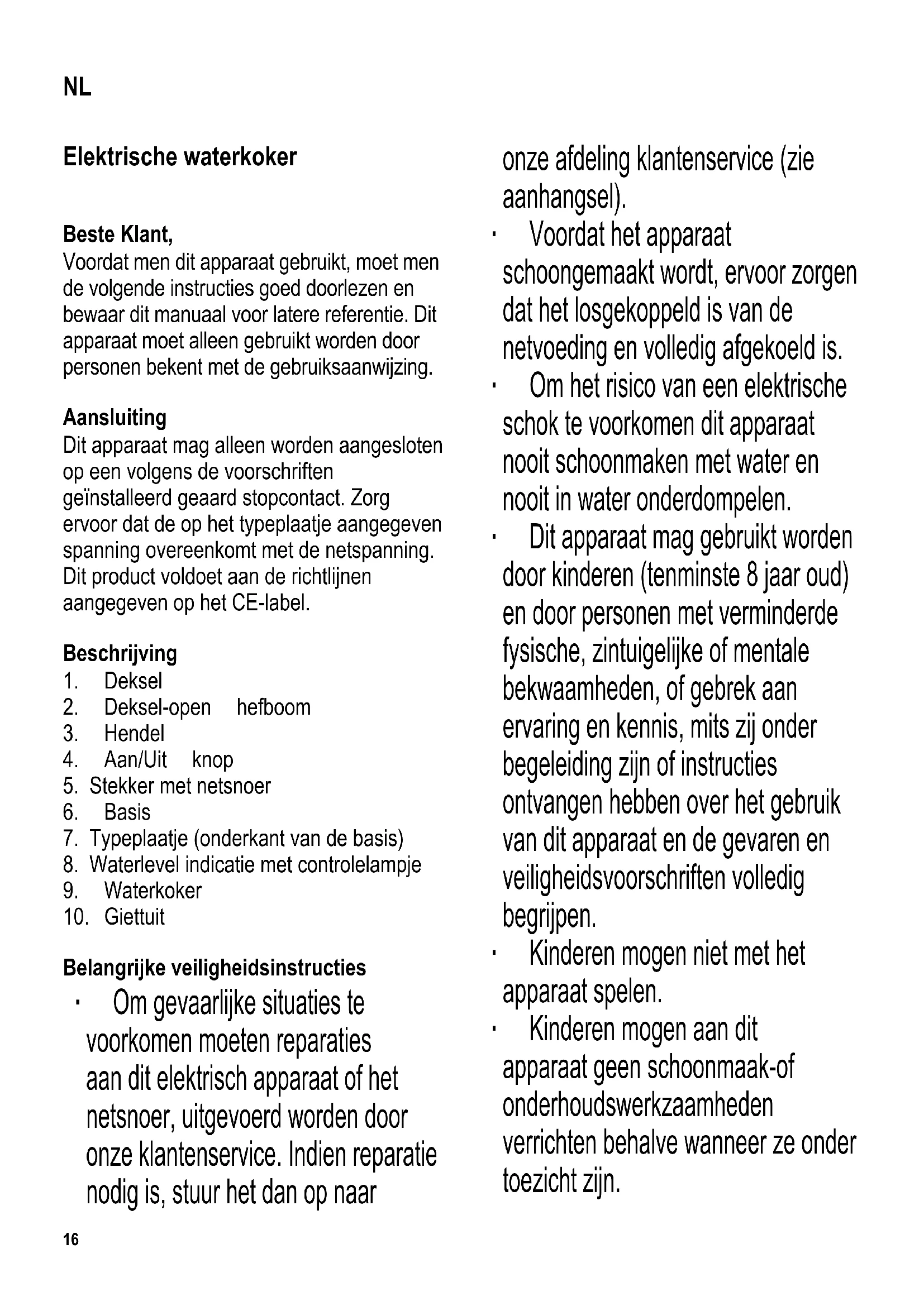 Belangrijke veiligheidsinstructies ∙ Om gevaarlijke situaties te voorkomen moeten reparaties aan dit elektrisch apparaat of het netsnoer, uitgevoerd worden door onze klantenservice. Indien reparatie nodig is, stuur het dan op naar onze afdeling klantenservice (zie aanhangsel). ∙ Voordat het apparaat schoongemaakt wordt, ervoor zorgen dat het losgekoppeld is van de netvoeding en volledig afgekoeld is. ∙ Om het risico van een elektrische schok te voorkomen dit apparaat nooit schoonmaken met water en nooit in water onderdompelen. ∙ Dit apparaat mag gebruikt worden door kinderen (tenminste 8 jaar oud) en door personen met verminderde fysische, zintuigelijke of mentale bekwaamheden, of gebrek aan ervaring en kennis, mits zij onder begeleiding zijn of instructies ontvangen hebben over het gebruik van dit apparaat en de gevaren en veiligheidsvoorschriften volledig begrijpen. ∙ Kinderen mogen niet met het apparaat spelen. ∙ Kinderen mogen aan dit apparaat geen schoonmaak-of onderhoudswerkzaamheden verrichten behalve wanneer ze onder toezicht zijn. NL17 ∙ Het apparaat en het snoer moeten altijd goed weggehouden worden van kinderen jonger dan 8 jaar. ∙ Dit apparaat is bestemd voor huishoudelijk en ander gelijksoortig gebruik, zoals - in winkels, kantoren of andere gelijksoortige werkomgevingen, - in agrarische werkomgevingen, - door klanten in hotels, motels enz. en gelijksoortige etablissementen, - in bed en breakfast gasthuizen. ∙ Laat de waterkoker tijdens werking niet onbeheerd achter; gebruik alleen zuiver water en let altijd op de maximum/minimum markering wanneer men de waterkoker vult. Overvullen van de waterkoker kan gevaarlijk zijn vanwege kokend water wat uitgestoten kan worden. ∙ Pas ook op voor verbranding door hete stoom wat uitgestoten kan worden. Daarom, tijdens gebruik, geen enkel ander deel van het apparaat aanraken behalve het handvat. ∙ Let op! Tijdens het kookproces en als er heet water uitgeschonken wordt, de deksel altijd gesloten houden. ∙ De waterkoker mag alleen gebruikt worden met de bijgeleverde sokkel (basis). ∙ Verwijder (of zet) de waterkoker nooit (terug op) van de basis als het apparaat aanstaat. ∙ Waarschuwing: houdt kinderen weg van inpakmateriaal, daar deze een bron van gevaar zijn b.v. door verstikking. ∙ Elke keer dat het apparaat wordt gebruikt moet zowel de hoofdeenheid inclusief het netsnoer en elk hulpstuk dat wordt aangebracht, eerst zorgvuldig op eventuele defecten worden gecontroleerd. Ingeval het apparaat, bijvoorbeeld, op een hard oppervlak is gevallen, of wanneer men met overdadige kracht aan het netsnoer getrokken heeft, mag het niet meer gebruikt worden: zelfs een onzichtbare beschadiging kan ongewenste effecten hebben op de gebruiksveiligheid van het apparaat. ∙ Het apparaat mag alleen op een hittebestendig, vlak oppervlak gebruikt worden. ∙ Gebruik dit apparaat niet onder overhangende kastjes of gelijkwaardige voorwerpen; er bestaat gevaar dat de stoom die hieronder vrijkomt, gevangen blijft zitten. ∙ De uitwendige delen zullen heet worden tijdens gebruik en voor een lange periode heet blijven. ∙ Zorg ervoor dat de behuizing en het netsnoer niet in contact komen met open vuur of andere hete oppervlakken zoals18 kookplaten. ∙ Laat het snoer nooit los hangen en zorg ervoor dat het snoer niet in de nabijheid komt van hete delen van de behuizing. ∙ Verwijder altijd de stekker uit het stopcontact; - na gebruik, - wanneer het apparaat niet werkt, - wanneer men het apparaat schoonmaakt. ∙ Wordt dit apparaat op een verkeerde manier gebruikt of worden de veiligheidsregels niet gevolgd, dan zal de fabrikant geen aansprakelijkheid accepteren voor eventuele schades. Thermische beveiliging De vooraf ingestelde thermische beveiliging beschermt het verhittingelement tegen oververhitten wanneer men het apparaat aanzet zonder dat water aanwezig is in de watercontainer of wanneer het element teveel kalkaanslag bevat. Wanneer de thermische beveiliging de waterkoker heeft uitgeschakeld moet men deze voldoende laten afkoelen of men moet de waterkoker ontkalken voordat men deze weer kan aanzetten. Voordat de waterkoker voor het eerst gebruikt wordt ∙ Om de waterkoker schoon te maken, de eerste vulling met water laten koken en dan weggooien. Water koken ∙ Verwijder de watercontainer van de basis. ∙ Open de deksel en vul de container met water tot het gewenste niveau, houdt hierbij altijd de minimale en maximale markering in de gaten. ∙ Sluit de deksel en plaats de container terug op de basis. Stop de stekker in het stopcontact en druk op de Aan/Uit schakelaar; het controlelampje op de waterlevel indicatie zal nu aangaan. ∙ Het kookproces zal nu beginnen. Nadat het kookpunt bereikt is zal het apparaat automatisch uitgeschakeld worden door het ingebouwde stoombeveiligingssysteem. Een piepsignaal zal hoorbaar zijn en de controlelampje gaat uit. ∙ Om het kookproces te onderbreken, zet de Aan/Uit schakelaar naar de Uit positie. ∙ Om heet water uit te gieten moet men de container van de basis verwijderen. ∙ Om te voorkomen dat er hete stoom wordt uitgestoten zorg ervoor dat de deksel gesloten blijft terwijl men water uitgiet. ∙ Verwijder de stekker na gebruik uit het stopcontact. ∙ Laat nooit water in de container. Snoeropwinder De opslag van de snoeropwinder onder de basis helpt om de lengte van het snoer te beperken tijdens het gebruik en vergemakkelijkt het opbergen van het apparaat. Ontkalken Afhankelijk van de waterkwaliteit in uw omgeving, kan kalkaanslag zich opbouwen op het verhittingselement. Het wordt aangeraden om dit op regelmatige basis te verwijderen. Elke garantieclaim zal nietig en ongeldig zijn wanneer het apparaat niet werkt vanwege onvoldoende ontkalken. Een mengsel van 0.5 liter water en 40 ml schoonmaakazijn is hiervoor19 geschikt. ∙ Giet de ontkalker in de container. ∙ Schakel het apparaat aan en laat het mengsel aan de kook komen. ∙ Laat het koken voor een korte periode staan om het 