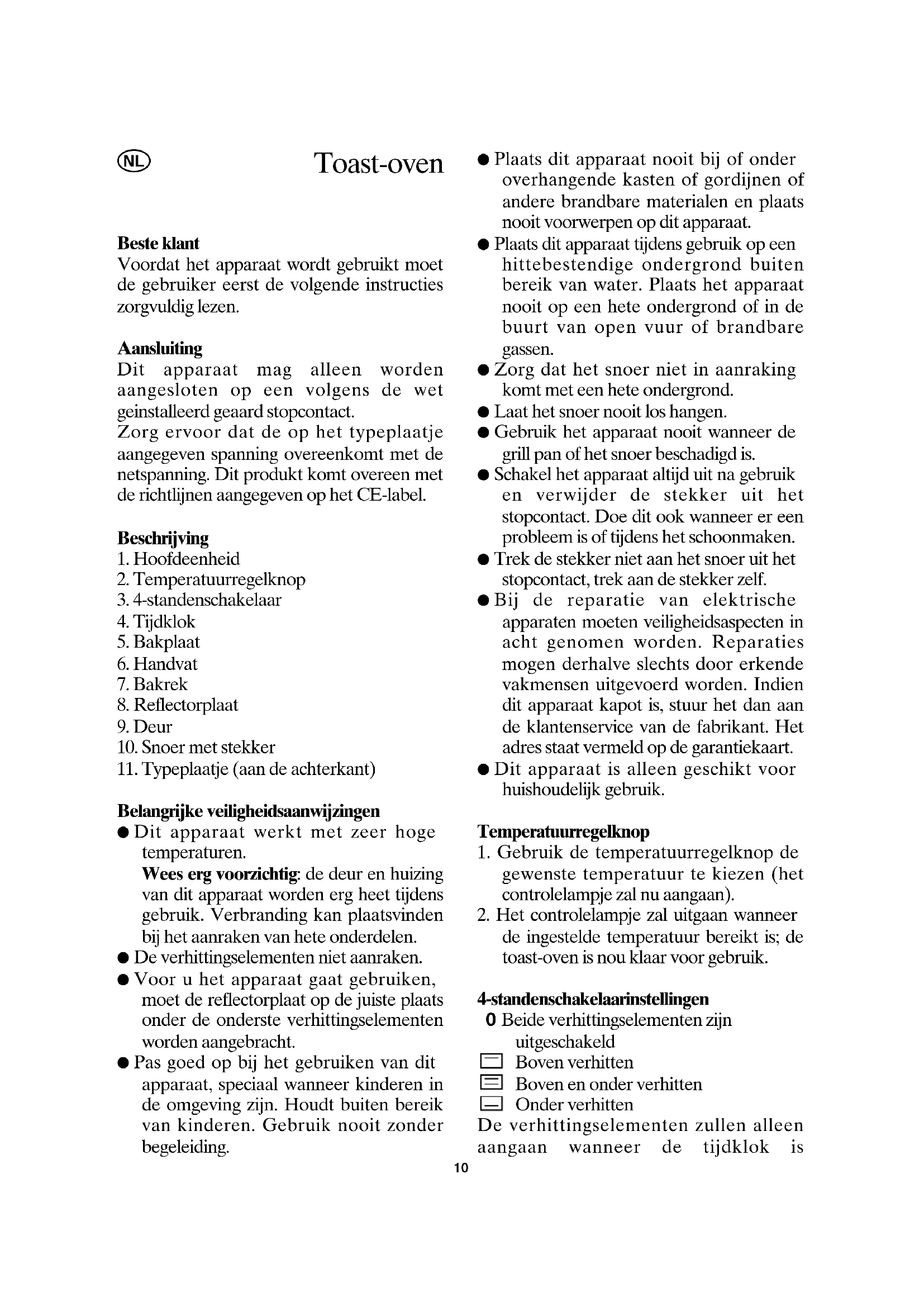 Belangrijke veiligheidsaanwijzingen ● Dit apparaat werkt met zeer hoge temperaturen. Wees erg voorzichtig: de deur en huizing van dit apparaat worden erg heet tijdens gebruik. Verbranding kan plaatsvinden bij het aanraken van hete onderdelen. ● De verhittingselementen niet aanraken. ● Voor u het apparaat gaat gebruiken, moet de reflectorplaat op de juiste plaats onder de onderste verhittingselementen worden aangebracht. ● Pas goed op bij het gebruiken van dit apparaat, speciaal wanneer kinderen in de omgeving zijn. Houdt buiten bereik van kinderen. Gebruik nooit zonder begeleiding. ● Plaats dit apparaat nooit bij of onder overhangende kasten of gordijnen of andere brandbare materialen en plaats nooit voorwerpen op dit apparaat. ● Plaats dit apparaat tijdens gebruik op een hittebestendige ondergrond buiten bereik van water. Plaats het apparaat nooit op een hete ondergrond of in de buurt van open vuur of brandbare gassen. ● Zorg dat het snoer niet in aanraking komt met een hete ondergrond. ● Laat het snoer nooit los hangen. ● Gebruik het apparaat nooit wanneer de grill pan of het snoer beschadigd is. ● Schakel het apparaat altijd uit na gebruik en verwijder de stekker uit het stopcontact. Doe dit ook wanneer er een probleem is of tijdens het schoonmaken. ● Trek de stekker niet aan het snoer uit het stopcontact, trek aan de stekker zelf. ● Bij de reparatie van elektrische apparaten moeten veiligheidsaspecten in acht genomen worden. Reparaties mogen derhalve slechts door erkende vakmensen uitgevoerd worden. Indien dit apparaat kapot is, stuur het dan aan de klantenservice van de fabrikant. Het adres staat vermeld op de garantiekaart. ● Dit apparaat is alleen geschikt voor huishoudelijk gebruik. Temperatuurregelknop