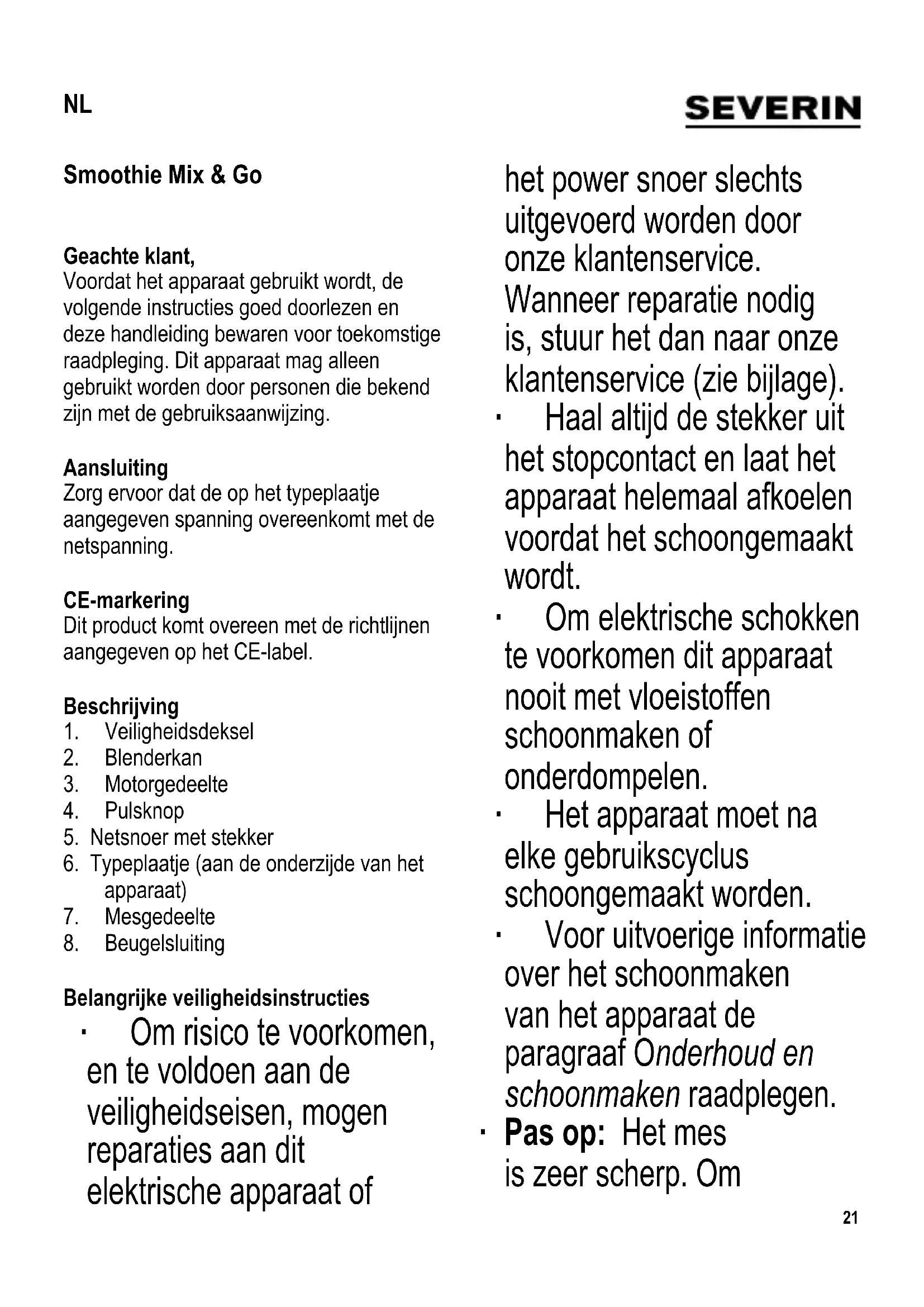 Belangrijke veiligheidsinstructies ∙ Om risico te voorkomen, en te voldoen aan de veiligheidseisen, mogen reparaties aan dit elektrische apparaat of het power snoer slechts uitgevoerd worden door onze klantenservice. Wanneer reparatie nodig is, stuur het dan naar onze klantenservice (zie bijlage). ∙ Haal altijd de stekker uit het stopcontact en laat het apparaat helemaal afkoelen voordat het schoongemaakt wordt. ∙ Om elektrische schokken te voorkomen dit apparaat nooit met vloeistoffen schoonmaken of onderdompelen. ∙ Het apparaat moet na elke gebruikscyclus schoongemaakt worden. ∙ Voor uitvoerige informatie over het schoonmaken van het apparaat de paragraaf Onderhoud en schoonmaken raadplegen. ∙ Pas op: Het mes is zeer scherp. Om NL22 letsel te voorkomen, voorzichtig te werk gaan bij het leegmaken van de blenderkan of het schoonmaken van het apparaat. ∙ Let op: Plaats geen hete ingrediënten in de kan. ∙ Bij het gieten van hete vloeistoffen is voorzichtigheid vereist voor het geval er een straal waterdamp uit het apparaat mocht ontsnappen. ∙ Waarschuwing: Verkeerd gebruik van dit apparaat kan lichamelijk letsel veroorzaken. ∙ Verwijder altijd de stekker uit het stopcontact: - voor het opbouwen of uit elkaar halen van het apparaat, - wanneer het apparaat niet werkt, - wanneer er geen toezicht is, - wanneer men het apparaat schoonmaakt, - na gebruik. ∙ Dit apparaat is bestemd voor huishoudelijk of gelijkwaardig gebruik, zoals - in bedrijfskeukens, in winkels, kantoren of andere bedrijfsruimtes, - in agrarische instellingen, - door klanten in hotels, motels enz. en gelijkwaardige accommodaties, - in bed and breakfast gasthuizen. ∙ Het apparaat mag alleen gebruikt worden door personen met verminderde fysische, zintuigelijke of mentale bekwaamheden, of gebrek van ervaring en kennis, wanneer deze onder begeleiding zijn of instructies ontvangen23 hebben over het gebruik van dit apparaat en volledig de gevaren en veiligheidsvoorschriften begrijpen. ∙ Kinderen mogen dit apparaat niet gebruiken. Het apparaat en het netsnoer moeten goed weggehouden worden van kinderen. ∙ Kinderen mogen niet met het apparaat spelen. ∙ Waarschuwing: Houdt kinderen weg van inpakmateriaal, daar deze een bron van gevaar zijn voor bijv. door verstikking. ∙ Voordat het apparaat wordt gebruikt moet zowel de hoofdeenheid inclusief het netsnoer evenals elk hulpstuk, dat wordt aangebracht, eerst zorgvuldig op eventuele defecten worden gecontroleerd. Ingeval het apparaat, bijvoorbeeld, op een hard oppervlak is gevallen, of wanneer men met overdadige kracht aan het netsnoer heeft getrokken, mag men het niet meer gebruiken: zelfs een onzichtbare beschadiging kan ongewenste effecten hebben op de gebruiksveiligheid van het apparaat. ∙ Dit apparaat mag alleen op een vlakke ondergrond geplaatst worden. Zorg ervoor dat de behuizing en het snoer niet in contact komen met open vuur of andere hete oppervlakken zoals kookplaten. ∙ Laat het snoer nooit los hangen. ∙ Let op: Plaats het mes nooit op het motorgedeelte zonder dat er een blenderkan gemonteerd is. ∙ Raak nooit bewegende delen aan tijdens gebruik, dit is zeer gevaarlijk. ∙ Trek de stekker niet aan het snoer uit het stopcontact, trek aan de stekker zelf. ∙ Wordt dit apparaat op een verkeerde manier gebruikt of worden de veiligheidsregels niet opgevolgd, dan kan de fabrikant niet aansprakelijk worden gesteld voor eventuele schades. Blenderkan ∙ Om de kan na het gebruik af te sluiten, de deksel er op plaatsen en deze goed vastdraaien. Op deze wijze kan de smoothie gemakkelijk opgeborgen of meegenomen worden. ∙ Door het omhoog lichten van de beugelsluiting kan de smoothie direct uit de kan geschonken worden. ∙ Voor het praktische opbergen mag de deksel aan de basis van de blenderkan bevestigd worden. Voor het eerste gebruik Voordat het apparaat voor de eerste keer gebruikt wordt, moeten de blenderkan en het mesgedeelte goed schoongemaakt worden zoals beschreven in de paragraaf Onderhoud en schoonmaken.24 Gebruik voor korte periodes Dit apparaat is ontworpen voor het verwerken van gemiddelde hoeveelheden voedsel; het kan zonder onderbreking voor maximaal 1 minuut gebruikt worden, voordat men het tot kamertemperatuur moet laten afkoelen. Veiligheidsschakelaar Een speciale veiligheidsschakelaar in het motorgedeelte zorgt ervoor dat het apparaat niet geactiveerd kan worden tenzij de blenderkan op de juiste wijze gemonteerd is. Gebruik ∙ Snij de ingrediënten in blokjes van ongeveer 15 mm en doe ze in de blenderkan. ∙ Voor het beste resultaat moet de volgende volgorde aangehouden worden bij het plaatsen van de ingrediënten in de kan:
