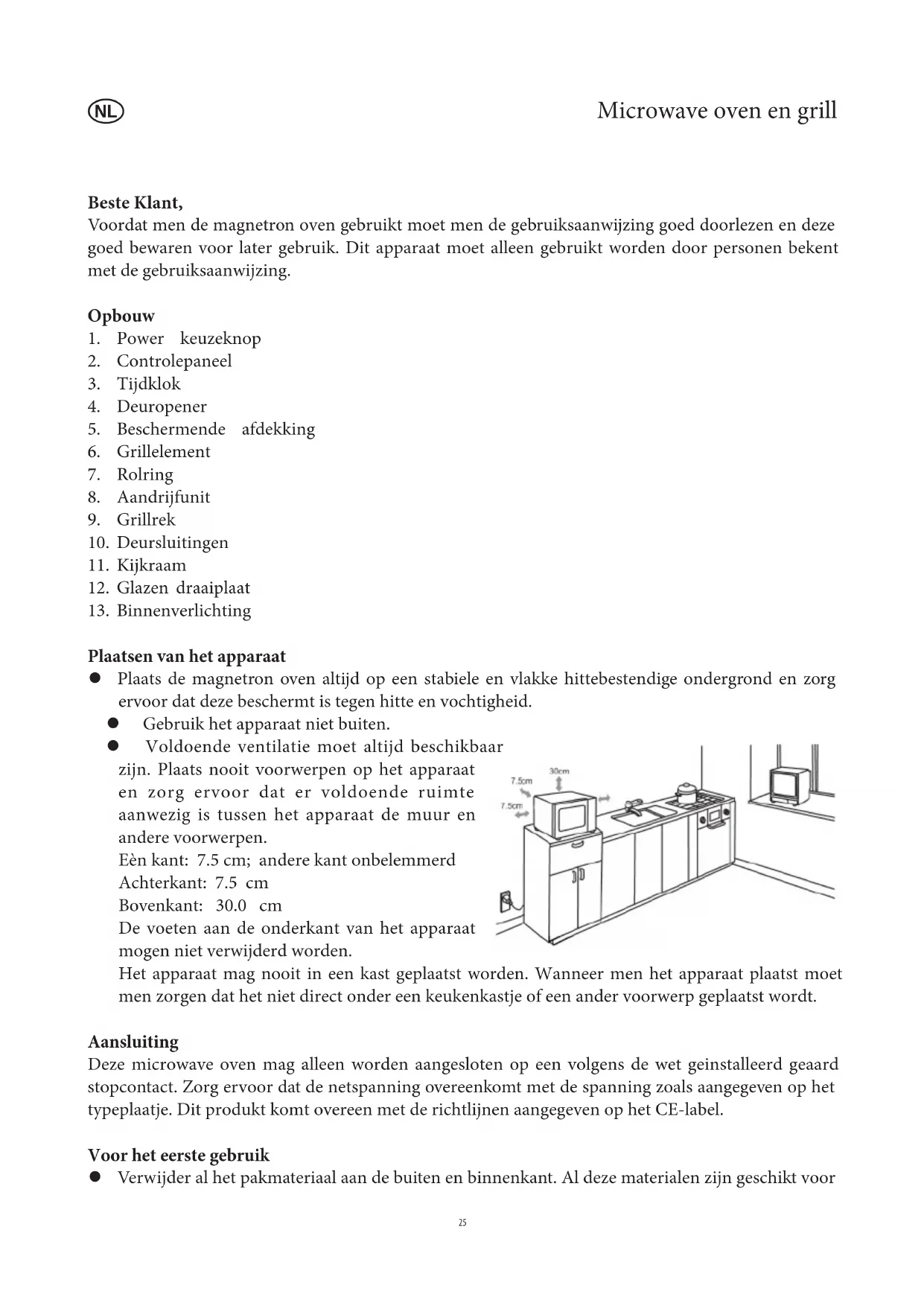 Plaatsen van het apparaat Plaats de magnetron oven altijd op een stabiele en vlakke hittebestendige ondergrond en zorg ervoor dat deze beschermt is tegen hitte en vochtigheid. Gebruik het apparaat niet buiten. Voldoende ventilatie moet altijd beschikbaar zijn. Plaats nooit voorwerpen op het apparaat en zorg ervoor dat er voldoende ruimte aanwezig is tussen het apparaat de muur en andere voorwerpen. Eèn kant: 7.5 cm; andere kant onbelemmerd Achterkant: 7.5 cm Bovenkant: 30.0 cm De voeten aan de onderkant van het apparaat mogen niet verwijderd worden. Het apparaat mag nooit in een kast geplaatst worden. Wanneer men het apparaat plaatst moet men zorgen dat het niet direct onder een keukenkastje of een ander voorwerp geplaatst wordt. Aansluiting Deze microwave oven mag alleen worden aangesloten op een volgens de wet geinstalleerd geaard stopcontact. Zorg ervoor dat de netspanning overeenkomt met de spanning zoals aangegeven op het typeplaatje. Dit produkt komt overeen met de richtlijnen aangegeven op het CE-label. Voor het eerste gebruik Verwijder al het pakmateriaal aan de buiten en binnenkant. Al deze materialen zijn geschikt voor
