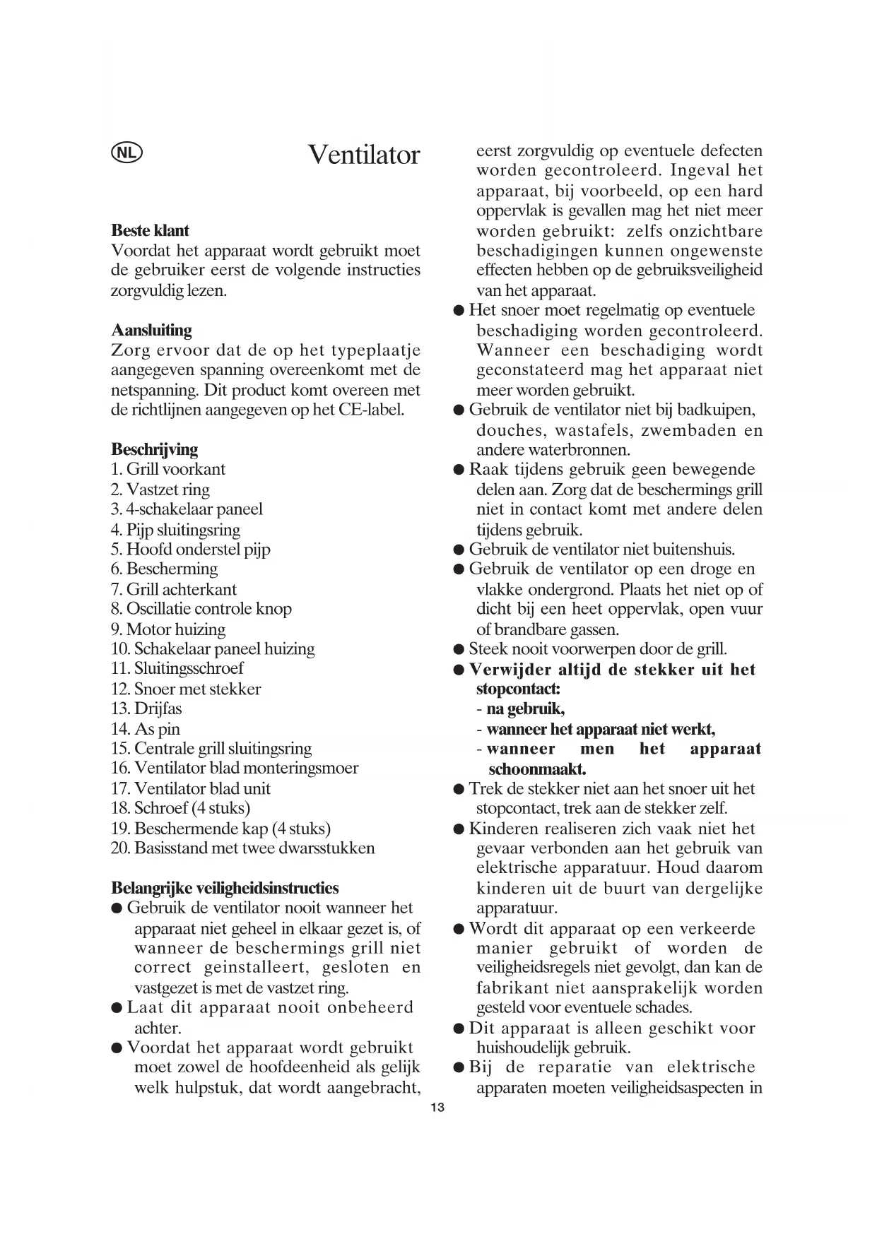 - Gebruik de ventilator nooit wanneer het apparaat niet geheel in elkaar gezet is, of wanneer de beschermings grill niet correct geinstalleert, gesloten en vastgezet is met de vastzet ring.