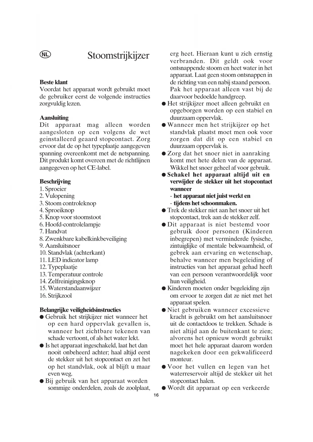 Belangrijke veiligheidsinstructies ● Gebruik het strijkijzer niet wanneer het op een hard oppervlak gevallen is, wanneer het zichtbare tekenen van schade vertoont, of als het water lekt. ● Is het apparaat ingeschakeld, laat het dan nooit onbeheerd achter; haal altijd eerst de stekker uit het stopcontact en zet het op het standvlak, ook al blijft u maar even weg. ● Bij gebruik van het apparaat worden sommige onderdelen, zoals de zoolplaat, erg heet. Hieraan kunt u zich ernstig verbranden. Dit geldt ook voor ontsnappende stoom en heet water in het apparaat. Laat geen stoom ontsnappen in de richting van een nabij staand persoon. Pak het apparaat alleen vast bij de daarvoor bedoelde handgreep. ● Het strijkijzer moet alleen gebruikt en opgeborgen worden op een stabiel en duurzaam oppervlak. ● Wanneer men het strijkijzer op het standvlak plaatst moet men ook voor zorgen dat dit op een stabiel en duurzaam oppervlak is. ● Zorg dat het snoer niet in aanraking komt met hete delen van de apparaat. Wikkel het snoer geheel af voor gebruik. ● Schakel het apparaat altijd uit en verwijder de stekker uit het stopcontact wanneer - het apparaat niet juist werkt en - tijdens het schoonmaken. ● Trek de stekker niet aan het snoer uit het stopcontact, trek aan de stekker zelf. ● Dit apparaat is niet bestemd voor gebruik door personen (Kinderen inbegrepen) met verminderde fysische, zintuiglijke of mentale bekwaamheid, of gebrek aan ervaring en wetenschap, behalve wanneer men begeleiding of instructies van het apparaat gehad heeft van een persoon verantwoordelijk voor hun veiligheid. ● Kinderen moeten onder begeleiding zijn om ervoor te zorgen dat ze niet met het apparaat spelen. ● Niet gebruiken wanneer excessieve kracht is gebruikt om het aansluitsnoer uit de contactdoos te trekken. Schade is niet altijd aan de buitenkant te zien; alvorens het opnieuw wordt gebruikt moet het hele apparaat daarom worden nagekeken door een gekwalificeerd monteur. ● Voor het vullen en legen van het waterreservoir altijd de stekker uit het stopcontact halen. ● Wordt dit apparaat op een verkeerde