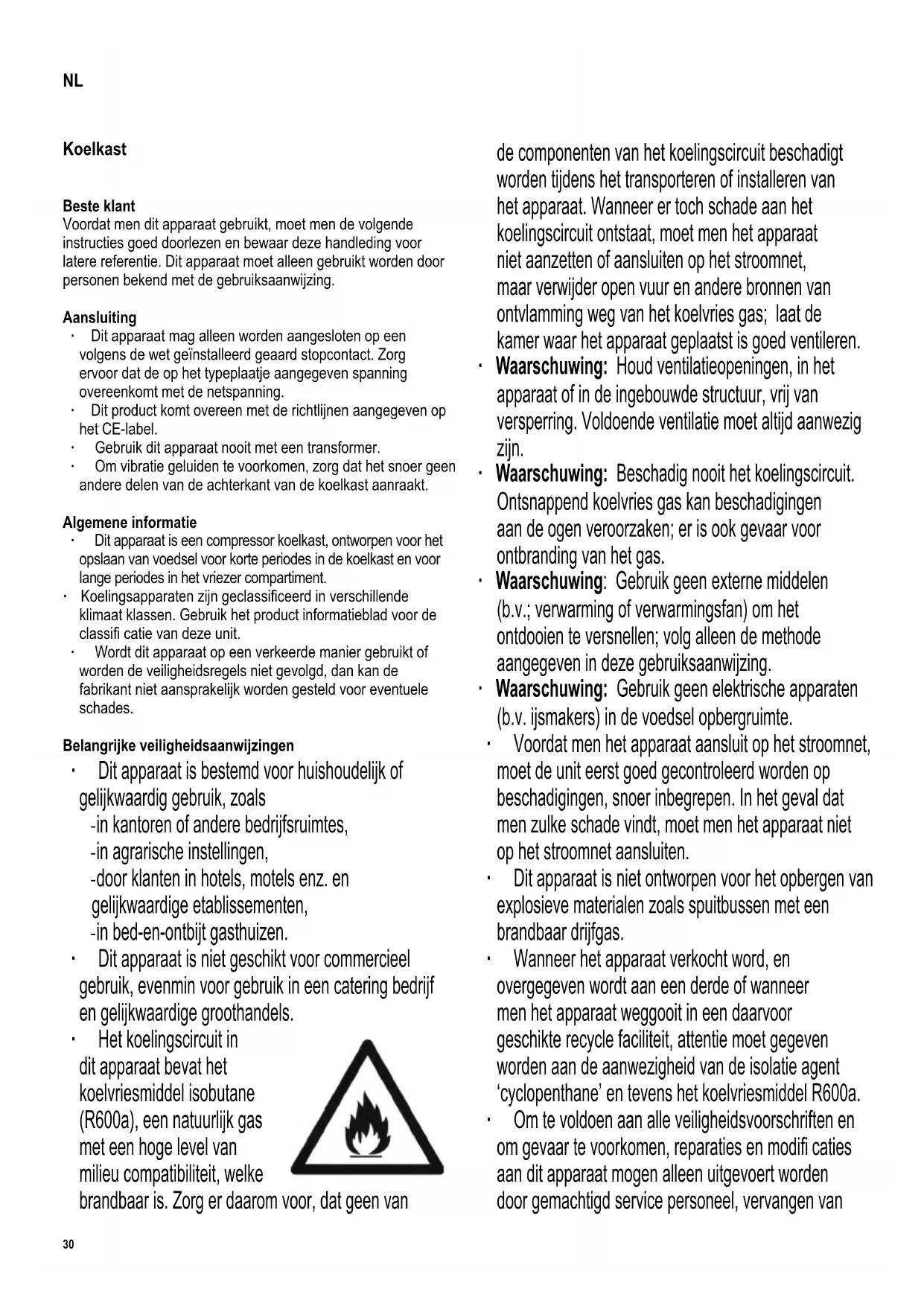 Dégivrage automatique : partie congélateur non Dégivrage automatique : partie réfrigérateur oui Temps de conservation des aliments en cas de panne, H 25 Capacité de congélation, kg/24 H 4 Classe climatique T Plage de température ambiante, °C 16-43°C Emission de bruit 41 Dimensions (H x L x P) en mm 1850 x 600 x 650 Poids, kg 67.5 Alimentation Voir plaque signalétique30 Koelkast Beste klant Voordat men dit apparaat gebruikt, moet men de volgende instructies goed doorlezen en bewaar deze handleding voor latere referentie. Dit apparaat moet alleen gebruikt worden door personen bekend met de gebruiksaanwijzing. Aansluiting ∙ Dit apparaat mag alleen worden aangesloten op een volgens de wet geïnstalleerd geaard stopcontact. Zorg ervoor dat de op het typeplaatje aangegeven spanning overeenkomt met de netspanning. ∙ Dit product komt overeen met de richtlijnen aangegeven op het CE-label. ∙ Gebruik dit apparaat nooit met een transformer. ∙ Om vibratie geluiden te voorkomen, zorg dat het snoer geen andere delen van de achterkant van de koelkast aanraakt. Algemene informatie ∙ Dit apparaat is een compressor koelkast, ontworpen voor het opslaan van voedsel voor korte periodes in de koelkast en voor lange periodes in het vriezer compartiment. ∙ Koelingsapparaten zijn geclassifi ceerd in verschillende klimaat klassen. Gebruik het product informatieblad voor de classifi catie van deze unit. ∙ Wordt dit apparaat op een verkeerde manier gebruikt of worden de veiligheidsregels niet gevolgd, dan kan de fabrikant niet aansprakelijk worden gesteld voor eventuele schades. Belangrijke veiligheidsaanwijzingen ∙ Dit apparaat is bestemd voor huishoudelijk of gelijkwaardig gebruik, zoals - in kantoren of andere bedrijfsruimtes, - in agrarische instellingen, - door klanten in hotels, motels enz. en gelijkwaardige etablissementen, - in bed-en-ontbijt gasthuizen. ∙ Dit apparaat is niet geschikt voor commercieel gebruik, evenmin voor gebruik in een catering bedrijf en gelijkwaardige groothandels. ∙ Het koelingscircuit in dit apparaat bevat het koelvriesmiddel isobutane (R600a), een natuurlijk gas met een hoge level van milieu compatibiliteit, welke brandbaar is. Zorg er daarom voor, dat geen van de componenten van het koelingscircuit beschadigt worden tijdens het transporteren of installeren van het apparaat. Wanneer er toch schade aan het koelingscircuit ontstaat, moet men het apparaat niet aanzetten of aansluiten op het stroomnet, maar verwijder open vuur en andere bronnen van ontvlamming weg van het koelvries gas; laat de kamer waar het apparaat geplaatst is goed ventileren. ∙ Waarschuwing: Houd ventilatieopeningen, in het apparaat of in de ingebouwde structuur, vrij van versperring. Voldoende ventilatie moet altijd aanwezig zijn. ∙ Waarschuwing: Beschadig nooit het koelingscircuit. Ontsnappend koelvries gas kan beschadigingen aan de ogen veroorzaken; er is ook gevaar voor ontbranding van het gas. ∙ Waarschuwing: Gebruik geen externe middelen (b.v.; verwarming of verwarmingsfan) om het ontdooien te versnellen; volg alleen de methode aangegeven in deze gebruiksaanwijzing. ∙ Waarschuwing: Gebruik geen elektrische apparaten (b.v. ijsmakers) in de voedsel opbergruimte. ∙ Voordat men het apparaat aansluit op het stroomnet, moet de unit eerst goed gecontroleerd worden op beschadigingen, snoer inbegrepen. In het geval dat men zulke schade vindt, moet men het apparaat niet op het stroomnet aansluiten. ∙ Dit apparaat is niet ontworpen voor het opbergen van explosieve materialen zoals spuitbussen met een brandbaar drijfgas. ∙ Wanneer het apparaat verkocht word, en overgegeven wordt aan een derde of wanneer men het apparaat weggooit in een daarvoor geschikte recycle faciliteit, attentie moet gegeven worden aan de aanwezigheid van de isolatie agent ‘cyclopenthane’ en tevens het koelvriesmiddel R600a. ∙ Om te voldoen aan alle veiligheidsvoorschriften en om gevaar te voorkomen, reparaties en modifi caties aan dit apparaat mogen alleen uitgevoert worden door gemachtigd service personeel, vervangen van NL31 snoer inbegrepen. ∙ Dit apparaat mag gebruikt worden door kinderen (tenminste 8 jaar oud) en door personen met verminderde fysische, zintuiglijke of mentale bekwaamheden, of gebrek van ervaring en kennis, wanneer deze onder begeleiding zijn of instructies ontvangen hebben over het gebruik van dit apparaat en volledig de gevaren en veiligheidsvoorschriften begrijpen. ∙ Kinderen mogen niet met het apparaat spelen. ∙ Kinderen mogen niet worden toegestaan om schoonmaak of onderhoud werk aan deze apparaten te doen tenzij onder begeleiding. ∙ Voor regelmatig schoonmaken bevelen wij aan dat men warm water met wat zachte zeep gebruikt. Voor uitvoerige informatie over het schoonmaken van het apparaat, raadpleeg de sectie Ontdooien en schoonmaken. ∙ Waarschuwing: verwijder nooit de afdekking van het binnenverlichting LED lampje. Wanneer er een defect is, neem dan contact op met onze klantenservice voor assistentie (zie aanhangsel). ∙ Om gevaar van persoonlijke ongelukken te voorkomen of schade aan het apparaat, mag dit apparaat alleen vervoert worden in de originele verpakking. ∙ Waarschuwing: Houdt kinderen weg van inpakmateriaal, daar deze een bron van gevaar zijn b.v. door verstikking. ∙ Het ijs wat men verwijdert tijdens het ontdooien is niet geschikt voor menselijke consumptie. ∙ Het snoer moet regelmatig op eventuele beschadiging worden gecontroleerd. Wanneer een beschadiging wordt geconstateerd mag het apparaat niet meer worden gebruikt. ∙ Om gevaar van brand te voorkomen, plaats geen thermo- elektrische apparaten boven op de apparaat. Plaats nooit containers met vloeistoffen op de unit: dit om voorkomen dat lekken of ontsnappen van vloeistoffen de elektrische isolatie beschadigd. ∙ Deze unit is alleen ontworpen voor het opbergen van voedsel. ∙ Alcoholische dranken mogen alleen opgeborgen worden in gesloten containers en in rechtopstaande positie. ∙ Plaat