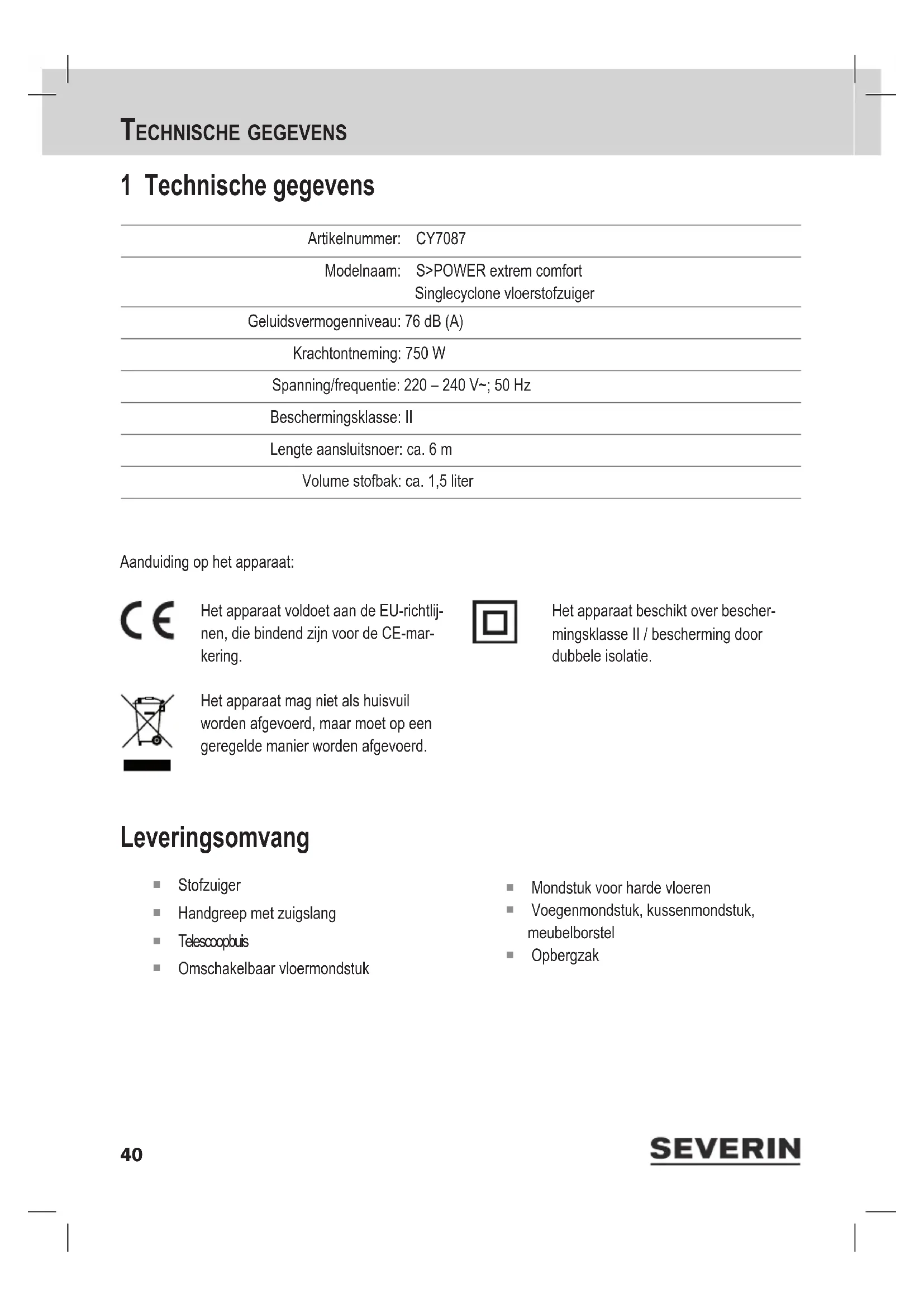 Remettre en marche l’appareil refroidi.37 eliminaTion Problème Cause/Solution L’appareil n’aspire pas beaucoup de saletés et la puissance d’aspi- ration a fortement baissé L’embout utilisé n’est peut-être pas adapté au revêtement de sol. Sélectionner et utiliser l’embout adapté . Le commutateur « Tapis et moquettes/sols durs » de la brosse n’est pas sur la position adaptée au revêtement de sol. Sélectionner la position du commutateur adaptée. L’appareil n’aspire pas beaucoup de saletés et la puissance d’aspi- ration a fortement baissé La puissance d’aspiration réglée n’est peut-être pas adaptée au revêtement de sol. Régler la puissance d’aspiration adaptée. Il faut vider le bac à poussière (« Vidage du bac à poussière » page 33). A cette occasion, il est recommandé de nettoyer aussi les ltres (« Nettoyer le ltre moteur dual » page 34, « Nettoyage de la crépine ltrante » page 34, « Nettoyage du ltre de sortie d’air » page 35). Si ce tableau n’a pas pu vous aider, veuillez vous adresser à notre SAV. Vous trouverez ses coordonnées dans l’annexe de cette notice ou à www.severin.com. 7 Elimination Les appareils avec ce symbole ne doivent pas être jetés avec les ordures ménagères. Ils contiennent des matières premières précieuses, susceptibles d’être recyclées. En les mettant au rebut de ma- nière conforme, vous contribuez à la protection de l’environnement et de la santé d’autrui. Rensei- gnez-vous auprès de votre administration communale ou de votre revendeur pour savoir où mettre correctement l’appareil au rebut. 8 Garantie Les droits de garantie légaux vis-à-vis du vendeur et d’éventuelles garanties proposées par ce dernier per- sistent indépendamment des clauses de garantie dénies ci-après. S’il est nécessaire de réparer l’appareil, contactez notre SAV par téléphone ou par courriel. Vous trouverez ses coordonnées dans les annexes de cette notice. Sinon, adressez-vous directement à votre revendeur pour faire jouer la garantie. SEVERIN vous assure également la garantie du fabricant pendant deux ans à partir de la date d’achat. Pen- dant cette période, nous réparerons gratuitement toutes les pannes imputables à un défaut de matériel ou de fabrication, et qui altèreraient nettement le fonctionnement de l’appareil. Tout autre recours est exclu. Sont exclus de la garantie : Les dommages causés par le non-respect de la notice d’utilisation, une manipula- tion incorrecte, ou l’usure normale, ainsi que les pièces fragiles, telles que p. ex. celles en verre, en plastique ou les ampoules. La garantie perd sa validité en cas d’intervention d’un réparateur non agréé par SEVERIN.38 Hartelijk dank Beste klant, Wij wensen u veel plezier met dit kwaliteitsproduct van SEVERIN en willen u hartelijk bedanken voor uw vertrouwen. Het merk SEVERIN staat al meer dan 120 jaar voor bestendigheid, Duitse kwaliteit en ontwikke- lingskracht. Elk apparaat werd zorgvuldig geproduceerd en gecontroleerd. Met de spreekwoordelijke Sauerlandse grondigheid, nauwkeurigheid en eerlijkheid overtuigt de familieonderne- ming uit Sundern sinds de oprichting in 1892 klanten over de hele wereld met innovatieve producten. In de acht productgroepen Kofe, Ontbijt, Keuken, BBQ, Huishouden, Floorcare, Personal Care en Koelen & Invriezen biedt SEVERIN met meer dan 250 producten een uitgebreid assortiment kleine elektrische appara- tuur. Voor elke gelegenheid het juiste product! Leer de vele producten van SEVERIN kennen en bezoek ons op www.severin.com. De directie en medewerkers van SEVERIN Elektrogeräte GmbH39 Over deze handleiding Deze handleiding bevat belangrijke aanwijzingen voor uw veiligheid en voor het gebruik van het apparaat. Bij niet-inachtneming van de handleiding kan lichamelijk letsel of schade aan het apparaat ontstaan. Bewaar de handleiding goed. Bij doorgeven van het apparaat aan derden geeft u ook de handleiding mee. Lees de handleiding voor het eerste gebruik volledig door. Geïllustreerde Quick Start Guide is bijgevoegd Bij deze handleiding is een geïllustreerde Quick Start Guide gevoegd, die u verdere aanwijzingen geeft over gebruik en verzorging van het apparaat. Deze handleiding en de Quick Start Guide kunnen indien nodig op internet gratis gedownload worden op www.severin.com. Inhoud 1 Technische gegevens 40 2 Veiligheidsaanwijzingen 41 3 Bedienen 44 4 Apparaat onderhouden en reinigen 46 5 Reserveonderdelen/toebehoren 47 6 Problemen zelf verhelpen 48 7 Verwijderen 49 8 Garantie 4940 Technische GeGevens 1 Technische gegevens Artikelnummer: CY7087 Modelnaam: S>POWER extrem comfort Singlecyclone vloerstofzuiger Geluidsvermogenniveau: 76 dB (A) Krachtontneming: 750 W Spanning/frequentie: 220 – 240 V~; 50 Hz Beschermingsklasse: II Lengte aansluitsnoer: ca. 6 m Volume stofbak: ca. 1,5 liter Aanduiding op het apparaat: Het apparaat voldoet aan de EU-richtlij- nen, die bindend zijn voor de CE-mar- kering. Het apparaat mag niet als huisvuil worden afgevoerd, maar moet op een geregelde manier worden afgevoerd. Leveringsomvang Stofzuiger Handgreep met zuigslang Telescoopbuis Omschakelbaar vloermondstuk Mondstuk voor harde vloeren Voegenmondstuk, kussenmondstuk, meubelborstel Opbergzak Het apparaat beschikt over bescher- mingsklasse II / bescherming door dubbele isolatie.41 veiliGheiDsaanwijzinGen 2 Veiligheidsaanwijzingen Bepaalde groepen personen Het apparaat kan door kinderen vanaf 8 jaar alsmede door personen met verminderde fysieke, sensorische of mentale vaardigheden of gebrek aan ervaring en/of kennis bediend worden, als er toezicht op hen gehouden wordt of als zij in het veilige gebruik van het apparaat geïnstrueerd zijn en de daarmee verbonden gevaren kennen. Kinderen mogen niet met het apparaat spelen of op het apparaat gaan zit- ten of staan. Reiniging en gebruikersonderhoud mag niet door kinderen zonder toezicht uitgevoerd worden. Kinderen jonger dan 8 jaar moeten buiten