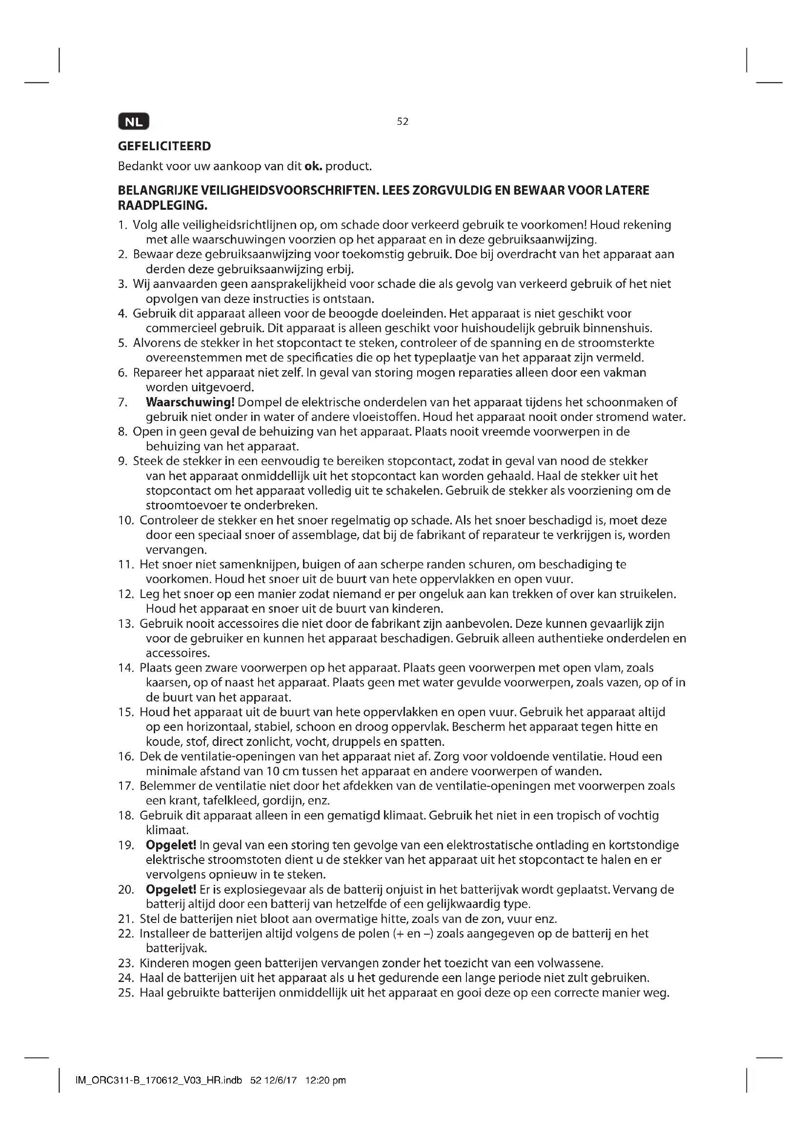 GEFELICITEERD Bedankt voor uw aankoop van dit ok. product. BELANGRIJKE VEILIGHEIDSVOORSCHRIFTEN. LEES ZORGVULDIG EN BEWAAR VOOR LATERE RAADPLEGING.
