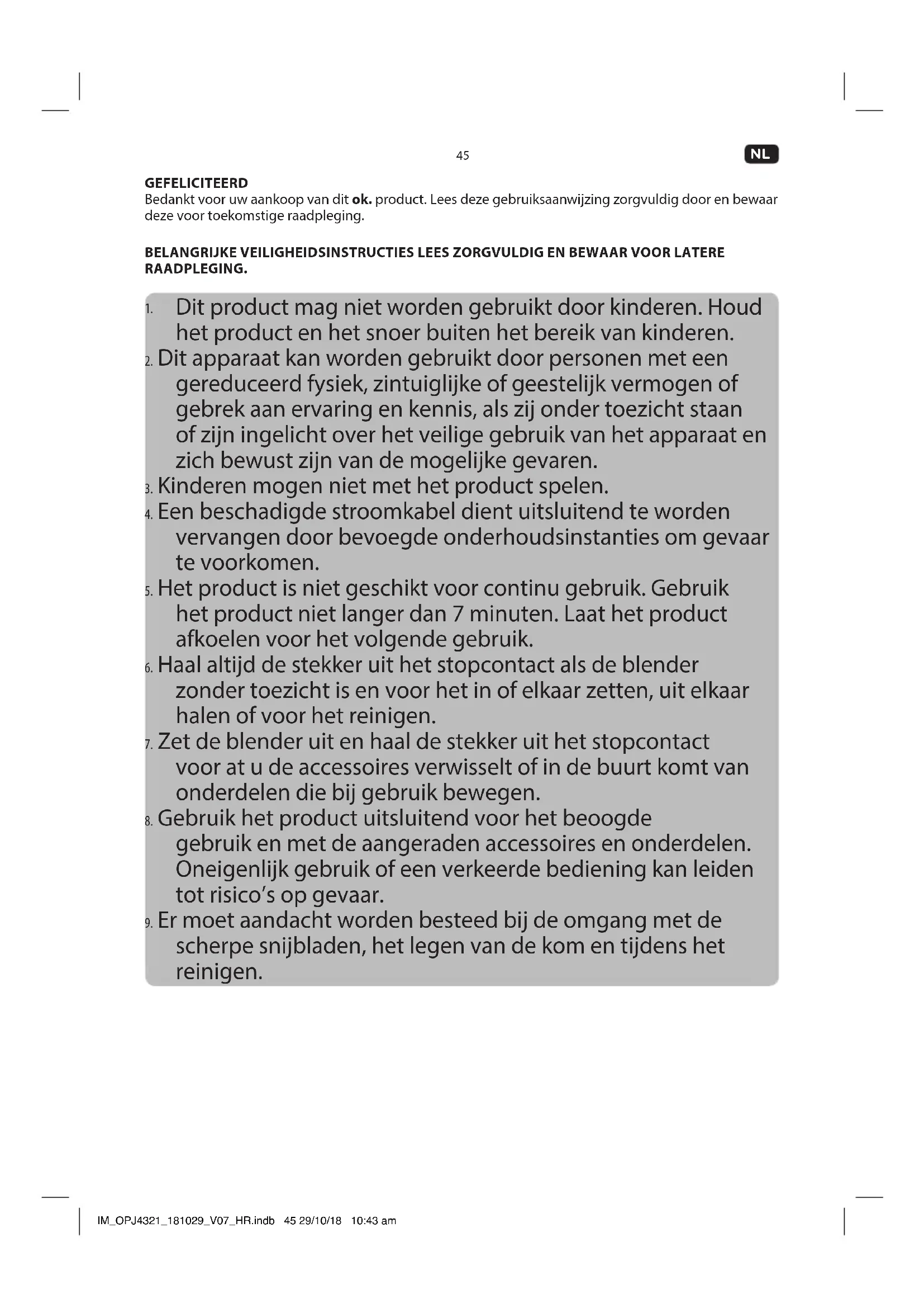 scherpe snijbladen, het legen van de kom en tijdens het reinigen. IM_OPJ4321_181029_V07_HR.indb 45 29/10/18 10:43 am46 Size = A5