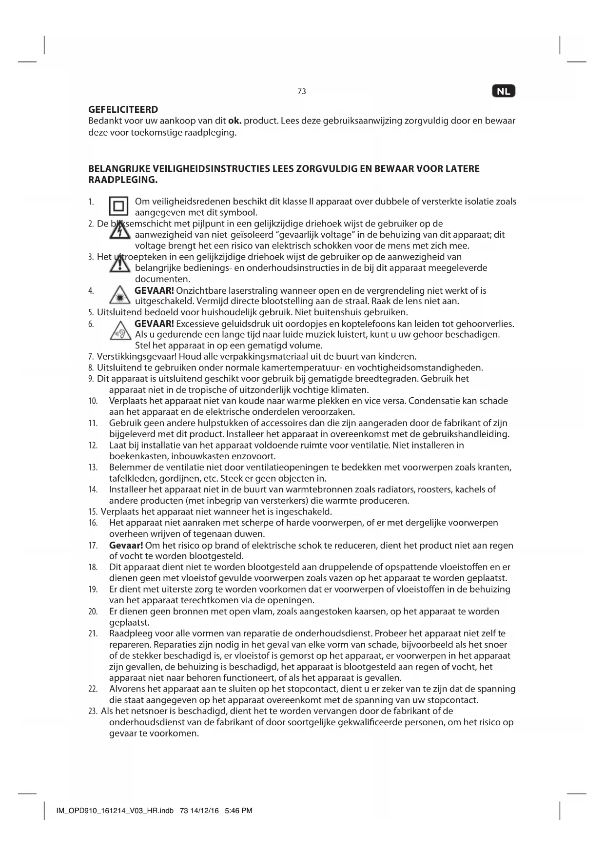 GEFELICITEERD Bedankt voor uw aankoop van dit ok. product. Lees deze gebruiksaanwijzing zorgvuldig door en bewaar deze voor toekomstige raadpleging. BELANGRIJKE VEILIGHEIDSINSTRUCTIES LEES ZORGVULDIG EN BEWAAR VOOR LATERE RAADPLEGING.