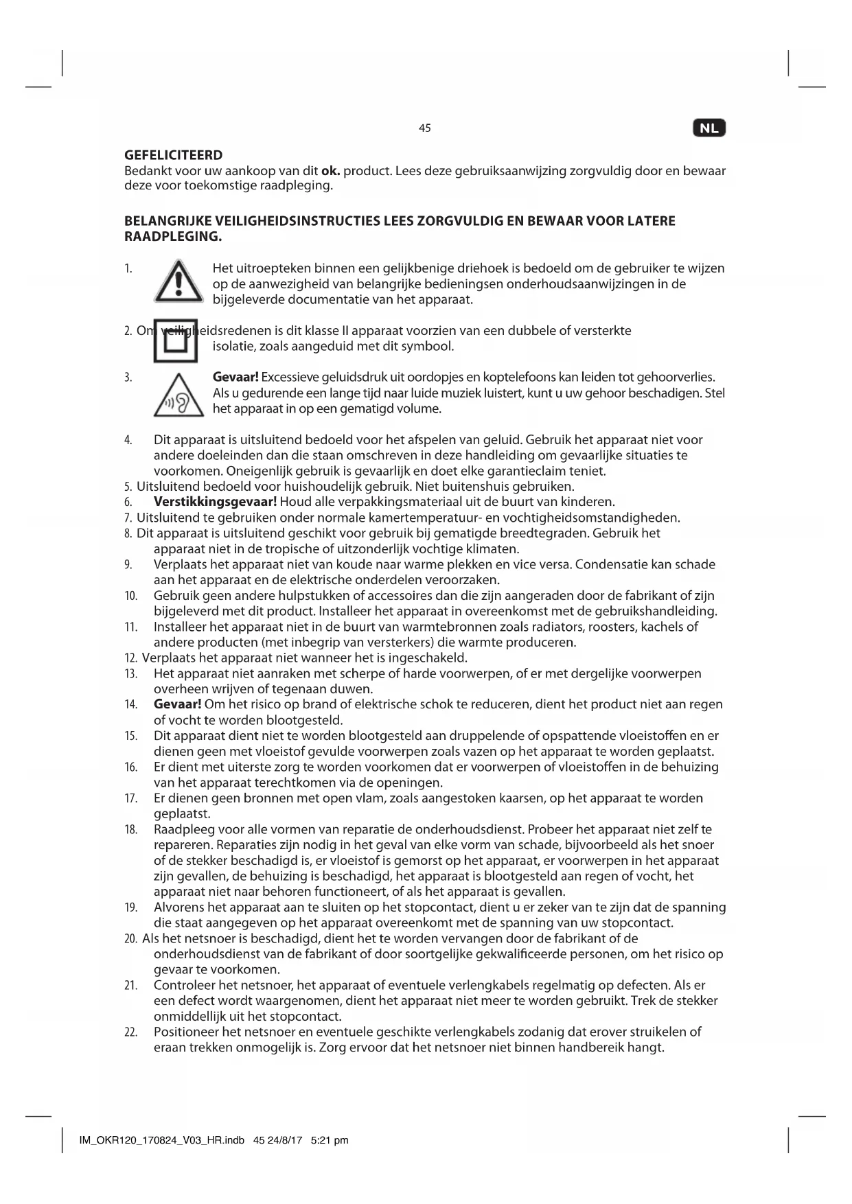 GEFELICITEERD Bedankt voor uw aankoop van dit ok. product. Lees deze gebruiksaanwijzing zorgvuldig door en bewaar deze voor toekomstige raadpleging. BELANGRIJKE VEILIGHEIDSINSTRUCTIES LEES ZORGVULDIG EN BEWAAR VOOR LATERE RAADPLEGING.