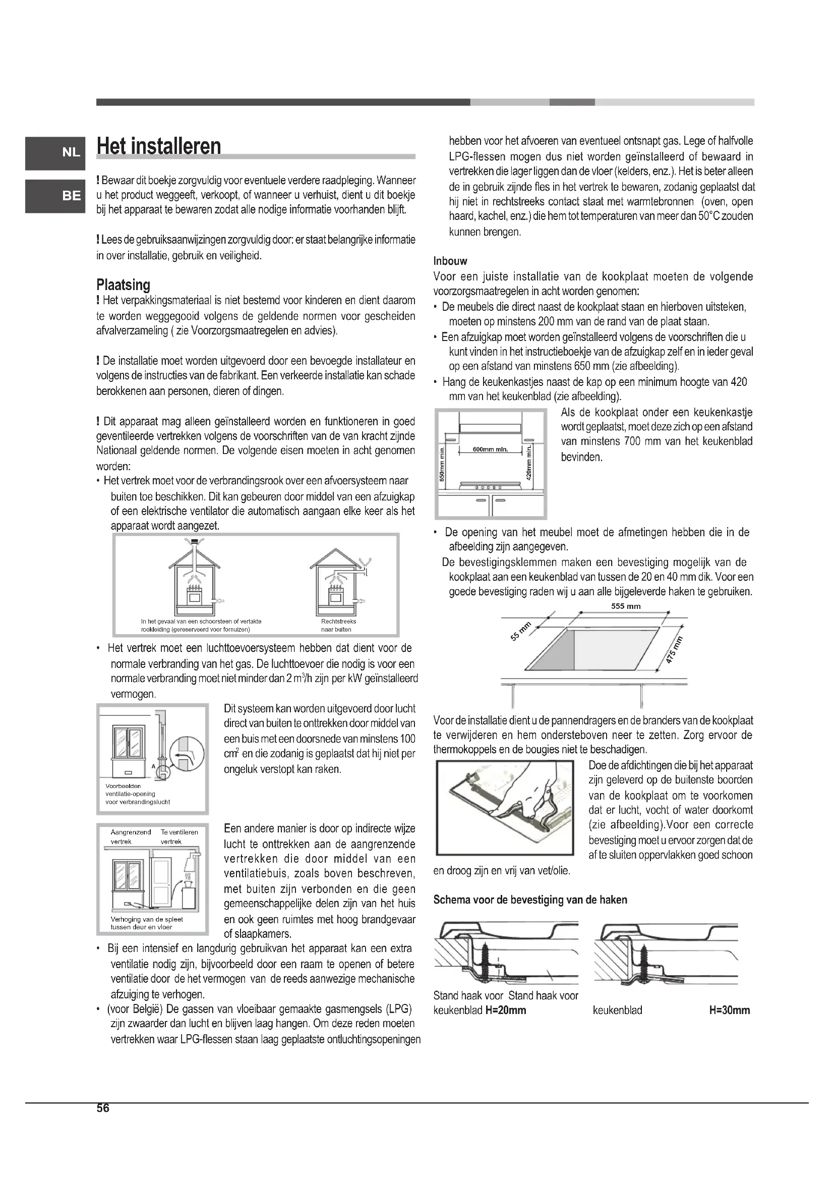 - Gasfornuizen hebben voor een goede werking behoefte aan een regelmatige luchtverversing. Controleer dat bij het installeren aan de vereisten wordt voldaan beschreven in de paragraaf “Plaatsing”.