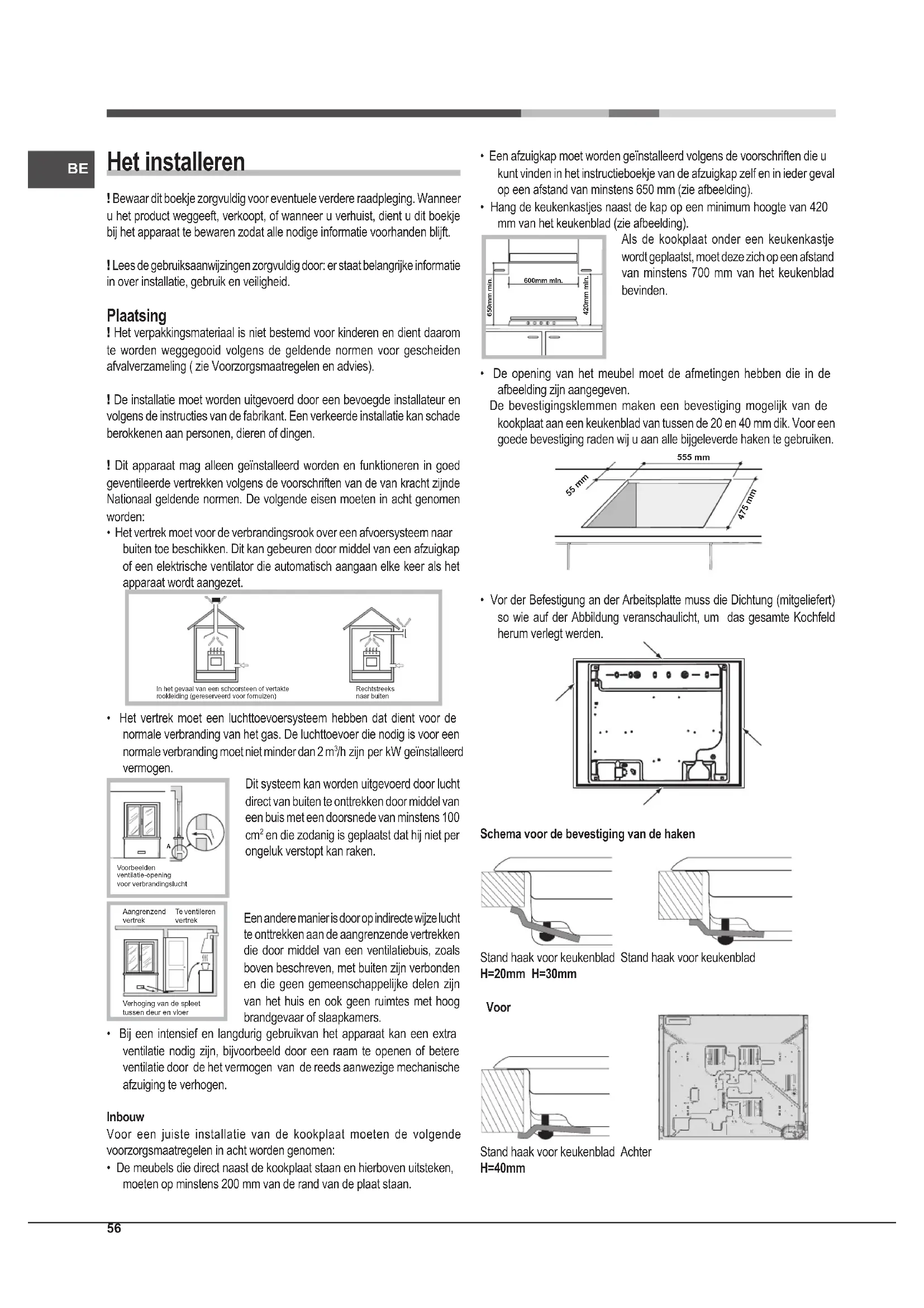 - Bij een intensief en langdurig gebruikvan het apparaat kan een extra ventilatie nodig zijn, bijvoorbeeld door een raam te openen of betere ventilatie door de het vermogen van de reeds aanwezige mechanische afzuiging te verhogen. Inbouw Voor een juiste installatie van de kookplaat moeten de volgende voorzorgsmaatregelen in acht worden genomen: