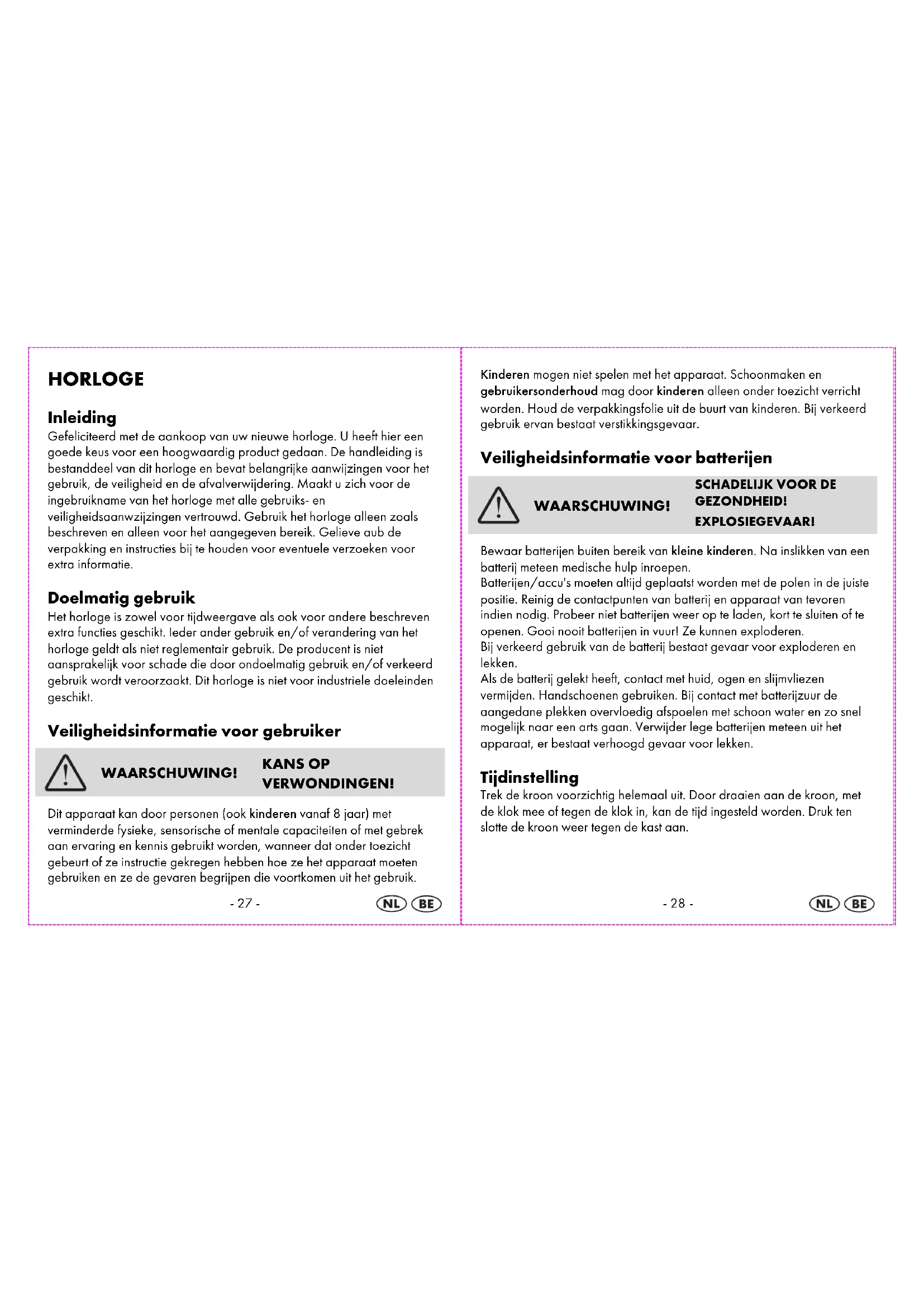 GEZONDHEID! EXPLOSIEGEVAAR! Bewaar batterijen buiten bereik van kleine kinderen. Na inslikken van een batterij meteen medische hulp inroepen. Batterijen/accu's moeten altijd geplaatst worden met de polen in de juiste positie. Reinig de contactpunten van batterij en apparaat van tevoren indien nodig. Probeer niet batterijen weer op te laden, kort te sluiten of te openen. Gooi nooit batterijen in vuur! Ze kunnen exploderen. Bij verkeerd gebruik van de batterij bestaat gevaar voor exploderen en lekken. Als de batterij gelekt heeft, contact met huid, ogen en slijmvliezen vermijden. Handschoenen gebruiken. Bij contact met batterijzuur de aangedane plekken overvloedig afspoelen met schoon water en zo snel mogelijk naar een arts gaan. Verwijder lege batterijen meteen uit het apparaat, er bestaat verhoogd gevaar voor lekken. Tijdinstelling Trek de kroon voorzichtig helemaal uit. Door draaien aan de kroon, met de klok mee of tegen de klok in, kan de tijd ingesteld worden. Druk ten slotte de kroon weer tegen de kast aan.-