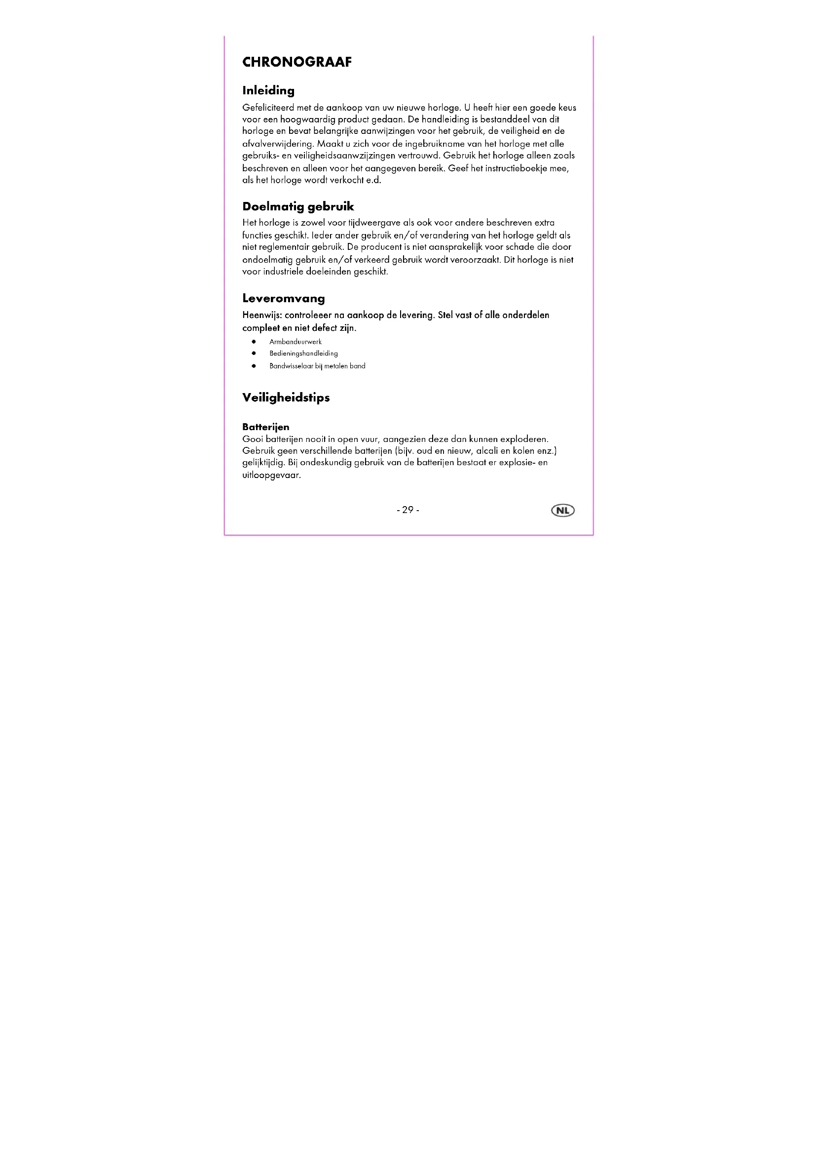 CHRONOGRAAF Inleiding Gefeliciteerd met de aankoop van uw nieuwe horloge. U heeft hier een goede keus voor een hoogwaardig product gedaan. De handleiding is bestanddeel van dit horloge en bevat belangrijke aanwijzingen voor het gebruik, de veiligheid en de afvalverwijdering. Maakt u zich voor de ingebruikname van het horloge met alle gebruiks- en veiligheidsaanwzijzingen vertrouwd. Gebruik het horloge alleen zoals beschreven en alleen voor het aangegeven bereik. Geef het instructieboekje mee, als het horloge wordt verkocht e.d. Doelmatig gebruik Het horloge is zowel voor tijdweergave als ook voor andere beschreven extra functies geschikt. Ieder ander gebruik en/of verandering van het horloge geldt als niet reglementair gebruik. De producent is niet aansprakelijk voor schade die door ondoelmatig gebruik en/of verkeerd gebruik wordt veroorzaakt. Dit horloge is niet voor industriele doeleinden geschikt. Leveromvang Heenwijs: controleeer na aankoop de levering. Stel vast of alle onderdelen compleet en niet defect zijn.