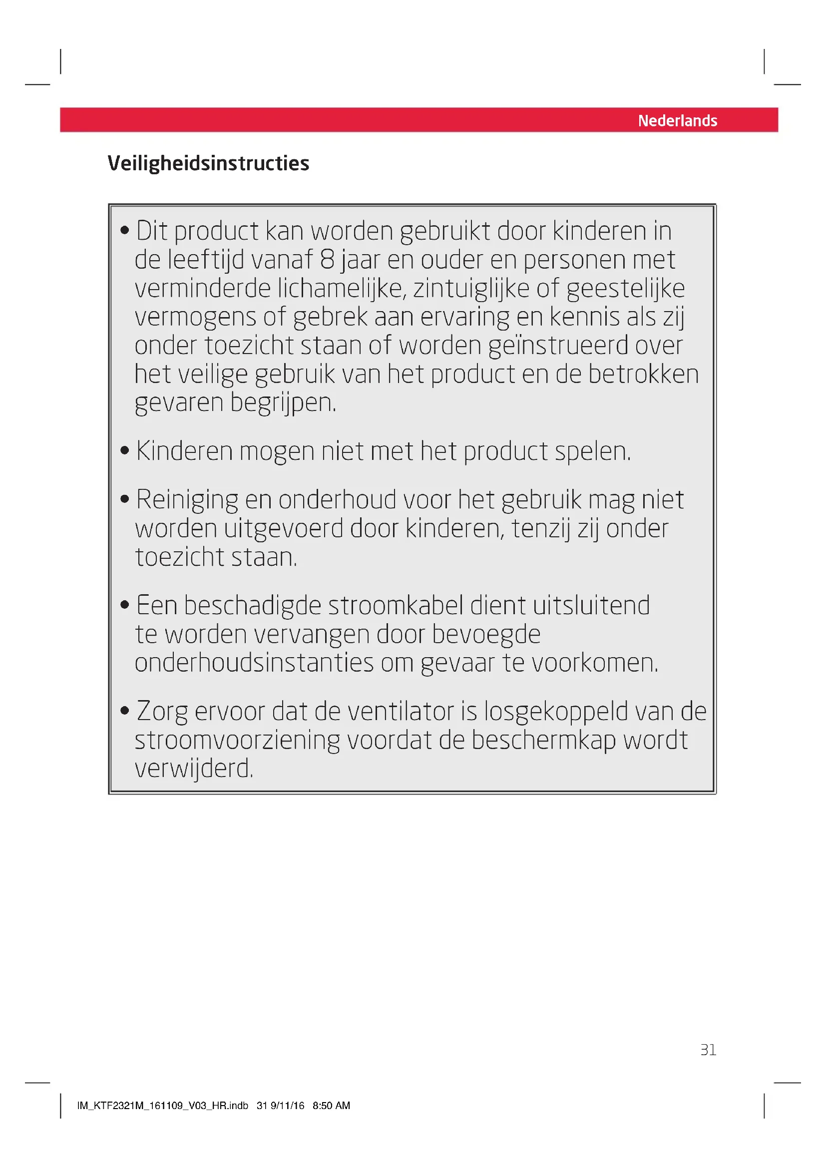 - Zorg ervoor dat de ventilator is losgekoppeld van de stroomvoorziening voordat de beschermkap wordt verwijderd. IM_KTF2321M_161109_V03_HR.indb 31 9/11/16 8:50 AMNederlands