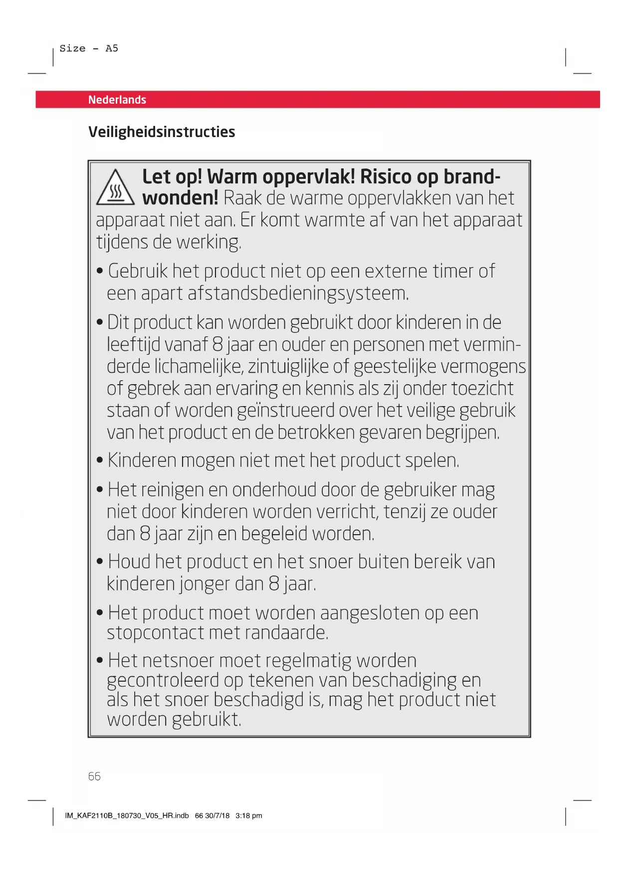 - Het netsnoer moet regelmatig worden gecontroleerd op tekenen van beschadiging en als het snoer beschadigd is, mag het product niet worden gebruikt. IM_KAF2110B_180730_V05_HR.indb 66 30/7/18 3:18 pmNederlands