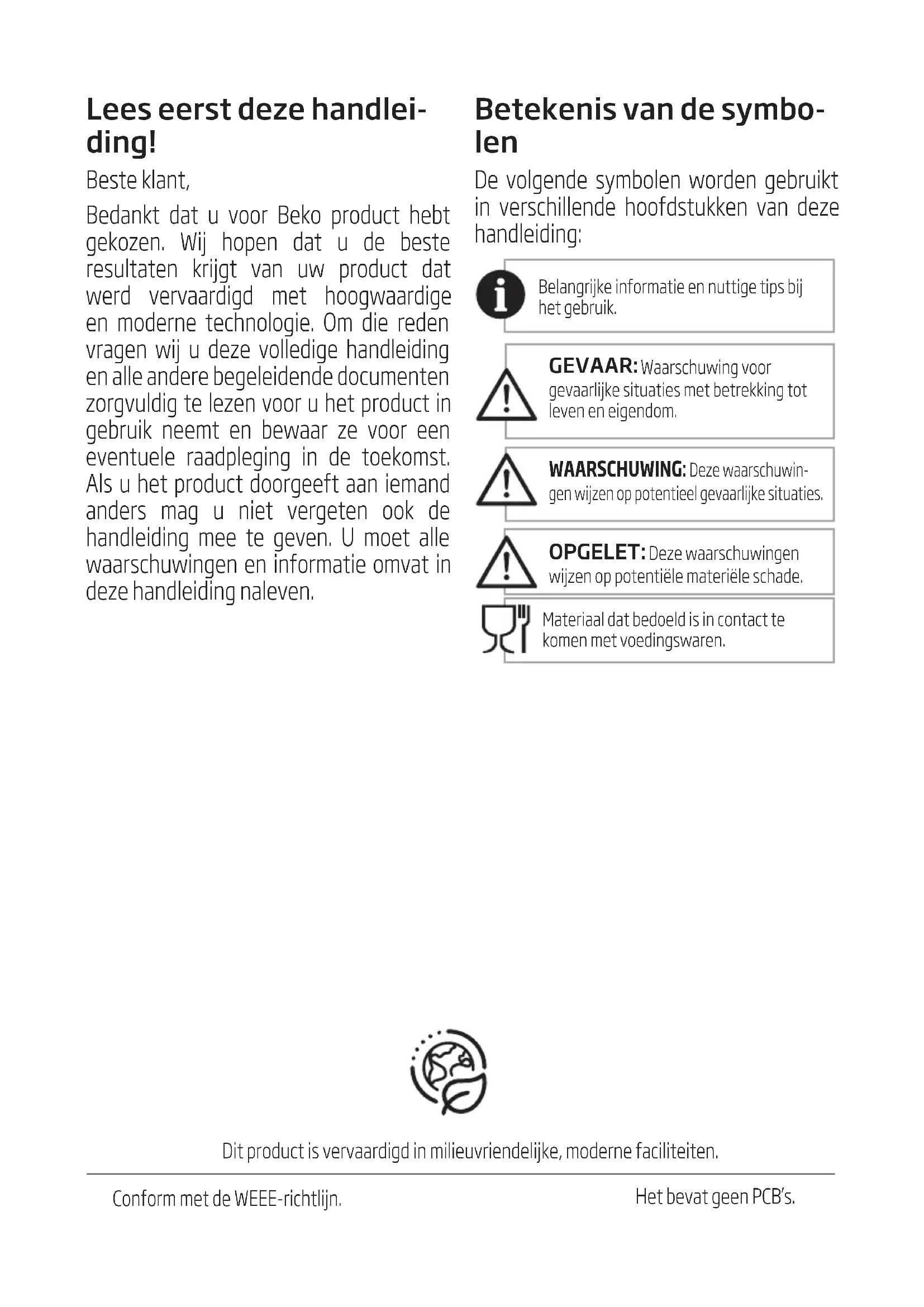 Сенсорные кнопки не чувствительны. Не нажимайте сенсорную кнопку с пе- редней стороны прибора. Нажмите на самую нижнюю часть значка сенсорной кнопки со стороны передней части прибора.Производитель: “Arçelik A.S.” Karaağaç Caddesi No: 2-6 Sütlüce, 34445, Турция Сделано в Китае (Tunbow Electrical (Huizhou) Limited Jiang Bei,82 Hao, 84 Hao, 85 Hao Xiao Qu, Xiao Jin Kou Town, Huizhou City,GuangDong Province, 516023 P.R.C.) Китай Импортер на территории РФ: ООО «БЕКО» Юридический адрес: 601021 Россия, Владимирская обл., Киржачский р-н, дер. Федоровское, ул. Сельская, д. 49 Дата производства включена в серийный номер продукта, указанный на этикетке, расположенной на продукте, а именно: первые две цифры серийного номера обозначают год производства, а последние две – месяц. Например, «10-100001-05» обозначает, что продукт произведен в мае 2010 года.Адрес: 109004, Россия, Москва, ул. Станиславского, д21, стр 1. http://www.beko.ru Телефон горячей линии 8-800-200-23-56 (Звонок бесплатный на всей территории России)Lees eerst deze handlei- ding! Beste klant, Bedankt dat u voor Beko product hebt gekozen. Wij hopen dat u de beste resultaten krijgt van uw product dat werd vervaardigd met hoogwaardige en moderne technologie. Om die reden vragen wij u deze volledige handleiding en alle andere begeleidende documenten zorgvuldig te lezen voor u het product in gebruik neemt en bewaar ze voor een eventuele raadpleging in de toekomst. Als u het product doorgeeft aan iemand anders mag u niet vergeten ook de handleiding mee te geven. U moet alle waarschuwingen en informatie omvat in deze handleiding naleven. Betekenis van de symbo- len De volgende symbolen worden gebruikt in verschillende hoofdstukken van deze handleiding: Belangrijke informatie en nuttige tips bij het gebruik. GEVAAR: Waarschuwing voor gevaarlijke situaties met betrekking tot leven en eigendom. WAARSCHUWING: Deze waarschuwin- gen wijzen op potentieel gevaarlijke situaties. OPGELET: Deze waarschuwingen wijzen op potentiële materiële schade. Materiaal dat bedoeld is in contact te komen met voedingswaren. Dit product is vervaardigd in milieuvriendelijke, moderne faciliteiten. Conform met de WEEE-richtlijn. Het bevat geen PCB’s.244 / NL Volledg automatsch koffezetapparaat / Gebrukershandleiding 1 Belangrijke instructies met betrekking tot veiligheid en het milieu 1 Belangrijke instructies met betrekking tot veiligheid en het milieu Dit deel bevat de veiligheids- instructies die bescherming zullen bieden tegen risico‘s op persoonlijk letsel en materieel verlies. Het niet naleven van deze instructies laat de garan- tie vervallen.