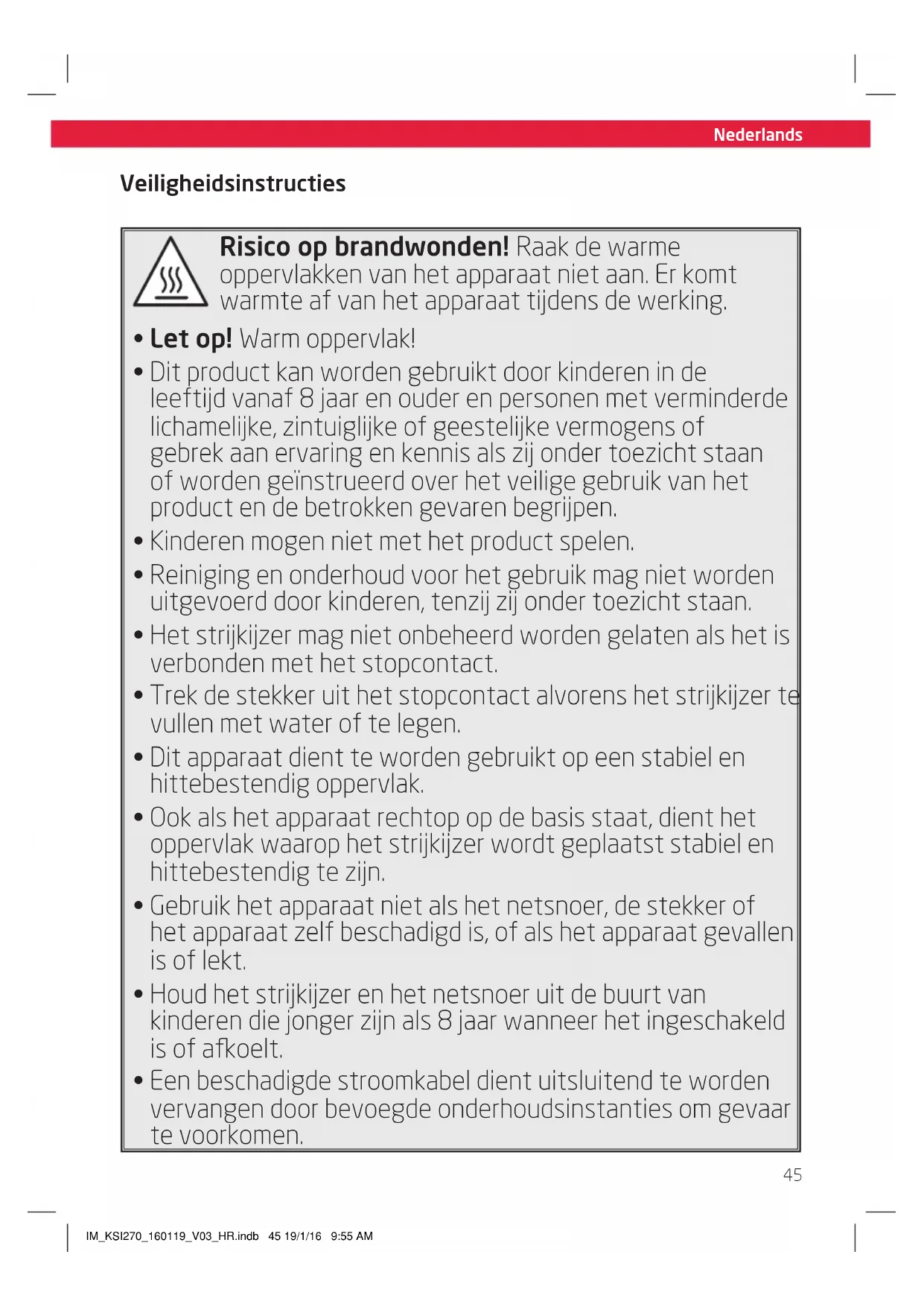 Tijdens de werkig van het apparaat worden hoge temperatures gegenereerd op de behuizing en de zoolplaat, die kuren leiden tot brandwonden indien men ermee in contact komt. Ook kan er gevaar ontstaand door het ontsnappen van stoom of heet water. Richt de