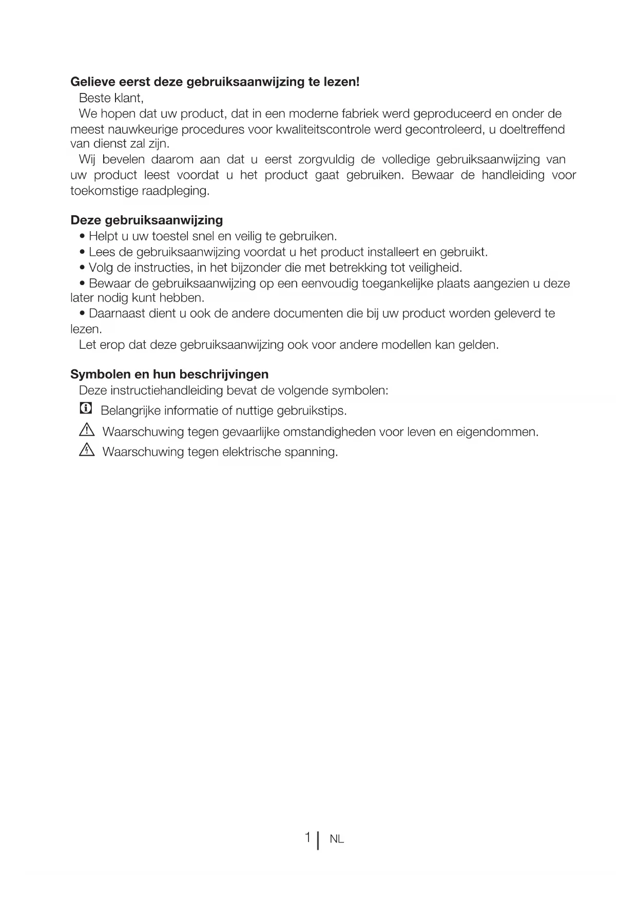 Gelieve eerst deze gebruiksaanwijzing te lezen! Beste klant, We hopen dat uw product, dat in een moderne fabriek werd geproduceerd en onder de meest nauwkeurige procedures voor kwaliteitscontrole werd gecontroleerd, u doeltreffend van dienst zal zijn. Wij bevelen daarom aan dat u eerst zorgvuldig de volledige gebruiksaanwijzing van uw product leest voordat u het product gaat gebruiken. Bewaar de handleiding voor toekomstige raadpleging. Deze gebruiksaanwijzing