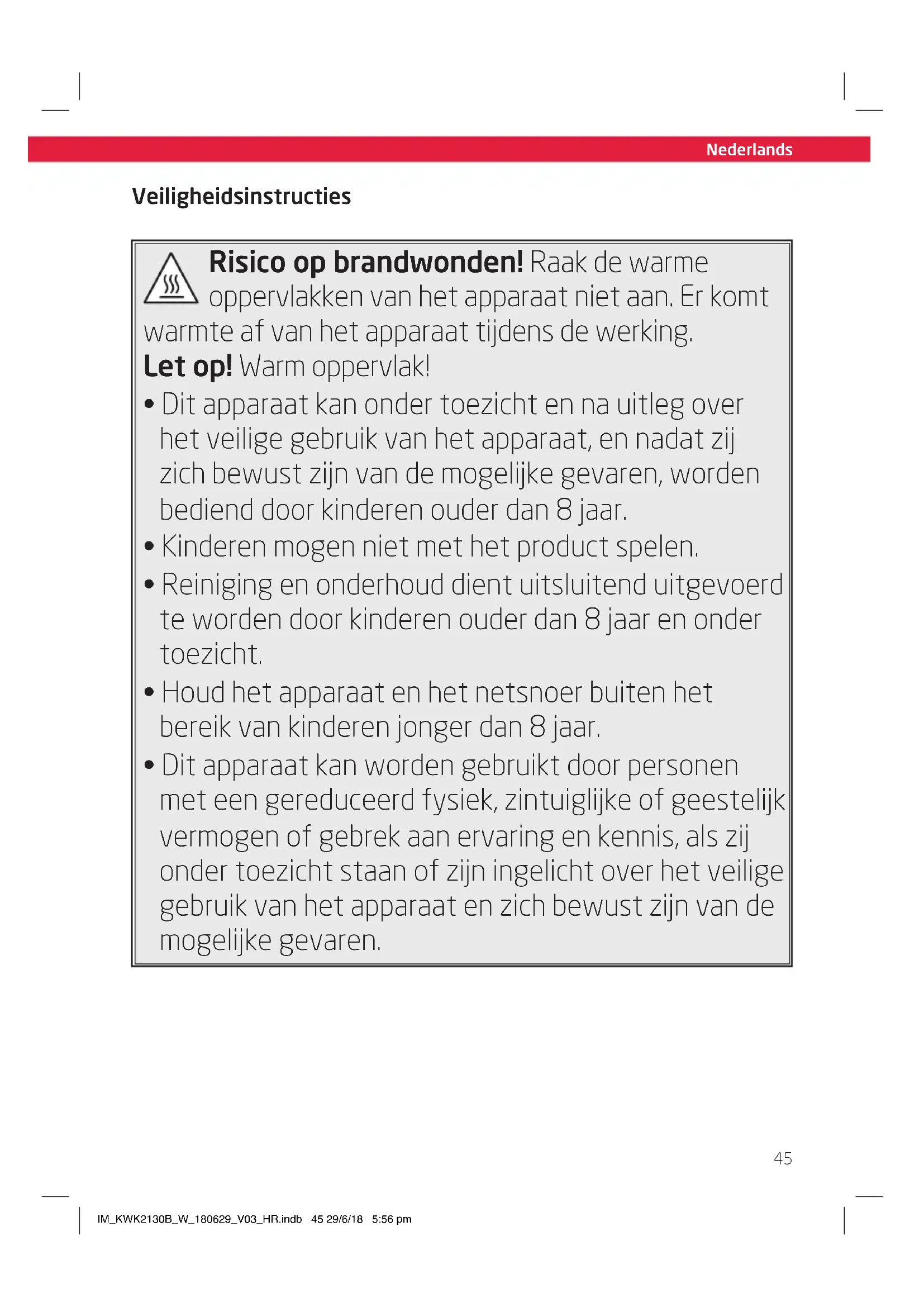 Risico op brandwonden! Raak de warme