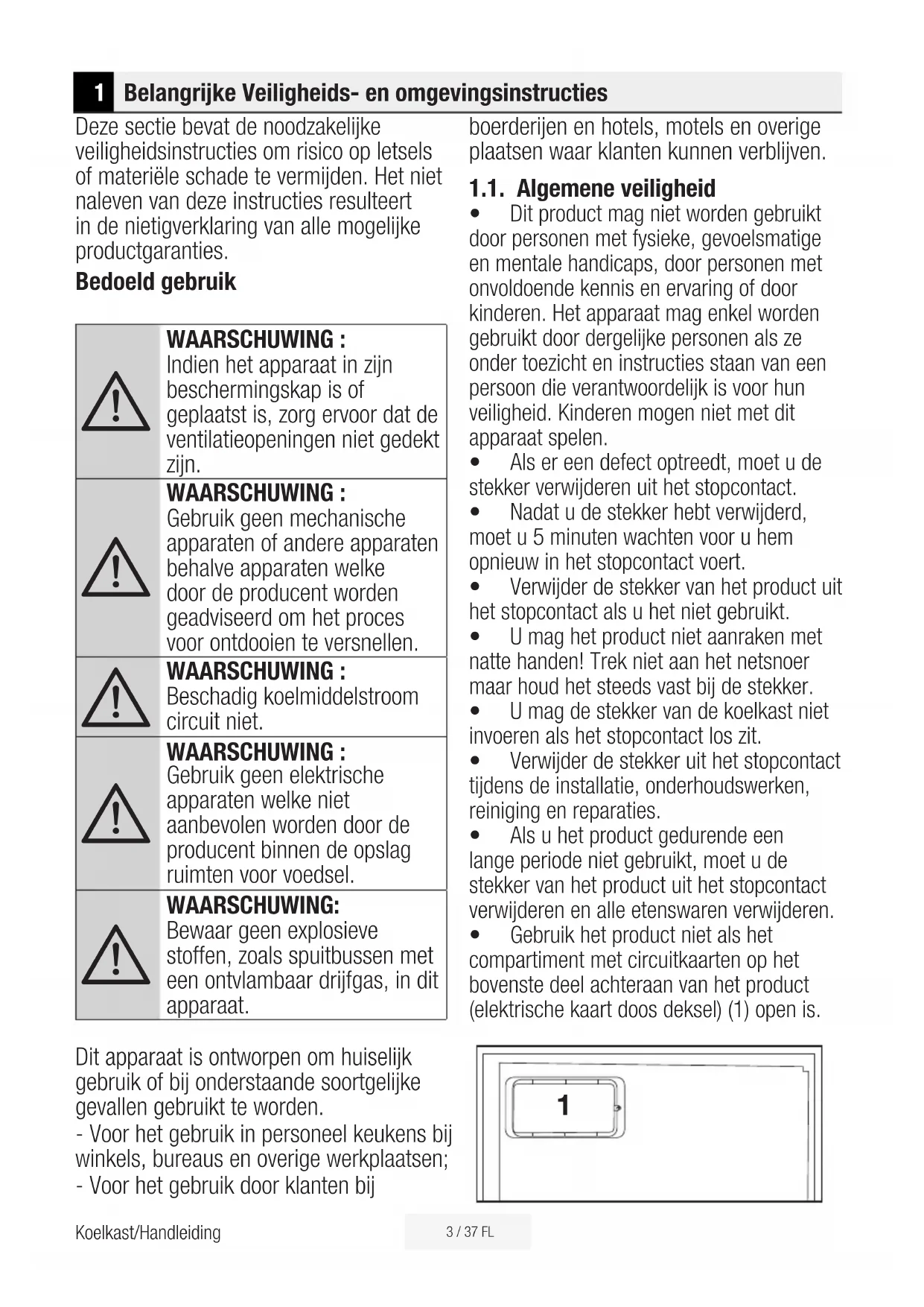 - Gebruik het product niet als het compartiment met circuitkaarten op het bovenste deel achteraan van het product (elektrische kaart doos deksel) (1) open is. 14 / 37 FL Koelkast/Handleiding Belangrijke Veiligheids- en omgevingsinstructies