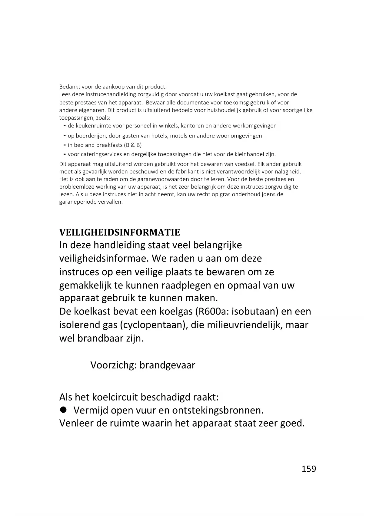 Bedankt voor de aankoop van dit product. Lees deze instructiehandleiding zorgvuldig door voordat u uw koelkast gaat gebruiken, voor de beste prestaties van het apparaat. Bewaar alle documentatie voor toekomstig gebruik of voor andere eigenaren. Dit product is uitsluitend bedoeld voor huishoudelijk gebruik of voor soortgelijke toepassingen, zoals: - de keukenruimte voor personeel in winkels, kantoren en andere werkomgevingen - op boerderijen, door gasten van hotels, motels en andere woonomgevingen - in bed and breakfasts (B & B) - voor cateringservices en dergelijke toepassingen die niet voor de kleinhandel zijn. Dit apparaat mag uitsluitend worden gebruikt voor het bewaren van voedsel. Elk ander gebruik moet als gevaarlijk worden beschouwd en de fabrikant is niet verantwoordelijk voor nalatigheid. Het is ook aan te raden om de garantievoorwaarden door te lezen. Voor de beste prestaties en probleemloze werking van uw apparaat, is het zeer belangrijk om deze instructies zorgvuldig te lezen. Als u deze instructies niet in acht neemt, kan uw recht op gratis onderhoud tijdens de garantieperiode vervallen. VEILIGHEIDSINFORMATIE In deze handleiding staat veel belangrijke veiligheidsinformatie. We raden u aan om deze instructies op een veilige plaats te bewaren om ze gemakkelijk te kunnen raadplegen en optimaal van uw apparaat gebruik te kunnen maken. De koelkast bevat een koelgas (R600a: isobutaan) en een isolerend gas (cyclopentaan), die milieuvriendelijk, maar wel brandbaar zijn. Voorzichtig: brandgevaar Als het koelcircuit beschadigd raakt: Vermijd open vuur en ontstekingsbronnen. Ventileer de ruimte waarin het apparaat staat zeer goed. Percentage bedrijfstijd:160 WAARSCHUWING! Wees bij het reinigen/verplaatsen van het apparaat voorzichtig om de metalen condensatordraden aan de achterkant van het apparaat niet aan te raken, omdat u daardoor uw vingers en handen kunt verwonden of uw product kunt beschadigen. Dit apparaat is niet ontworpen om op andere apparaten te stapelen. Probeer niet op uw apparaat te zitten of te staan, omdat het daar niet voor is ontworpen. U kunt uzelf verwonden of het apparaat beschadigen. Zorg ervoor dat het netsnoer niet beklemd zit onder het apparaat tijdens en na het vervoeren/verplaatsen van het apparaat, om te voorkomen dat het netsnoer doorgesneden of beschadigd raakt. Let bij het plaatsen van uw apparaat goed op om uw vloer, leidingen, wandbekleding enz. niet te beschadigen. Verplaats het apparaat niet door het aan het deksel of de handgreep te trekken. Laat kinderen niet met het apparaat spelen of aan de bedieningselementen komen. Ons bedrijf wijst alle aansprakelijkheid van de hand als de instructies niet worden gevolgd. Installeer het apparaat niet in vochtige, olieachtige of stoffige plaatsen en stel het niet bloot aan direct zonlicht of water.161 Installeer het apparaat niet in de buurt van verwarmingsapparaten of ontvlambare materialen. Open het deksel niet als er een stroomstoring is. Als de storing korter dan 20 uur duurt, zou deze geen effect moeten hebben op bevroren voedsel. Als de storing langer duurt, moet het voedsel worden gecontroleerd en onmiddellijk worden geconsumeerd of bereid en daarna opnieuw ingevroren. Maakt u zich geen zorgen als het deksel van de diepvrieskist moeilijk te openen is meteen nadat u het heeft gesloten. Dit komt door het drukverschil, dat gewoonlijk na enkele minuten verdwijnt waardoor het deksel gewoon kan worden geopend. Sluit het apparaat niet aan op de elektriciteitsvoorziening voordat alle verpakkingen en transportbeschermers zijn verwijderd. Laat het apparaat minstens 4 uur staan voordat u het aanzet, om de compressorolie te laten stabiliseren na horizontaal transport. Deze vriezer mag alleen worden gebruikt voor het beoogde doel (d.w.z. het bewaren en invriezen van eetbare voedingsmiddelen). Bewaar geen medicijnen of onderzoeksmaterialen in de wijnkoelers. Als er materiaal moet worden opgeslagen waarvoor een strenge controle van de162 opslagtemperatuur vereist is, kan dit bederven of kan er een ongecontroleerde reactie optreden die risico's kan veroorzaken. Haal de stekker uit het stopcontact voordat u handelingen uitvoert. Controleer bij levering of het product niet beschadigd is en of alle onderdelen en accessoires in perfecte staat zijn. Als in het koelsysteem een lek opgemerkt wordt, raak dan de wandcontactdoos niet aan en gebruik geen open vlammen. Open het venster en laat lucht de kamer binnenkomen. Bel vervolgens een servicecentrum en vraag om reparatie. Gebruik geen verlengsnoeren of adapters. Trek niet te hard aan het netsnoer, vouw het niet dubbel en raak de stekker niet met natte handen aan. Beschadig de stekker en/of het netsnoer niet; dit kan elektrische schokken of brand veroorzaken. Plaats geen brandbare en sterk vluchtige materialen zoals ether, benzine, LPG, propaangas, spuitbussen, lijm, pure alcohol, enz. op of in het apparaat. Deze materialen kunnen een explosie veroorzaken. Als het netsnoer van het apparaat is beschadigd, moet het worden vervangen door de fabrikant, diens technische dienst of personen met vergelijkbare kwalificaties, om gevaarlijke situaties163 te voorkomen. Gebruik of bewaar geen ontvlambare sprays, zoals verfbussen in de buurt van de wijnkoelers. Deze kunnen een explosie of brand veroorzaken. Plaats geen voorwerpen en/of houders gevuld met water bovenop het apparaat. We raden het gebruik van verlengsnoeren en multi-adapters niet aan. Verbrand het apparaat niet als u het weg wilt doen. Wees voorzichtig dat u het koelcircuit/de koelleidingen van het apparaat niet beschadigt tijdens het transport en het gebruik. Stel in het geval van schade het apparaat niet bloot aan brand, mogelijke ontstekingsbronnen en ventileer onmiddellijk de ruimte waarin het apparaat staat. Het koelsysteem dat zich achter en binnenin de wijnkoelers bevindt, bevat een koelmiddel. Zorg er daarom voor dat de buizen niet beschadigd raken. Gebruik geen elektrische apparaten in de bewaarruimten voor levensmidde
