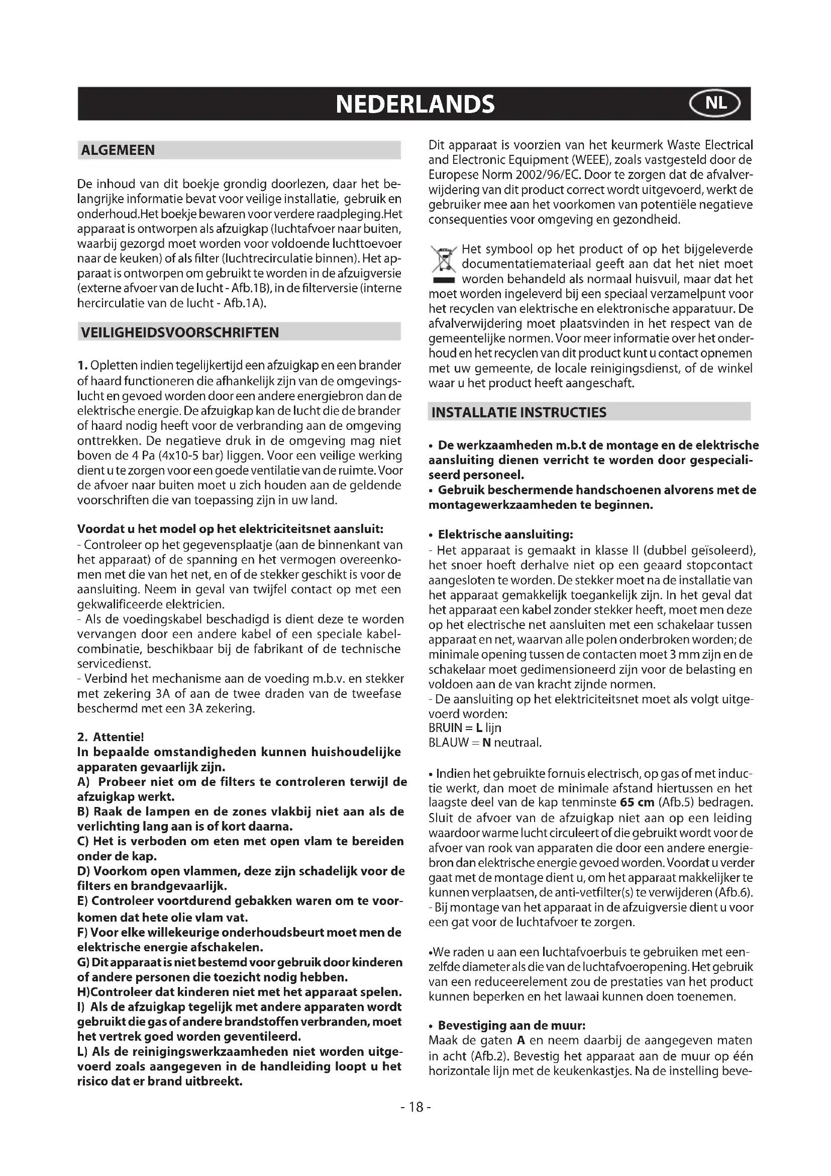 gebruikt die gas of andere brandstoffen verbranden, moet het vertrek goed worden geventileerd. L) Als de reinigingswerkzaamheden niet worden uitge- voerd zoals aangegeven in de handleiding loopt u het risico dat er brand uitbreekt. Dit apparaat is voorzien van het keurmerk Waste Electrical and Electronic Equipment (WEEE), zoals vastgesteld door de Europese Norm 2002/96/EC. Door te zorgen dat de afvalver- wijdering van dit product correct wordt uitgevoerd, werkt de gebruiker mee aan het voorkomen van potentiële negatieve consequenties voor omgeving en gezondheid. Het symbool op het product of op het bijgeleverde documentatiemateriaal geeft aan dat het niet moet worden behandeld als normaal huisvuil, maar dat het moet worden ingeleverd bij een speciaal verzamelpunt voor het recyclen van elektrische en elektronische apparatuur. De afvalverwijdering moet plaatsvinden in het respect van de gemeentelijke normen. Voor meer informatie over het onder- houd en het recyclen van dit product kunt u contact opnemen met uw gemeente, de locale reinigingsdienst, of de winkel waar u het product heeft aangeschaft. INSTALLATIE INSTRUCTIES