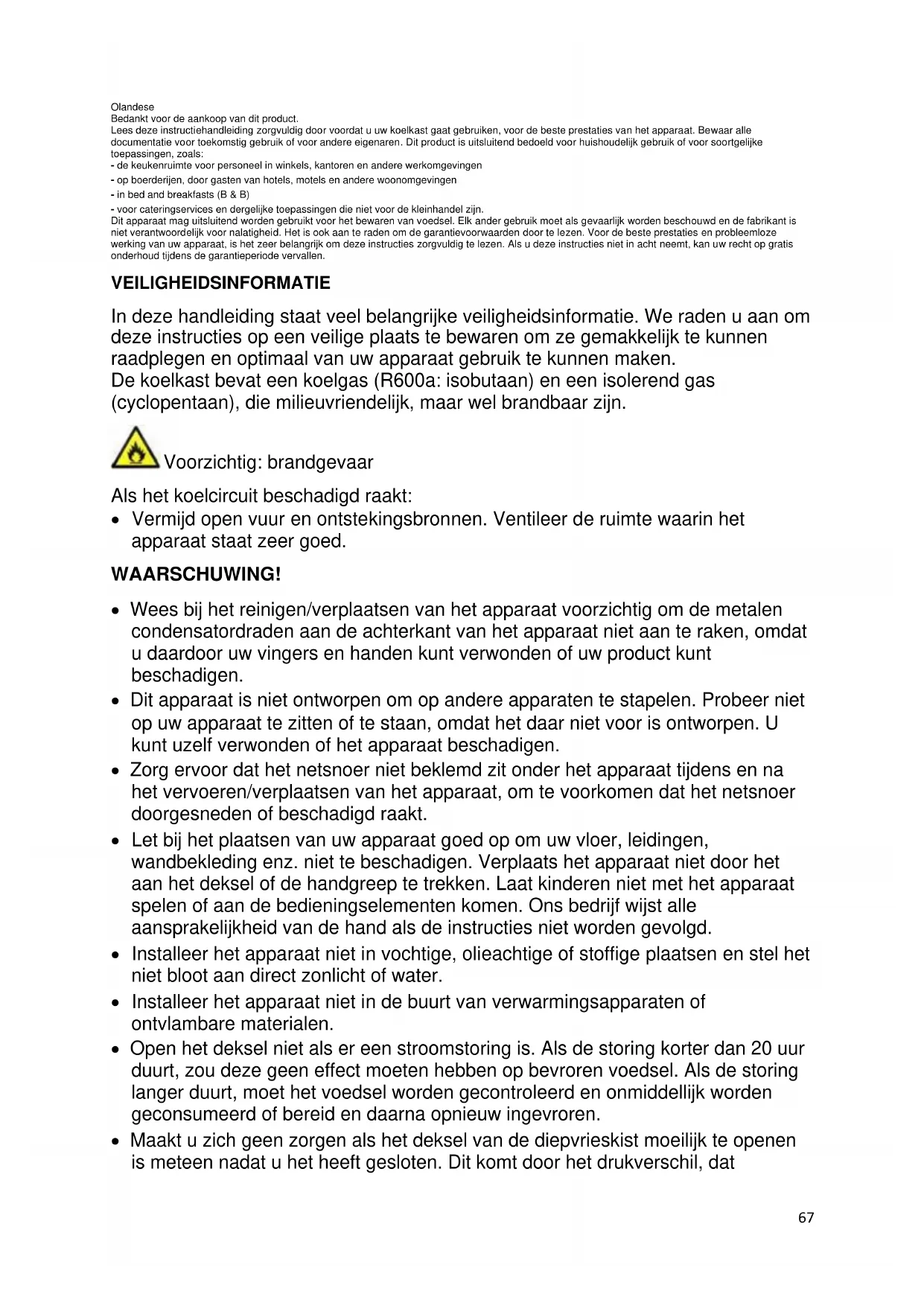 - VERWIJDEREN Olandese Bedankt voor de aankoop van dit product. Lees deze instructiehandleiding zorgvuldig door voordat u uw koelkast gaat gebruiken, voor de beste prestaties van het apparaat. Bewaar alle documentatie voor toekomstig gebruik of voor andere eigenaren. Dit product is uitsluitend bedoeld voor huishoudelijk gebruik of voor soortgelijke toepassingen, zoals: - de keukenruimte voor personeel in winkels, kantoren en andere werkomgevingen - op boerderijen, door gasten van hotels, motels en andere woonomgevingen - in bed and breakfasts (B & B) - voor cateringservices en dergelijke toepassingen die niet voor de kleinhandel zijn. Dit apparaat mag uitsluitend worden gebruikt voor het bewaren van voedsel. Elk ander gebruik moet als gevaarlijk worden beschouwd en de fabrikant is niet verantwoordelijk voor nalatigheid. Het is ook aan te raden om de garantievoorwaarden door te lezen. Voor de beste prestaties en probleemloze werking van uw apparaat, is het zeer belangrijk om deze instructies zorgvuldig te lezen. Als u deze instructies niet in acht neemt, kan uw recht op gratis onderhoud tijdens de garantieperiode vervallen. VEILIGHEIDSINFORMATIE In deze handleiding staat veel belangrijke veiligheidsinformatie. We raden u aan om deze instructies op een veilige plaats te bewaren om ze gemakkelijk te kunnen raadplegen en optimaal van uw apparaat gebruik te kunnen maken. De koelkast bevat een koelgas (R600a: isobutaan) en een isolerend gas (cyclopentaan), die milieuvriendelijk, maar wel brandbaar zijn. Voorzichtig: brandgevaar Als het koelcircuit beschadigd raakt: p. 7567